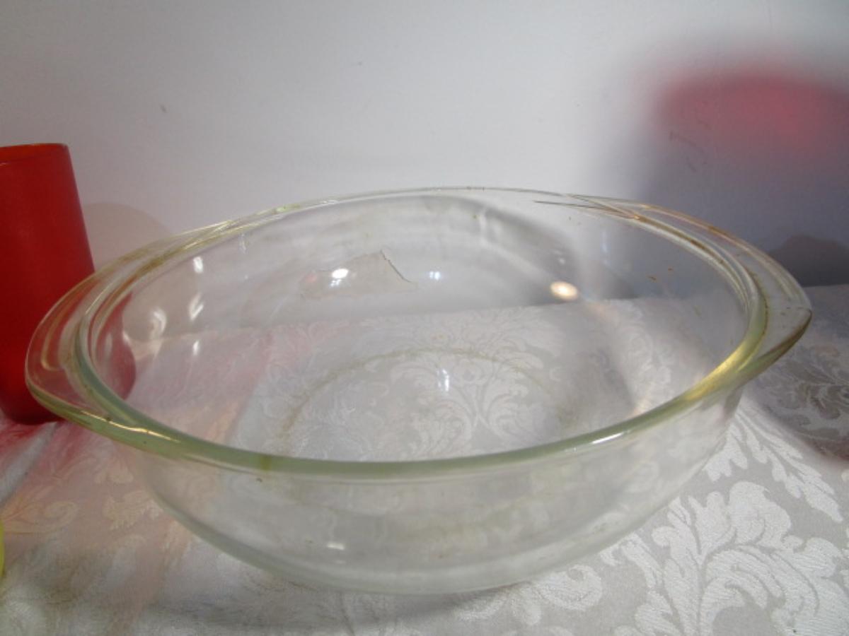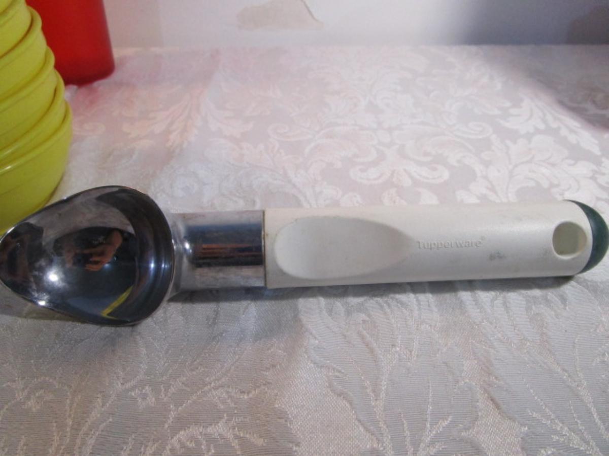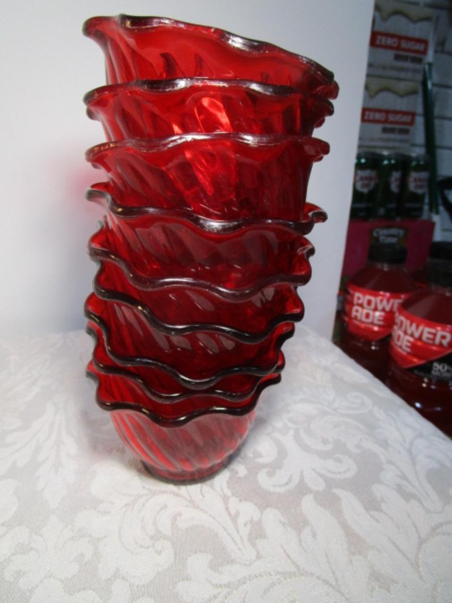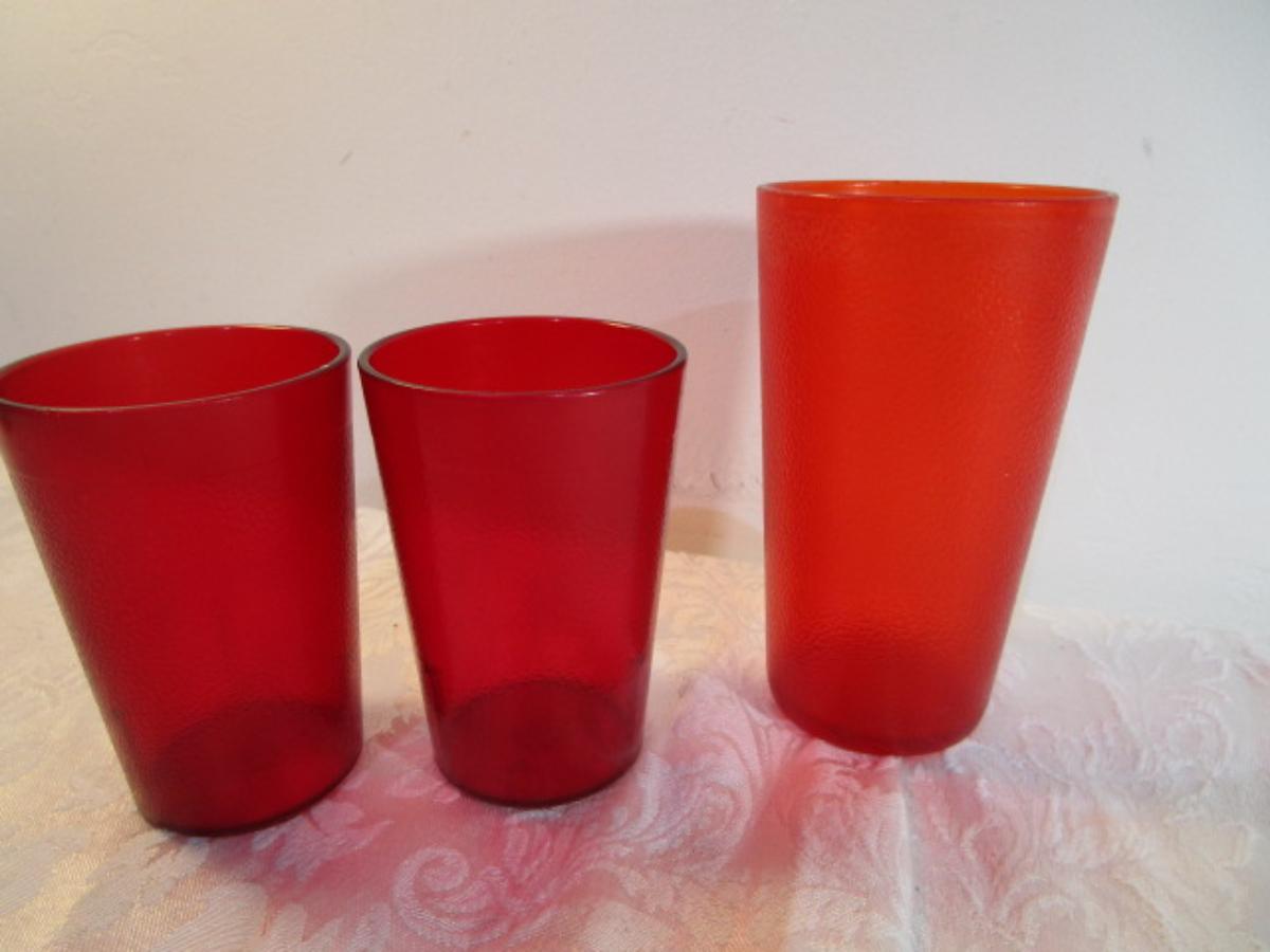 1 Pyrex 3 qt.bowl, 6 mini bowls, 9 red sundae dishes, 3 cups, 3 tumblers, 1 ice cream scoop, see pictures