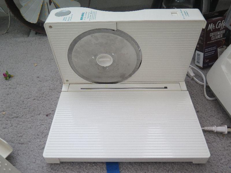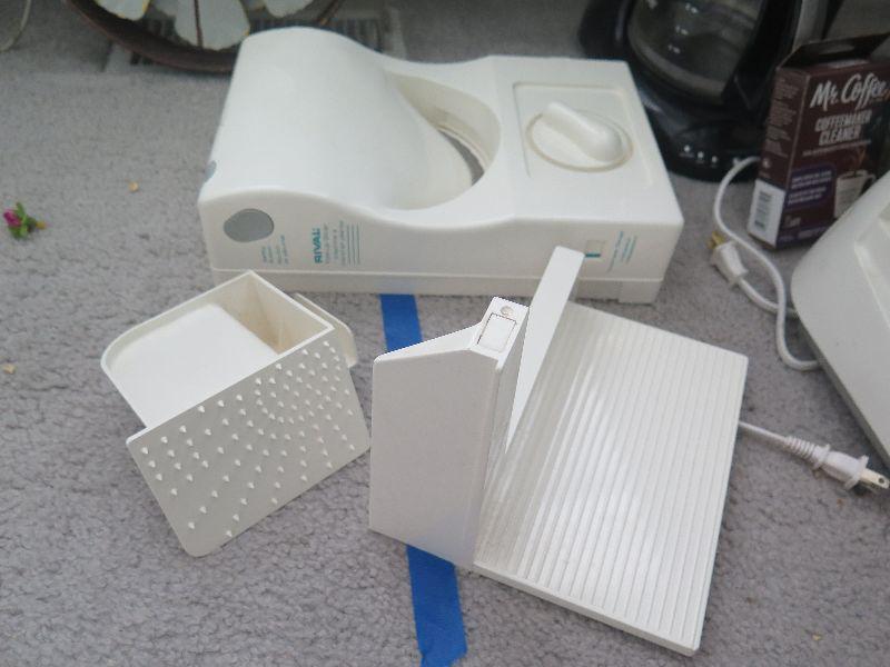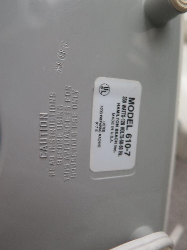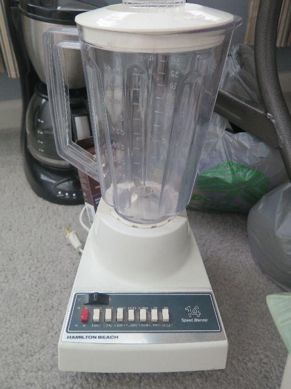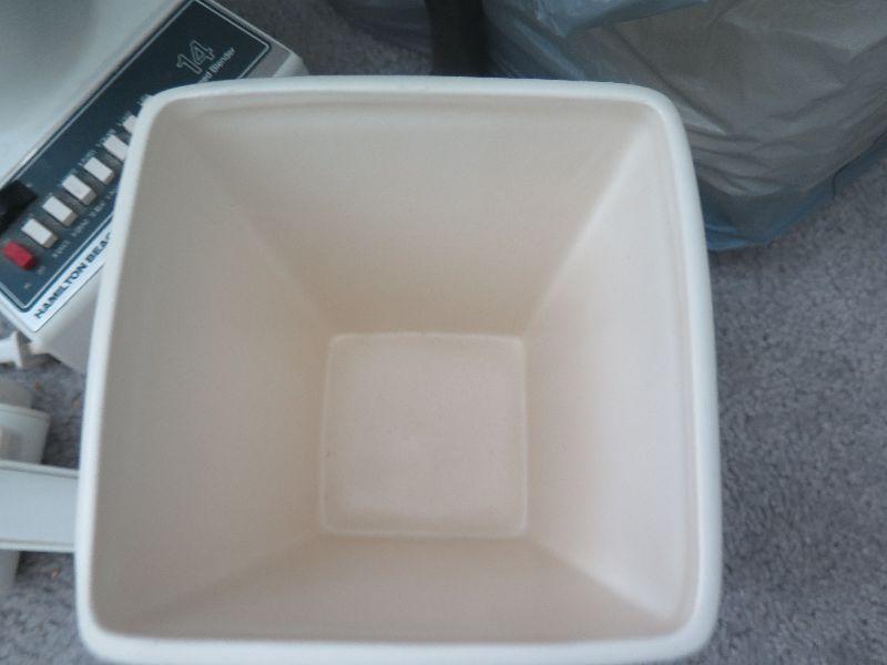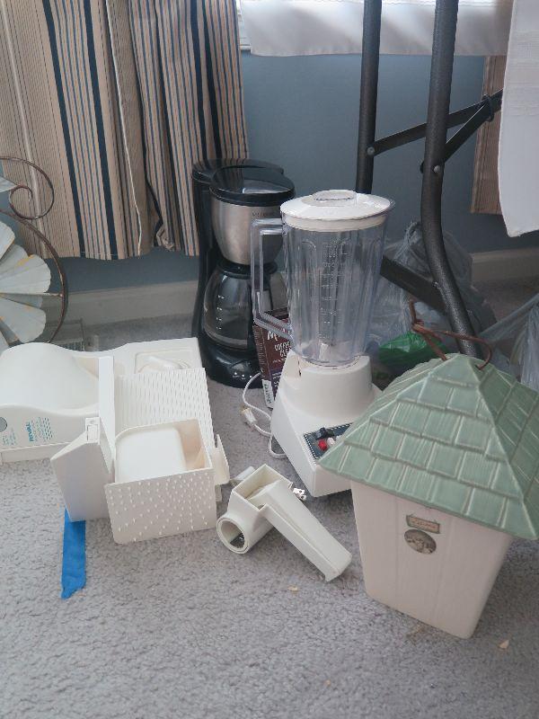 Hamilton Beach blender, Mr Coffee, Rival slicer, all untested, and a Pfaltzgraff canister. Also includes plastic storage ware. Bring box to move. **Please read Terms and Conditions before placing a bid. Pick up is Wednesday July 31st, from 2 pm to 7pm in Sicklerville. All sales are final. All sales are as is, where is. Please review all photos. Any props included in photos are not included in listing. All measurements are approximate.
