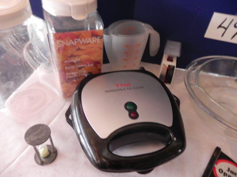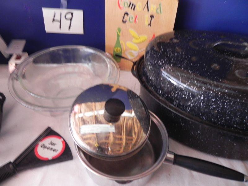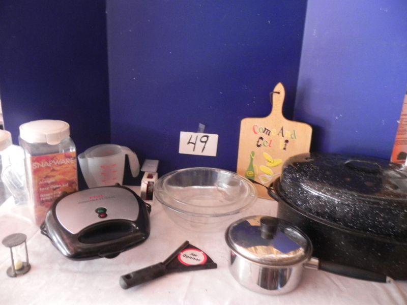 WOOD CUTTING BOARD- GLASS MIXING BOWLS-JAR LID OPENER-LARGE ROASTING PAN WITH LID-FOOD SCALE-T FAL ELECTRIC CRAPE MAKER-AND MORE