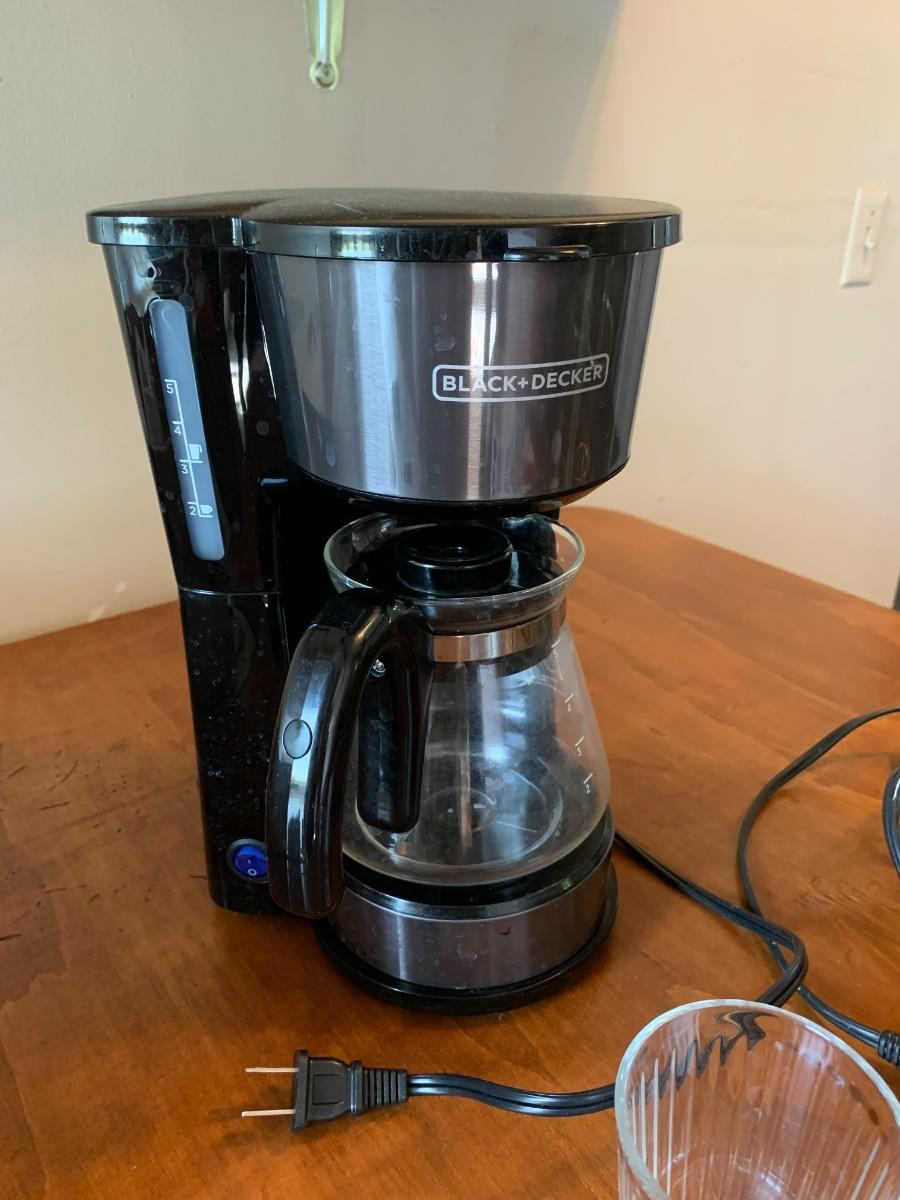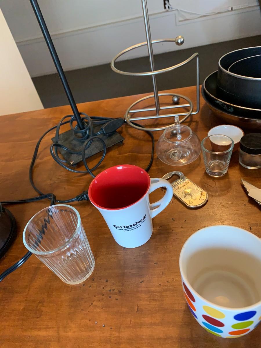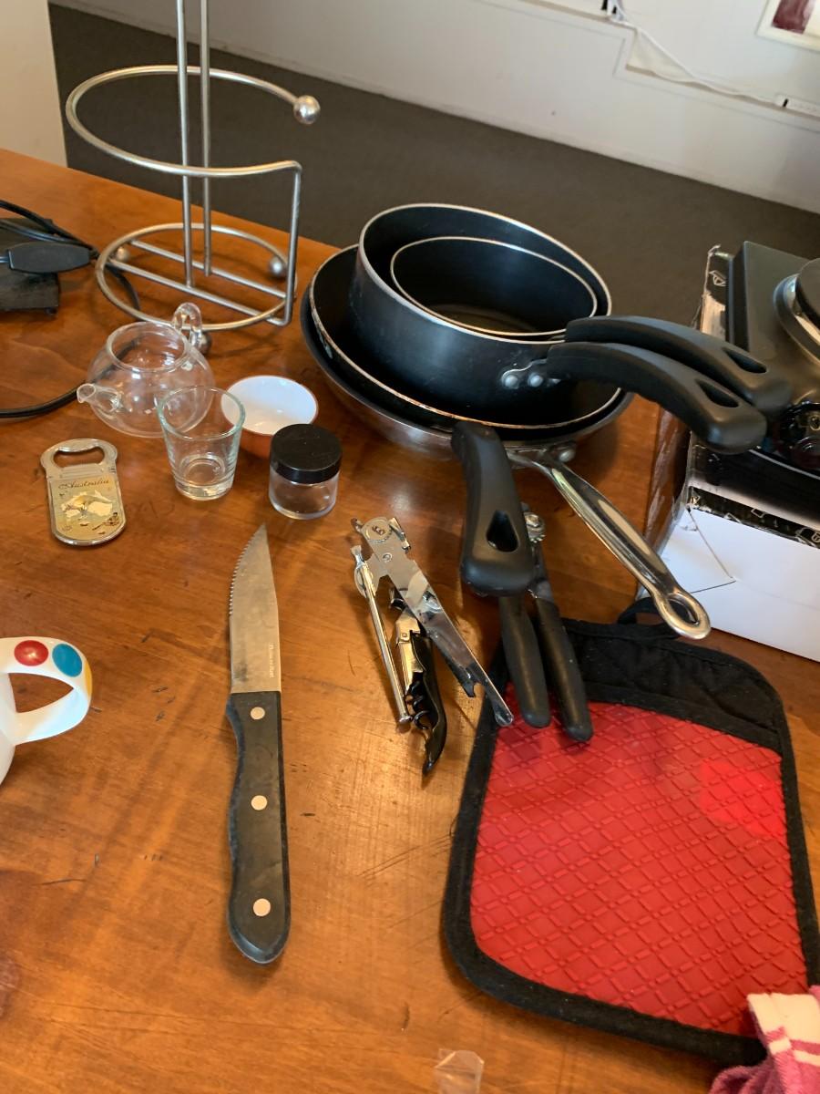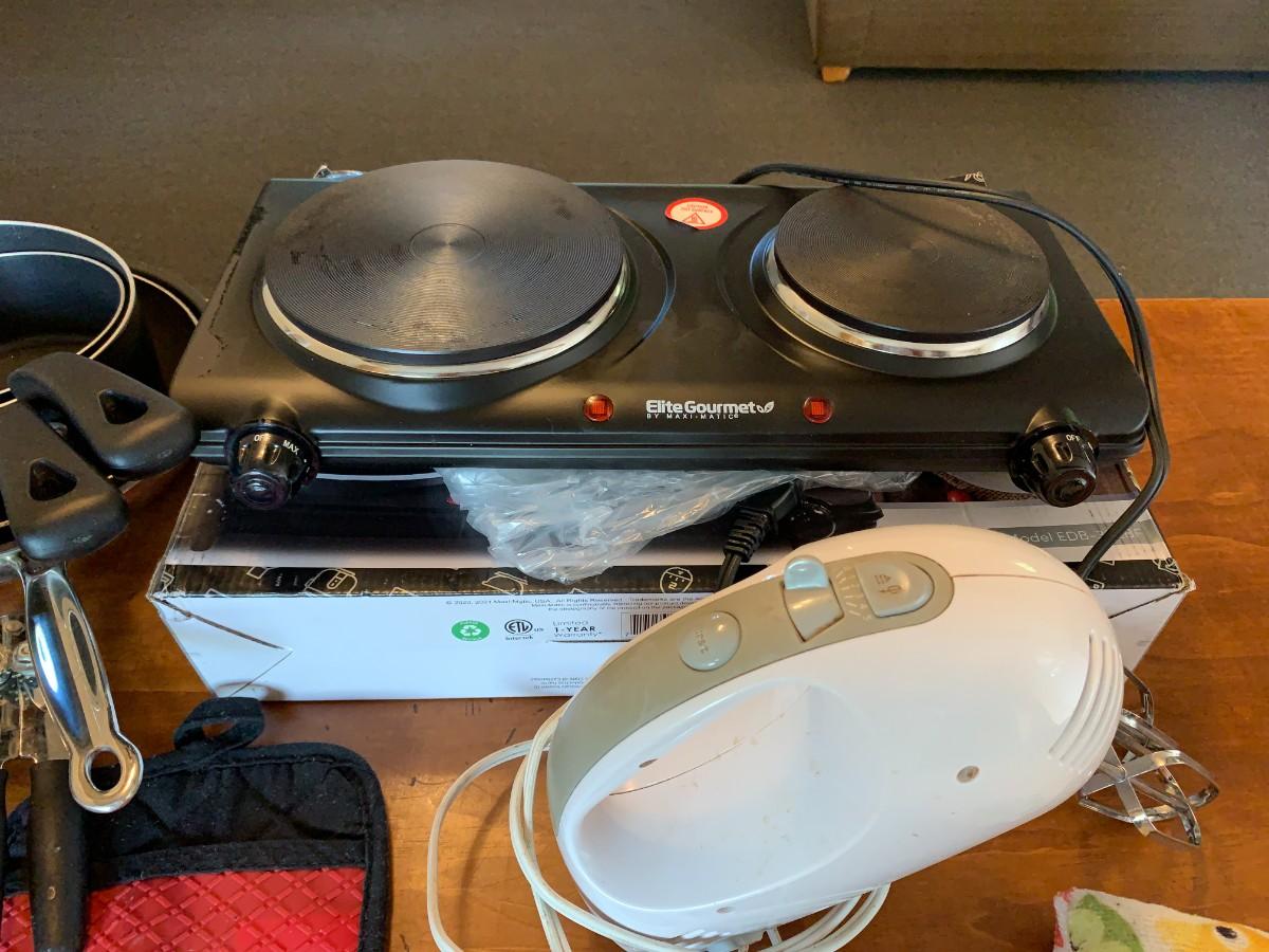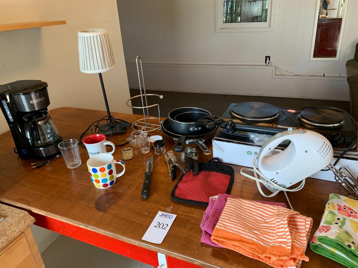Assorted items including 5-cup coffee maker, small lamp, paper towel holder, non-stick pans, can operners, hand mixer, electric cooktop. None tested.