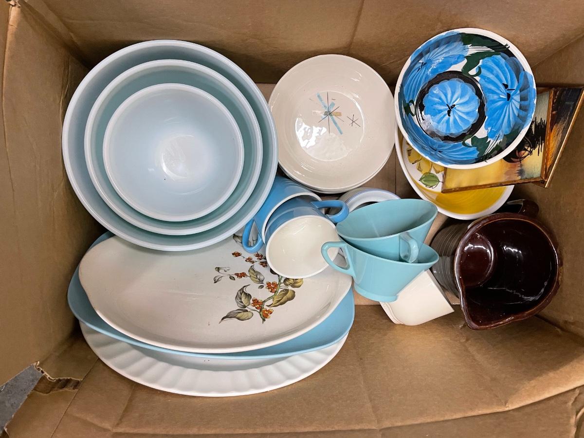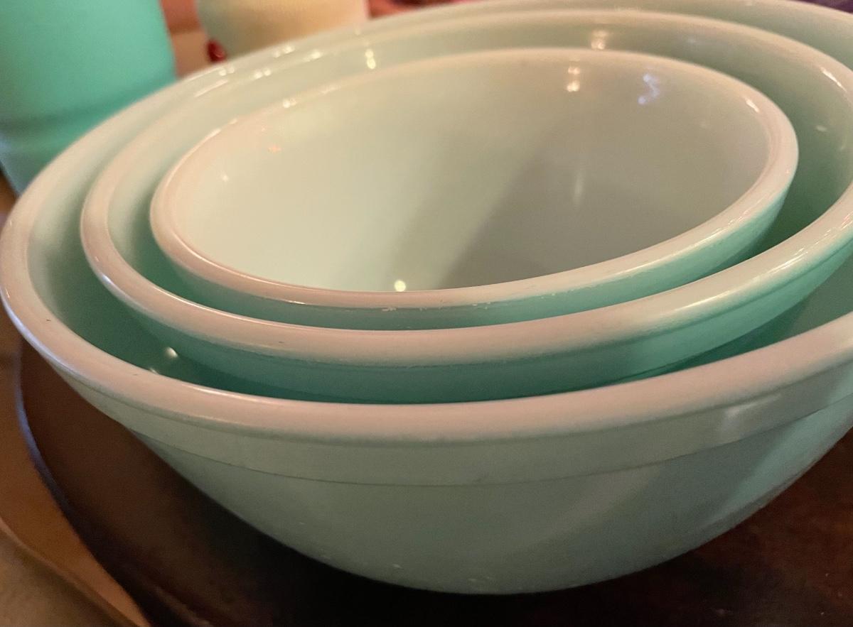 Vintage Set of Pyrex blue nesting bowls, vintage coffee cups and bowls.