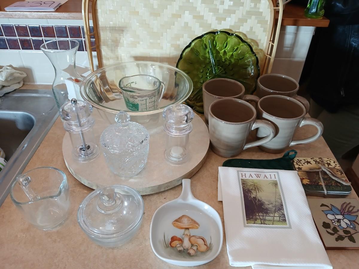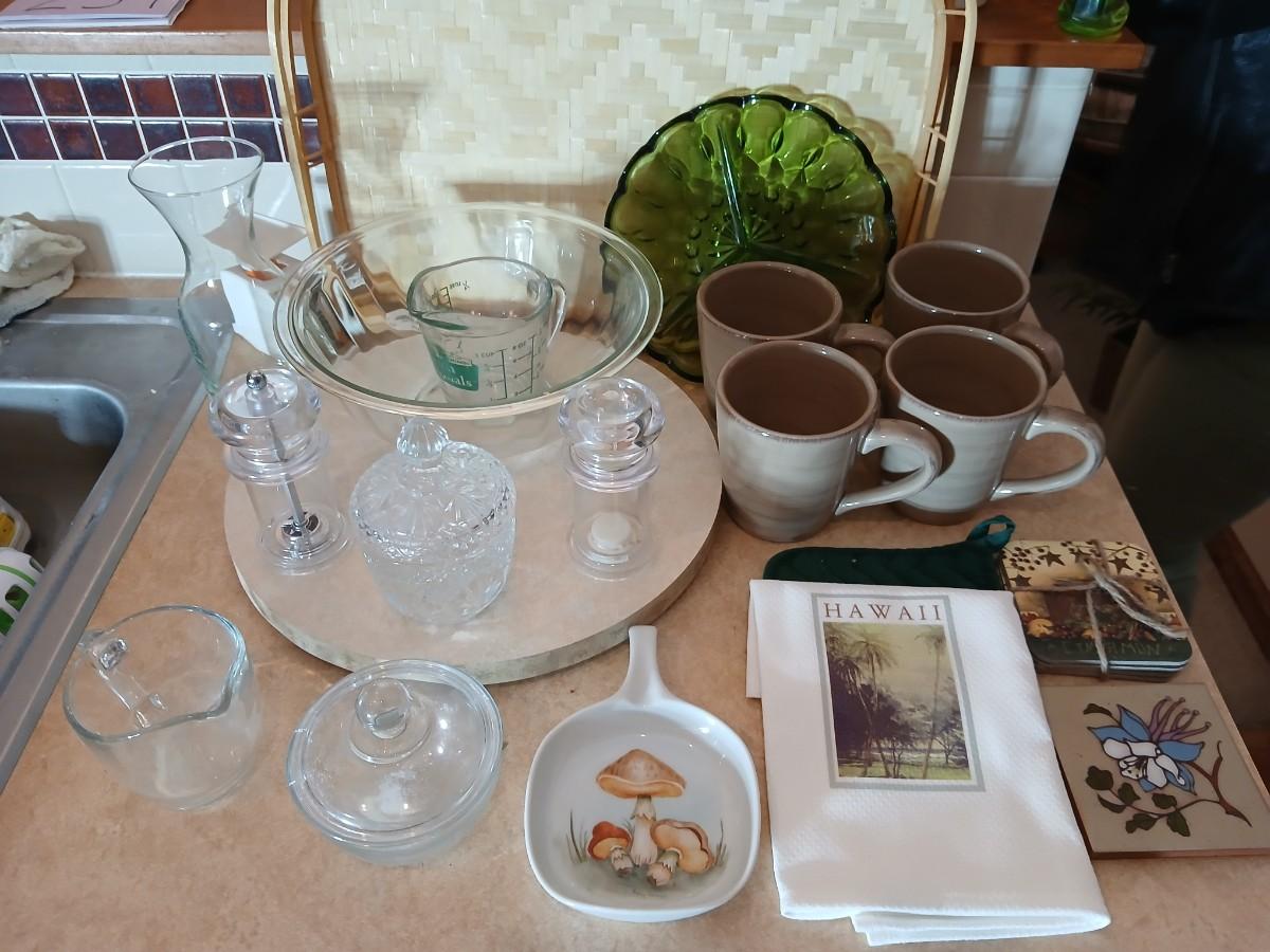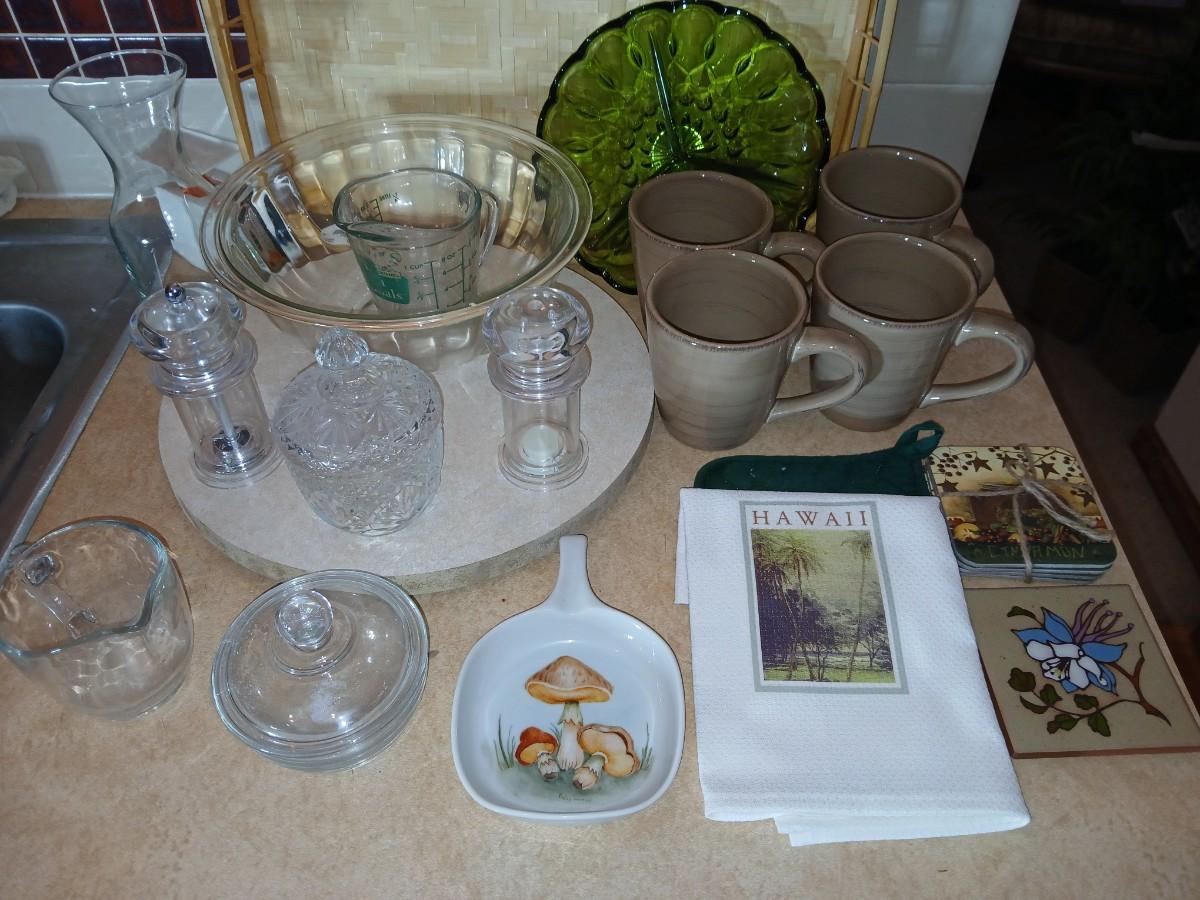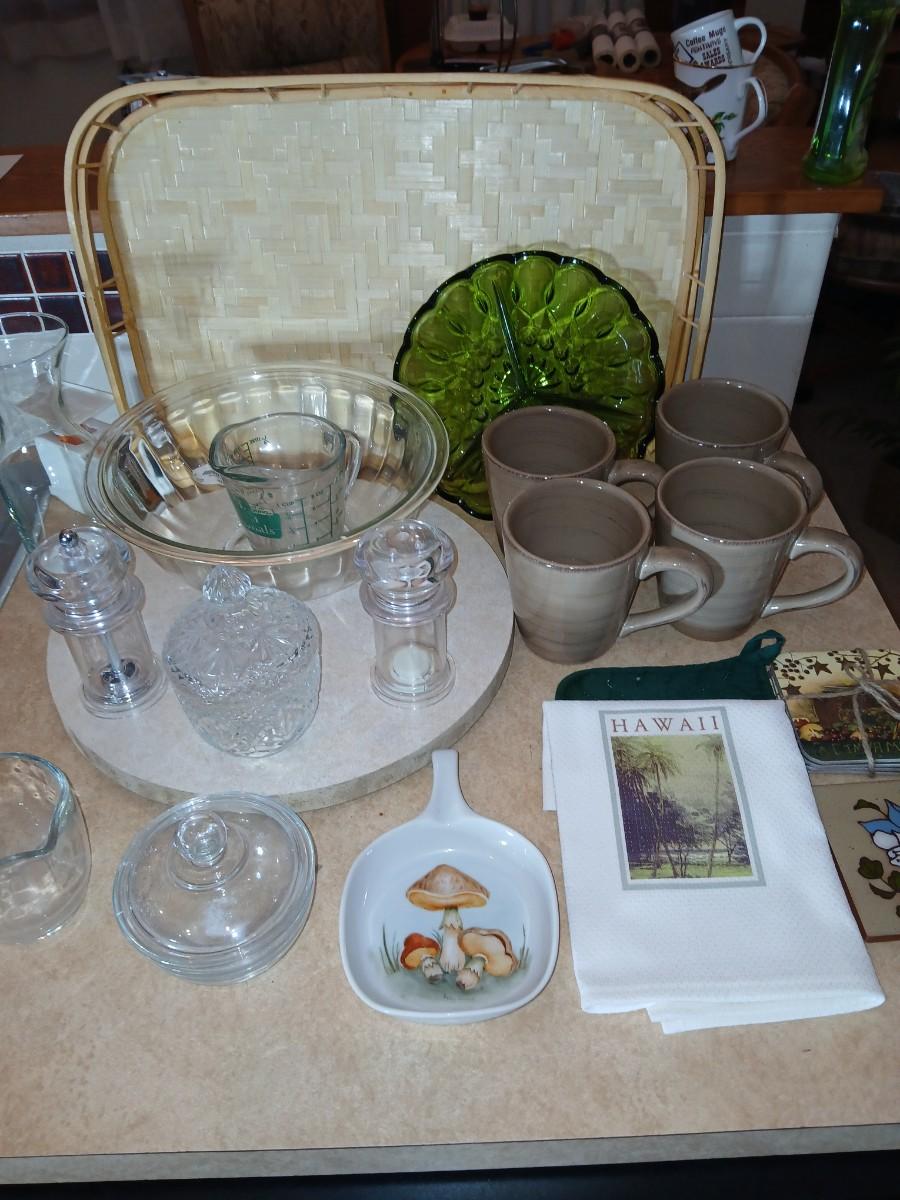 Kitchen items of all kinds, glassware, mugs, trays, towel, spoon rest and more