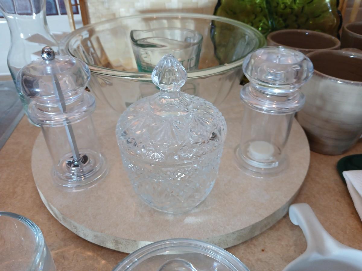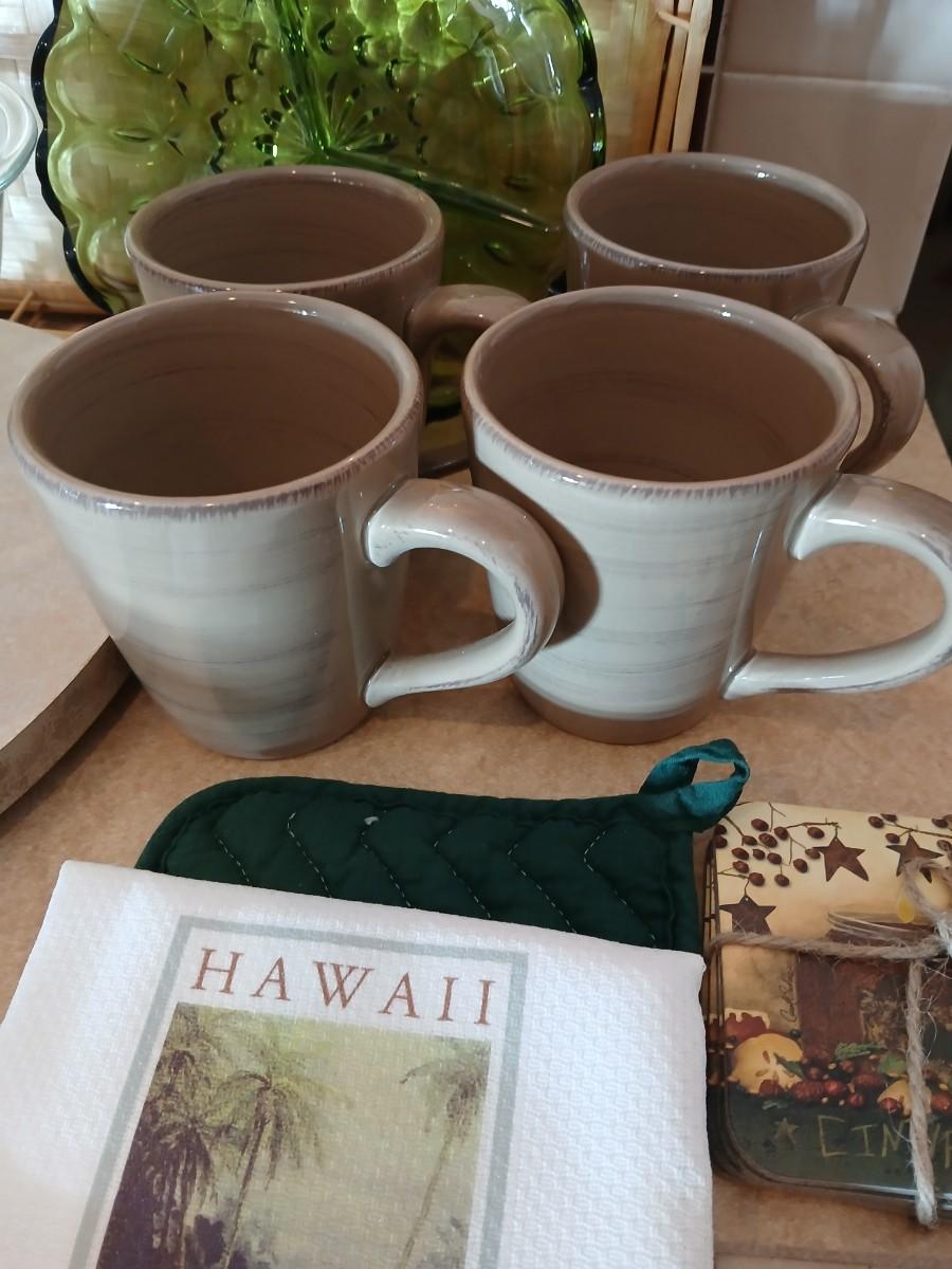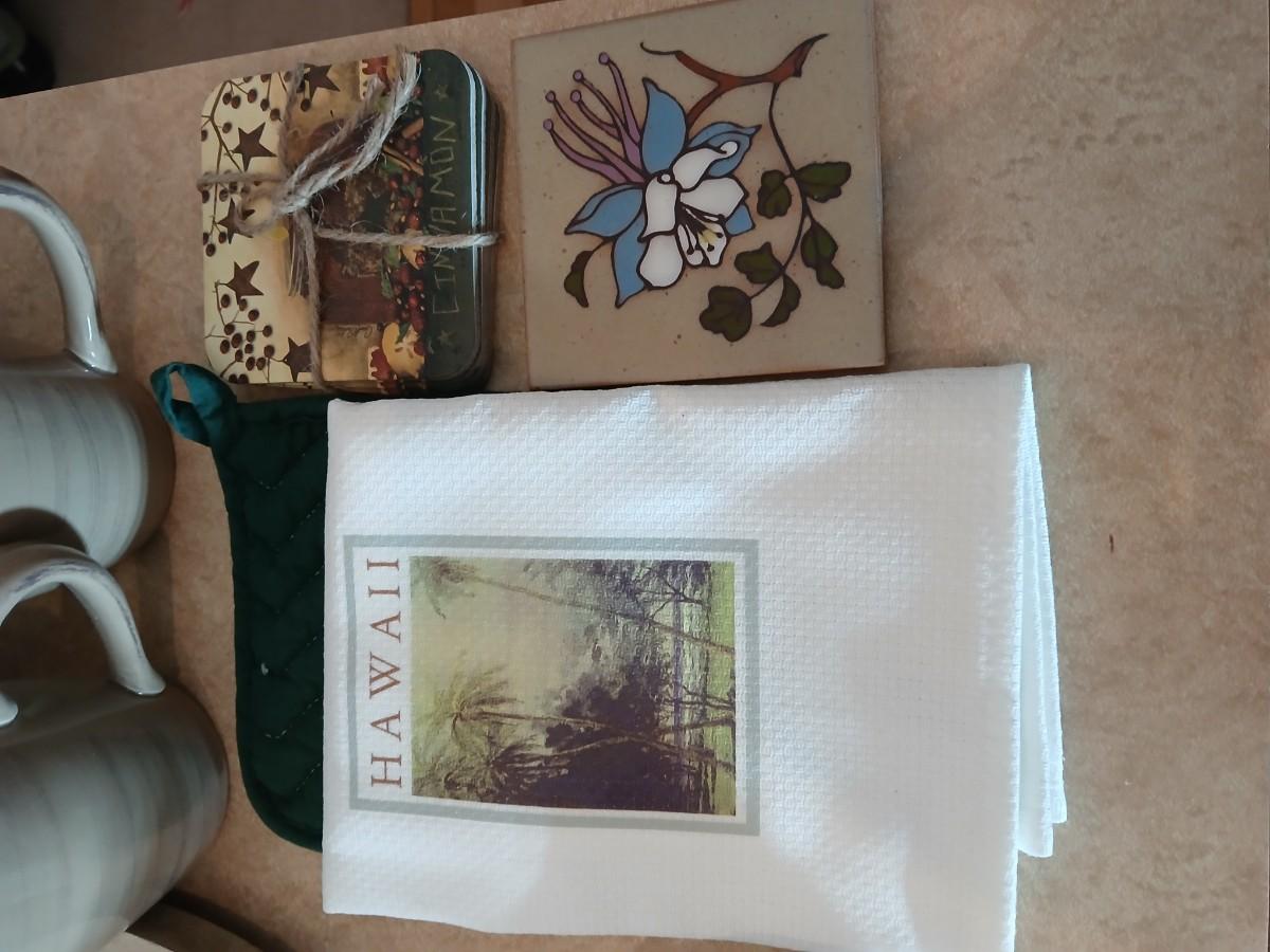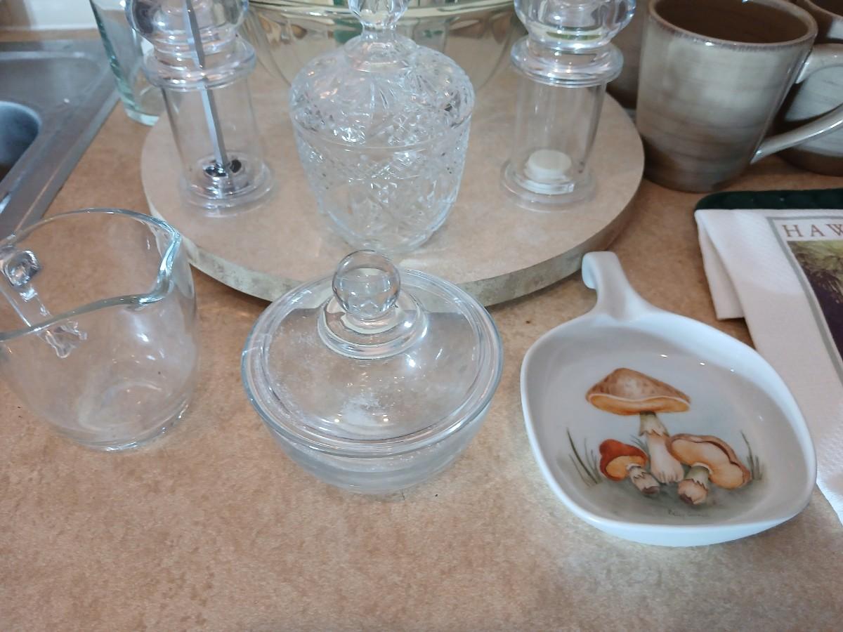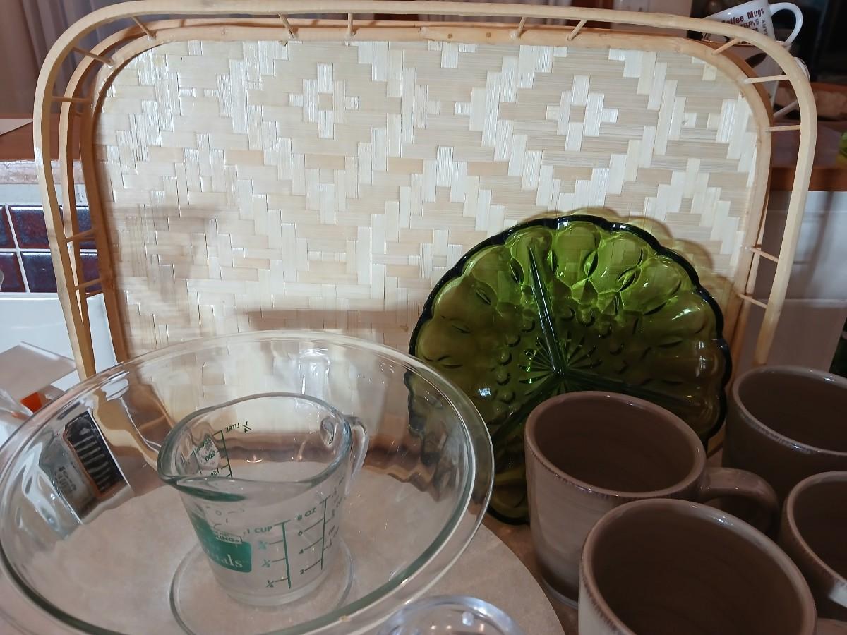 Kitchen items of all kinds, glassware, mugs, trays, towel, spoon rest and more