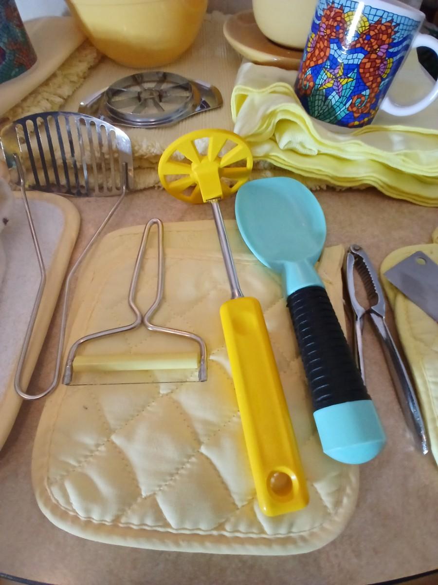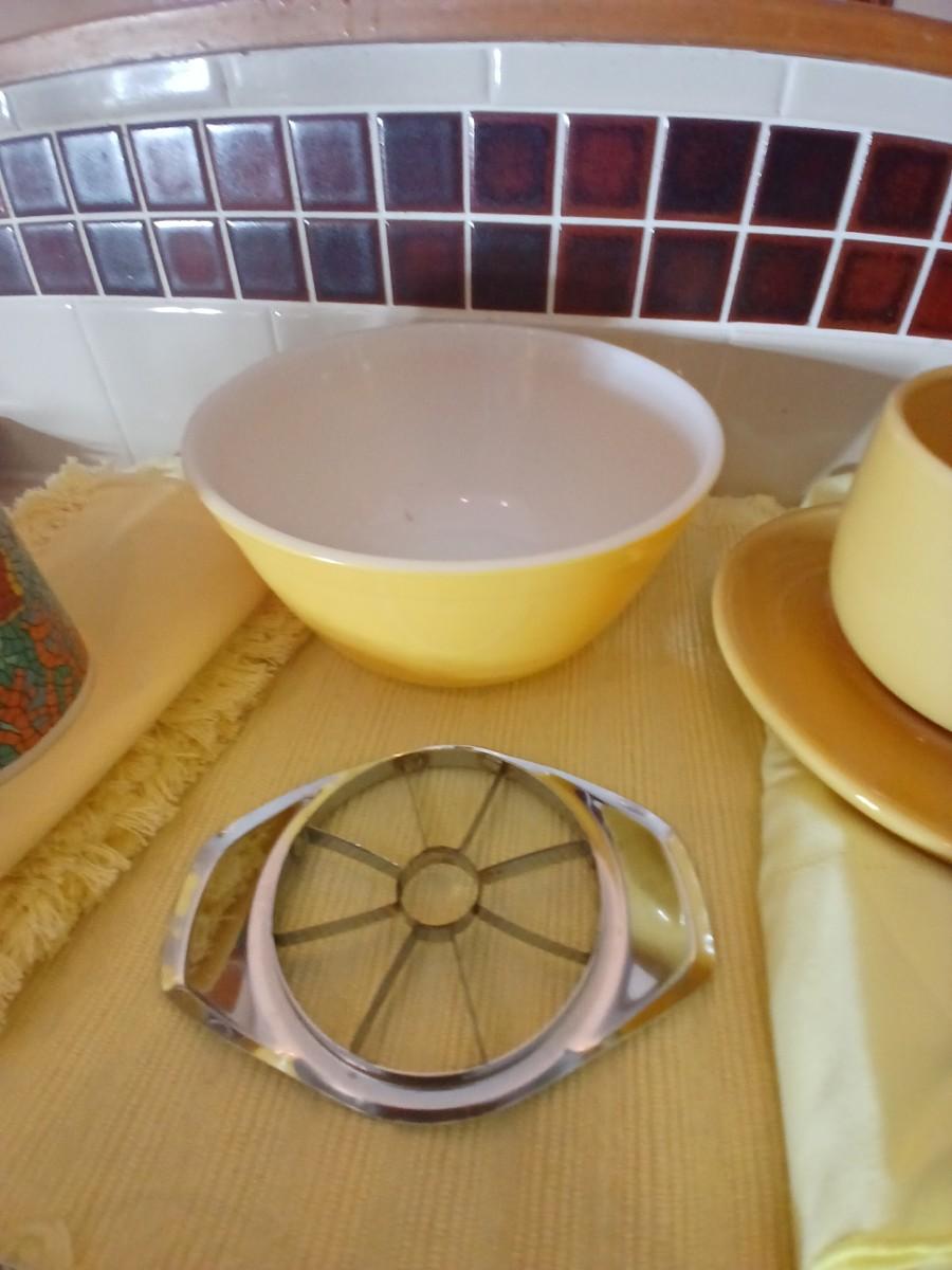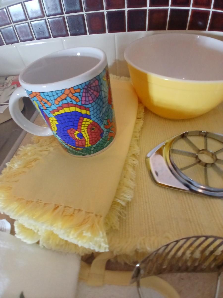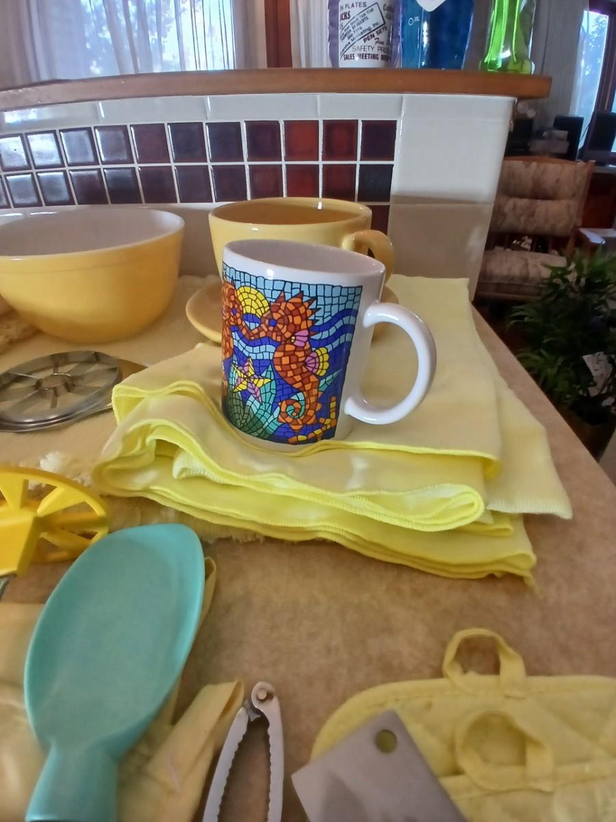 Yellow colored Kitchen items - placemats, small Pyrex mixing bowl, mug, napkins and more