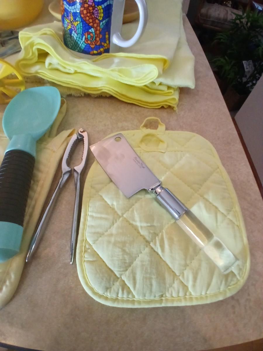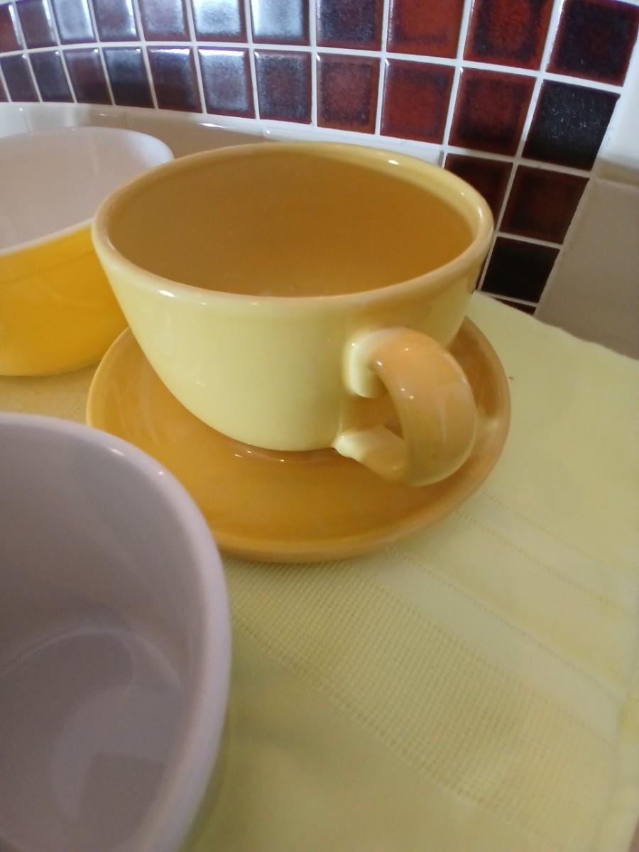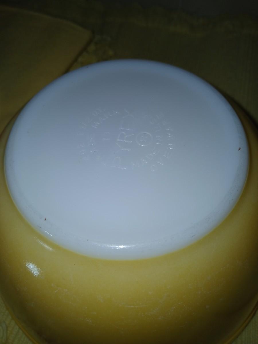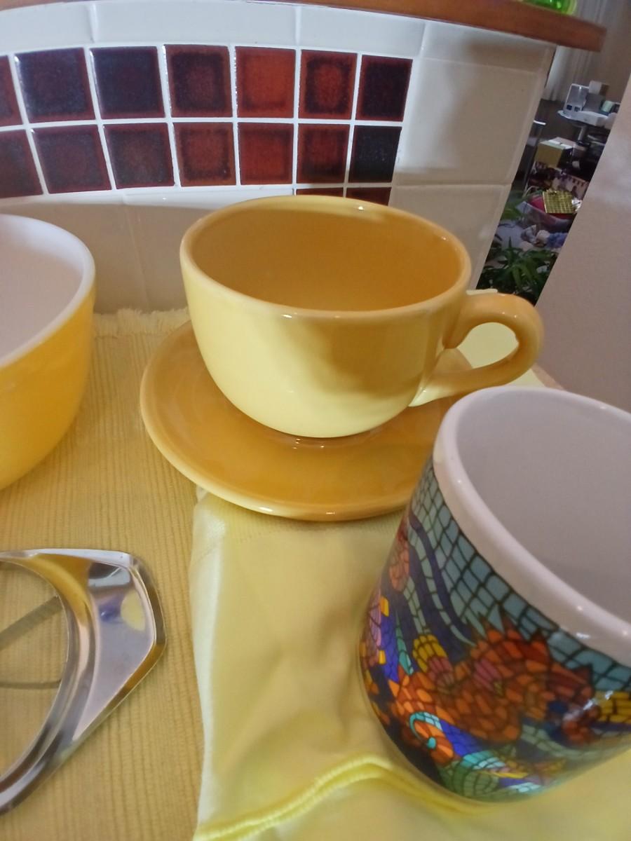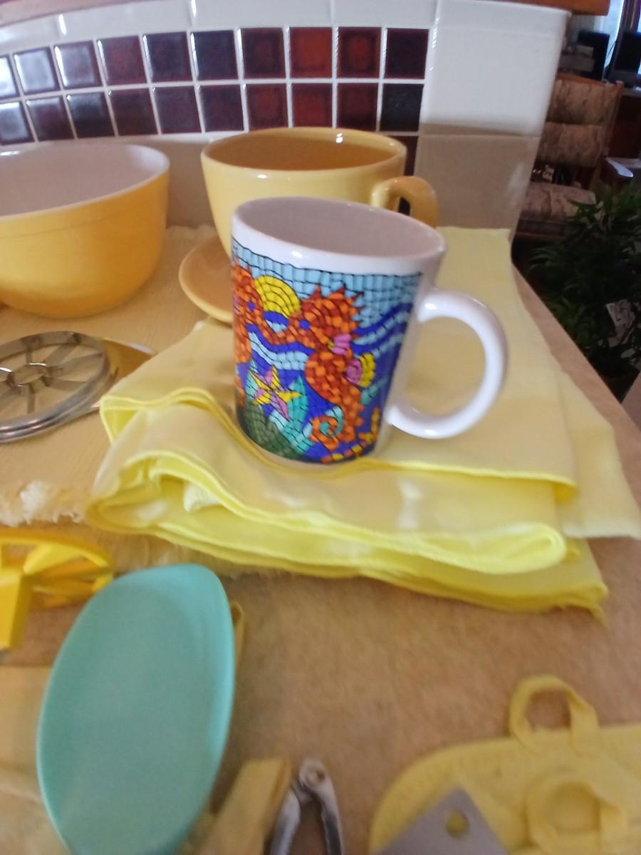 Yellow colored Kitchen items - placemats, small Pyrex mixing bowl, mug, napkins and more