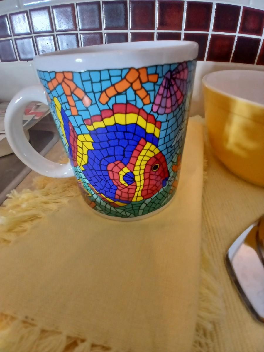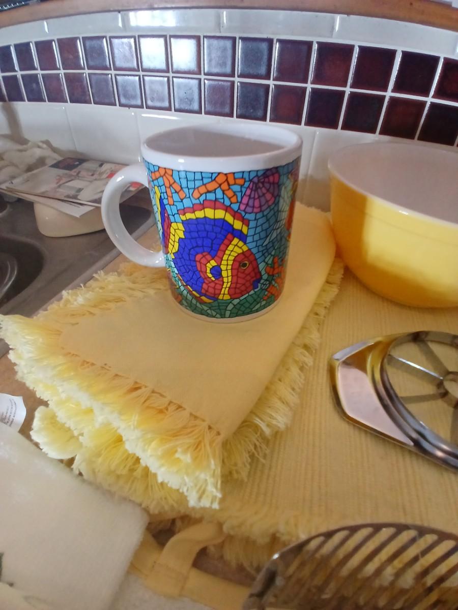 Kitchen items - placemats, small Pyrex mixing bowl, mug, napkins, kitchen towels, and more
