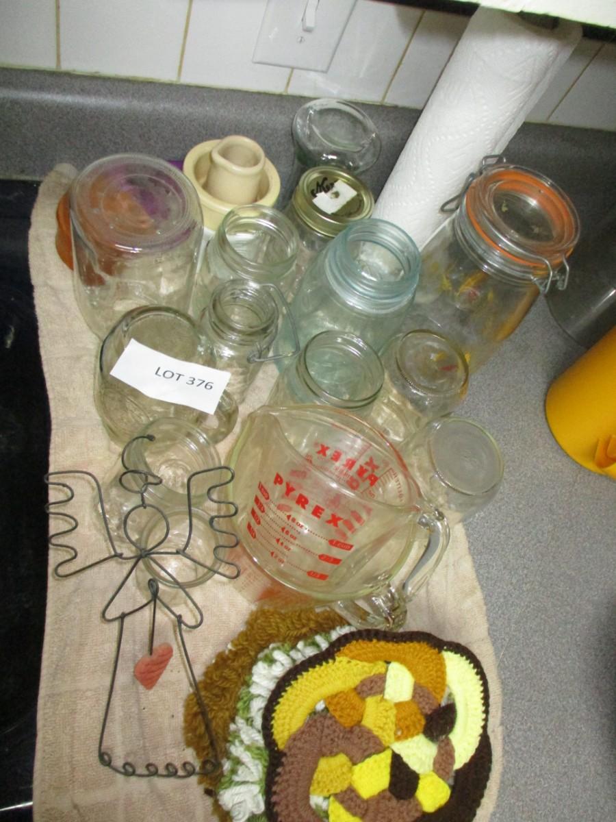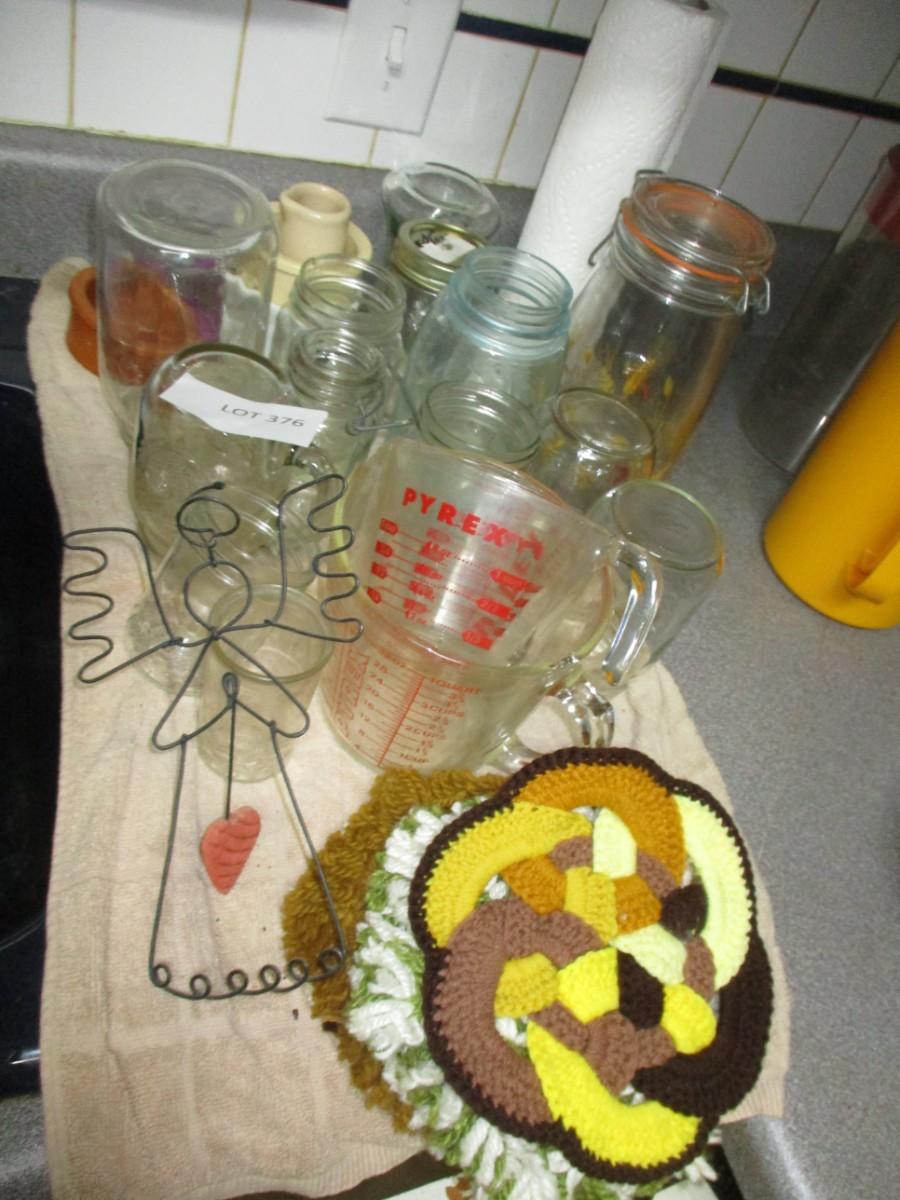 Crocheted pot holders good condition. Jelly/mason jars. Pyrex measuring cups