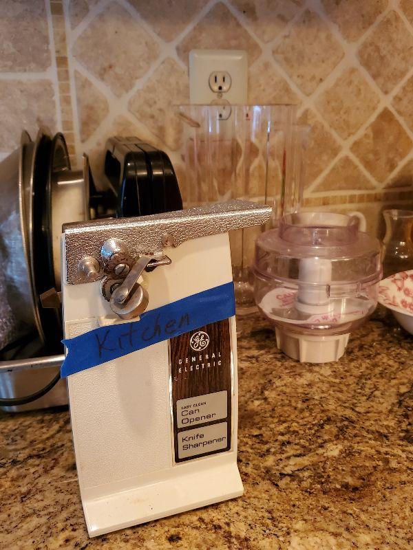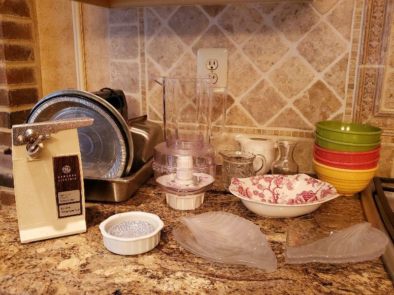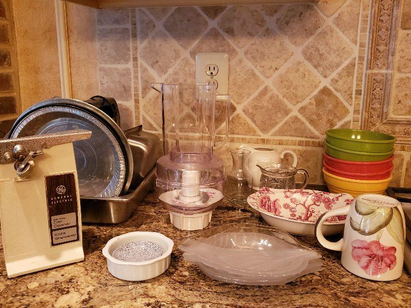 Bakeware, bowls, can opener, Johnson Bros. bowlm and more. Bring box to move.