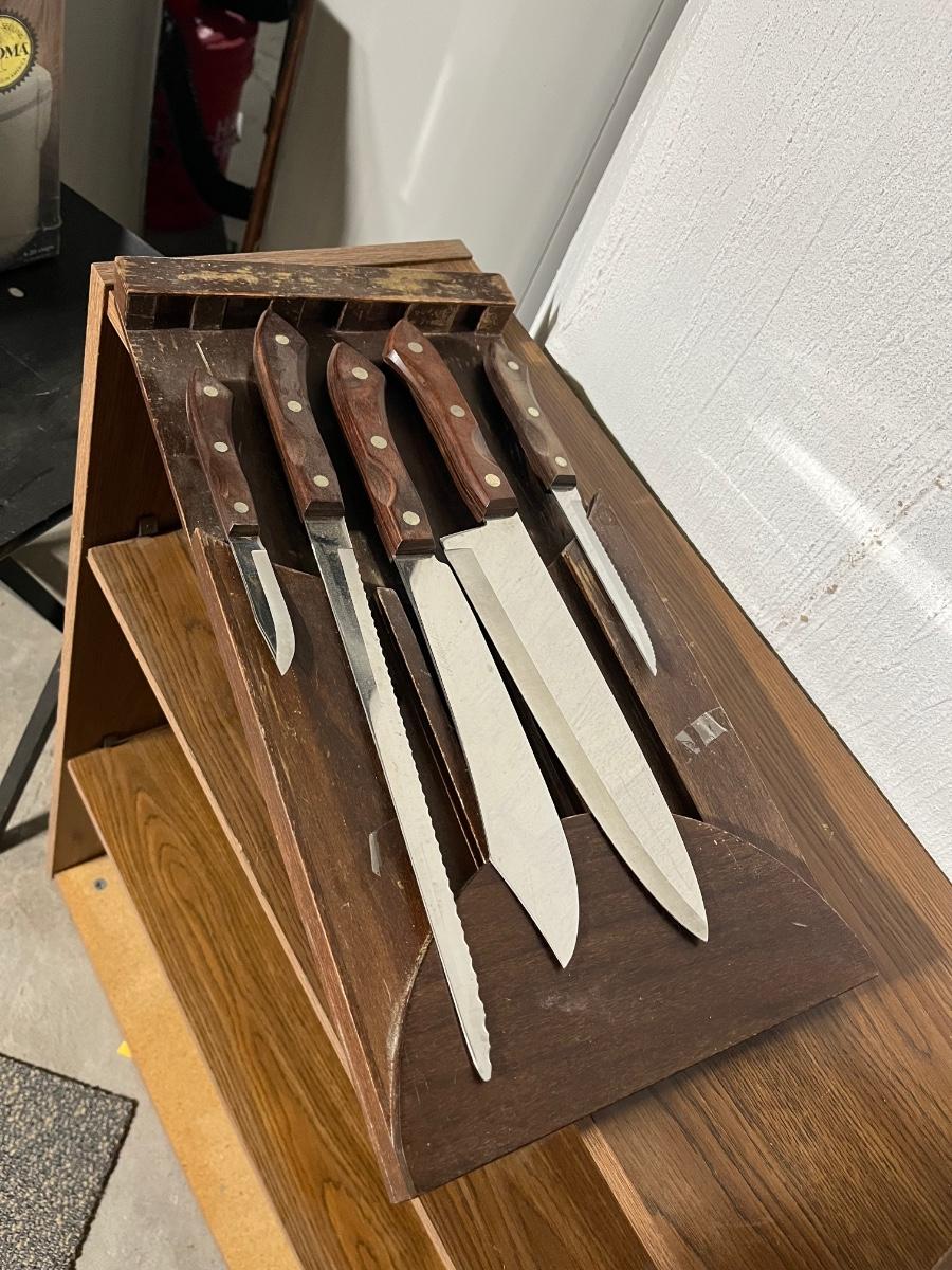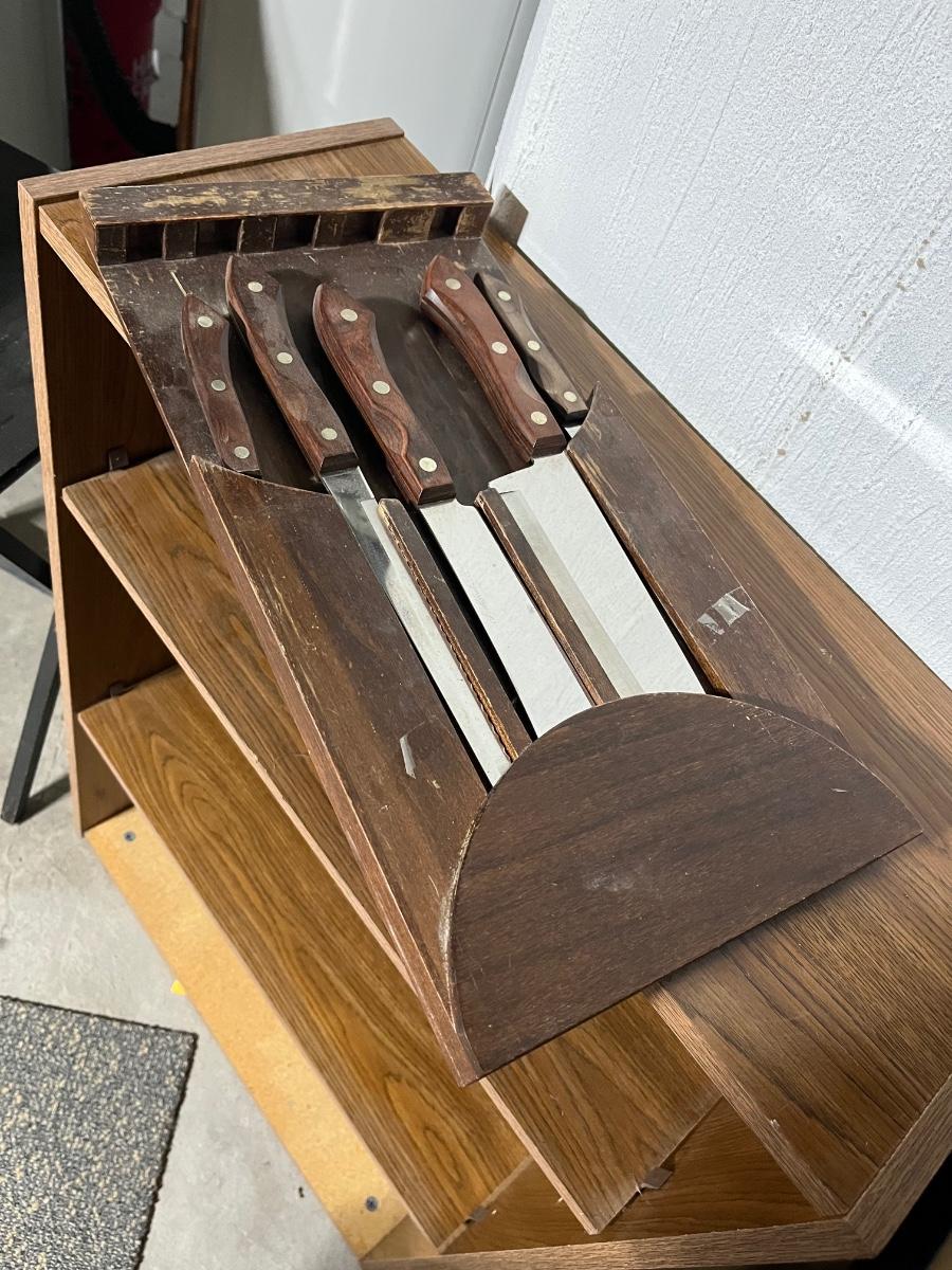 5 piece kitchen knife set and flat knife block. The knife block can be mounted on a wall or back of a cabinet door.