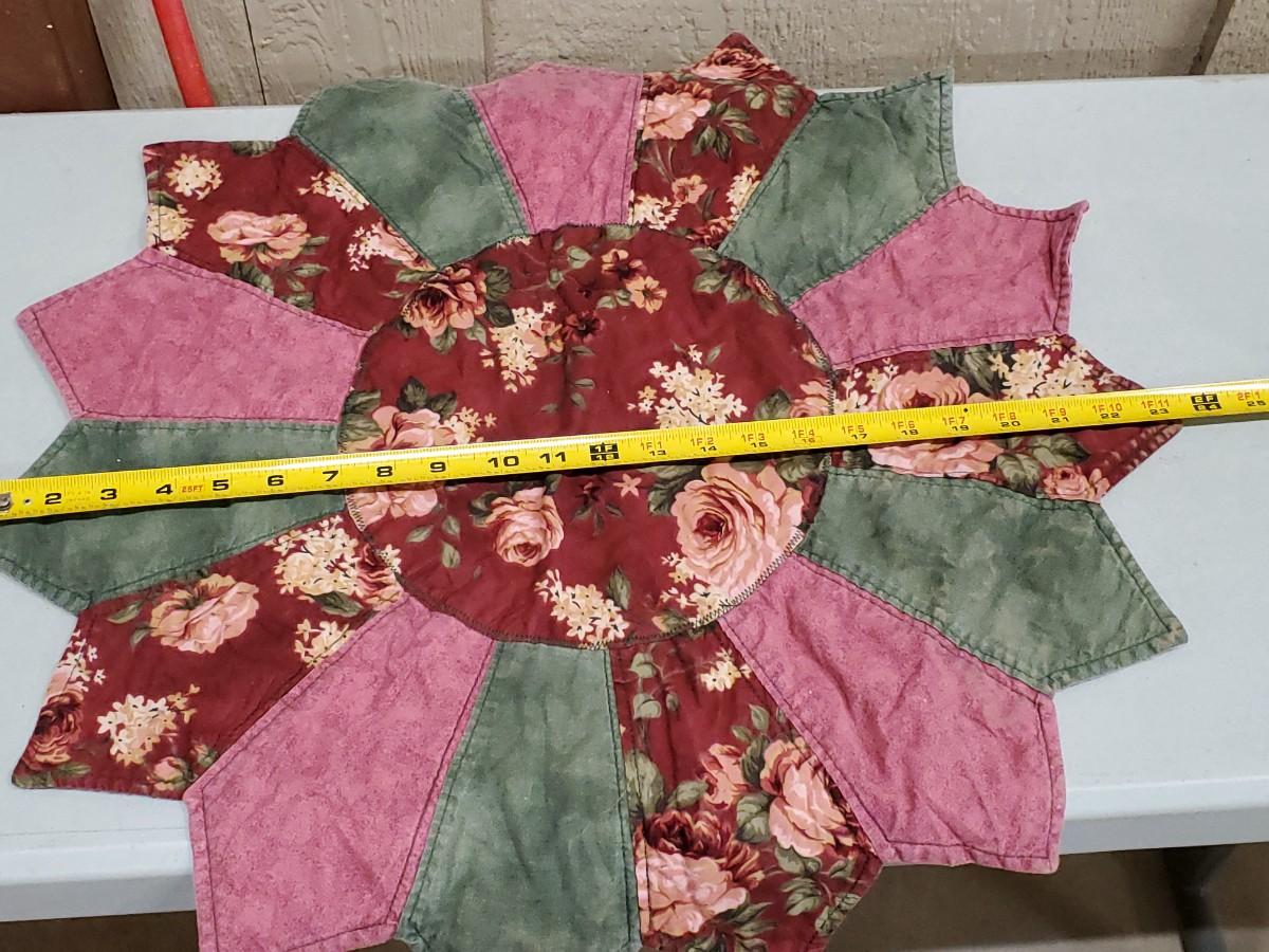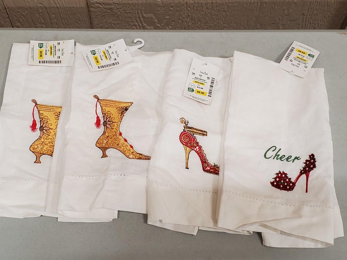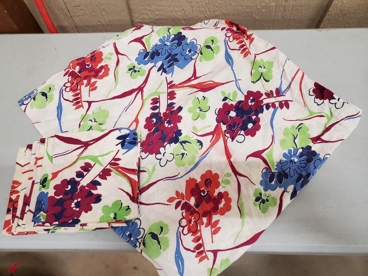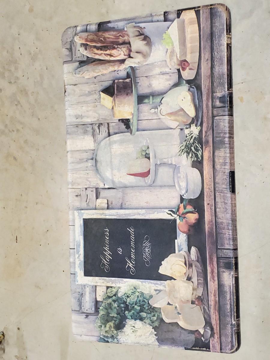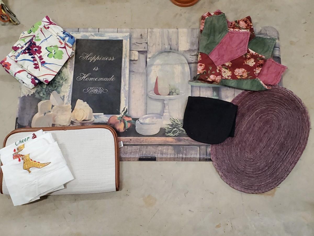 Padded floor mat, kitchen towels, vtg tablecloth with matching napkins, 2 padded dish dryer mats