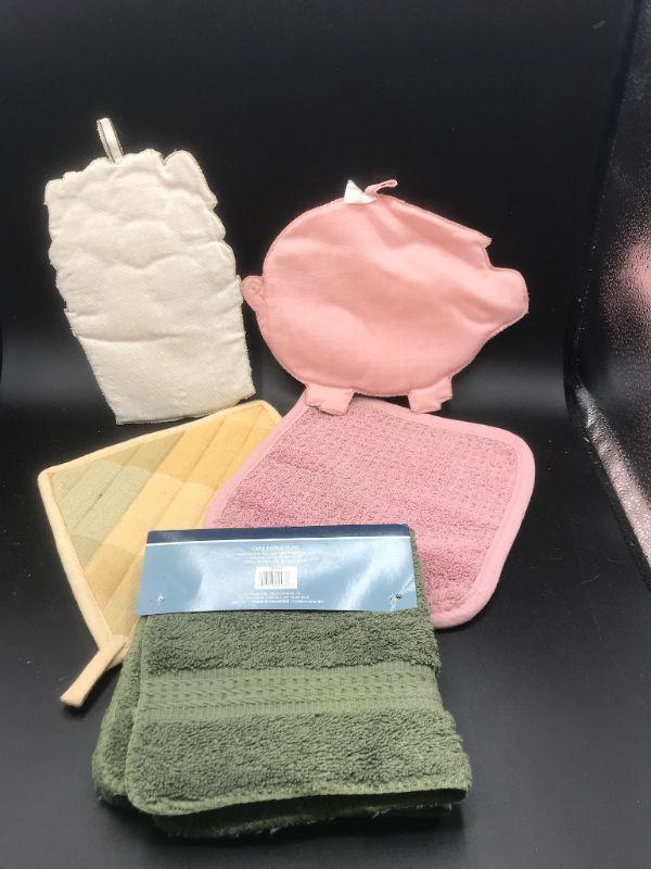 Kitchen linen lot. Pot holders and pair of washcloths. Good Condition.