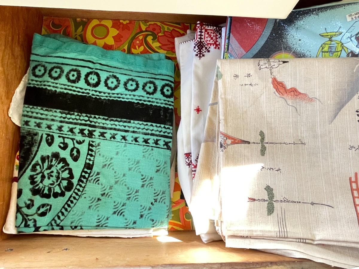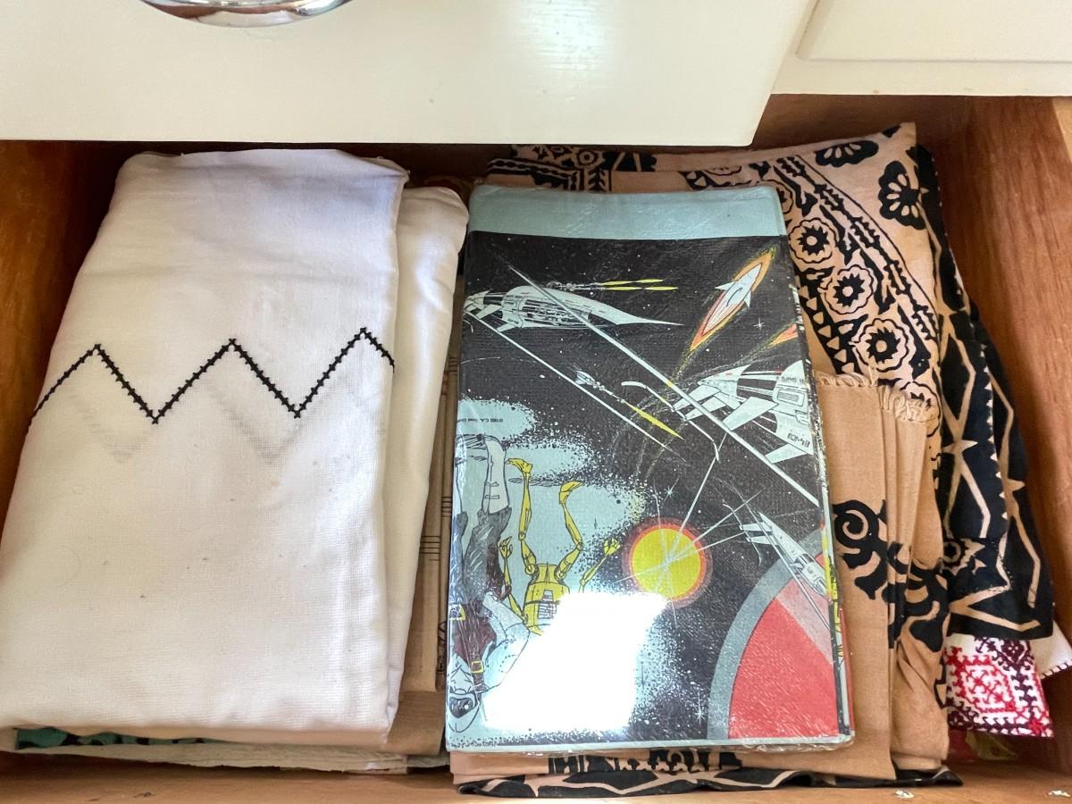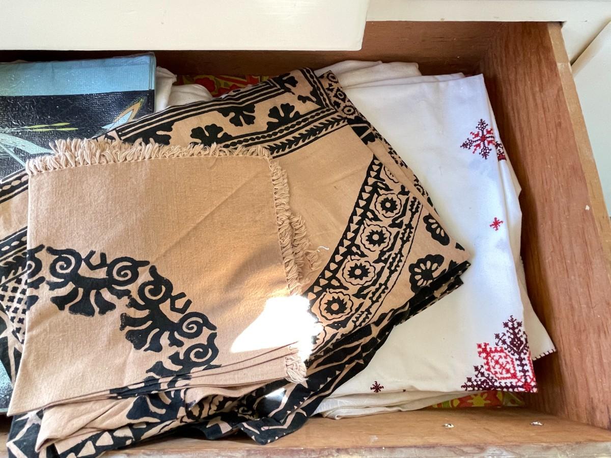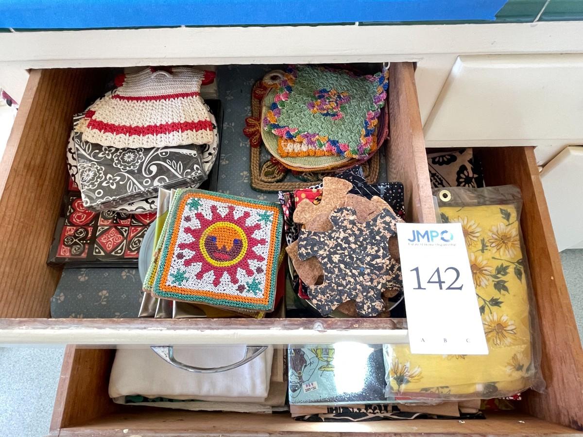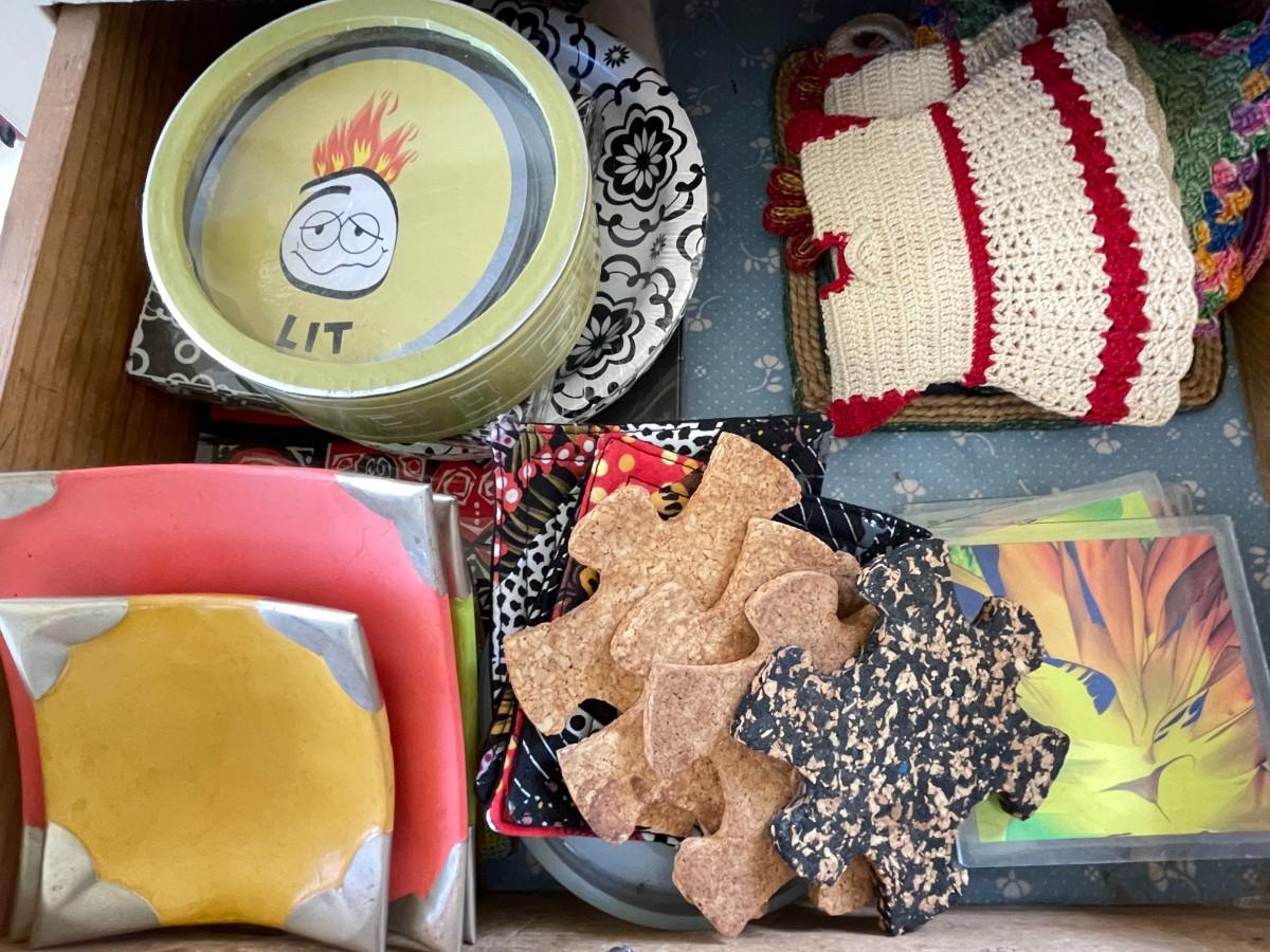 Includes coasters and trivets. Napkins, towels, hotpads. Disposable hostess plates.