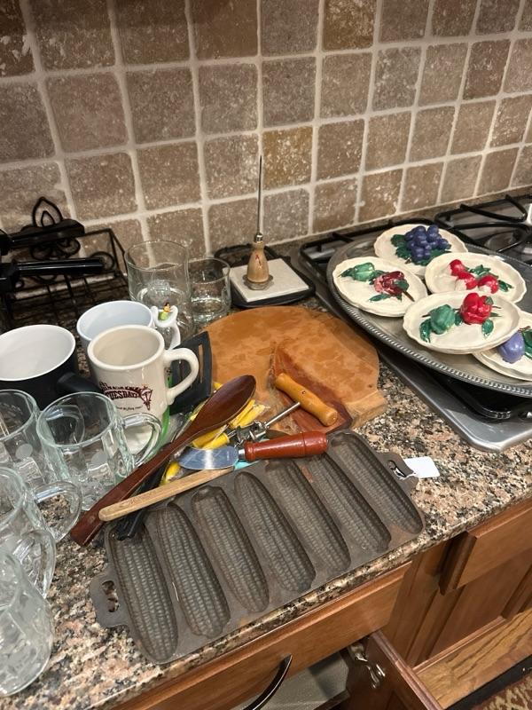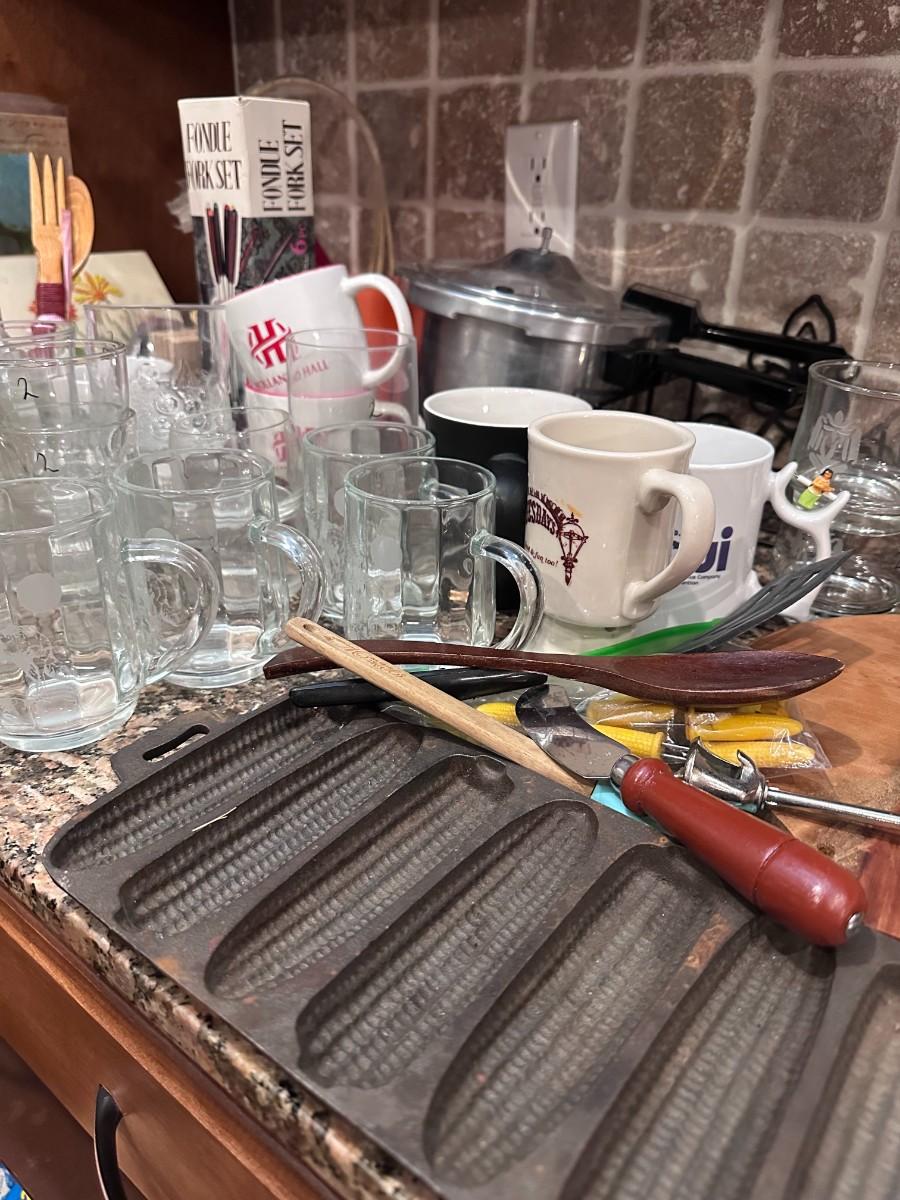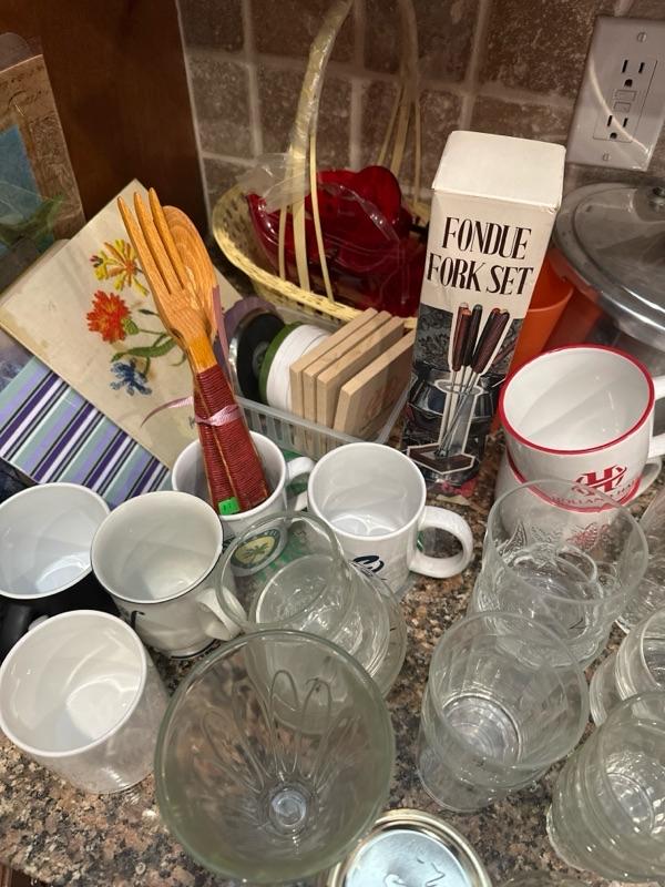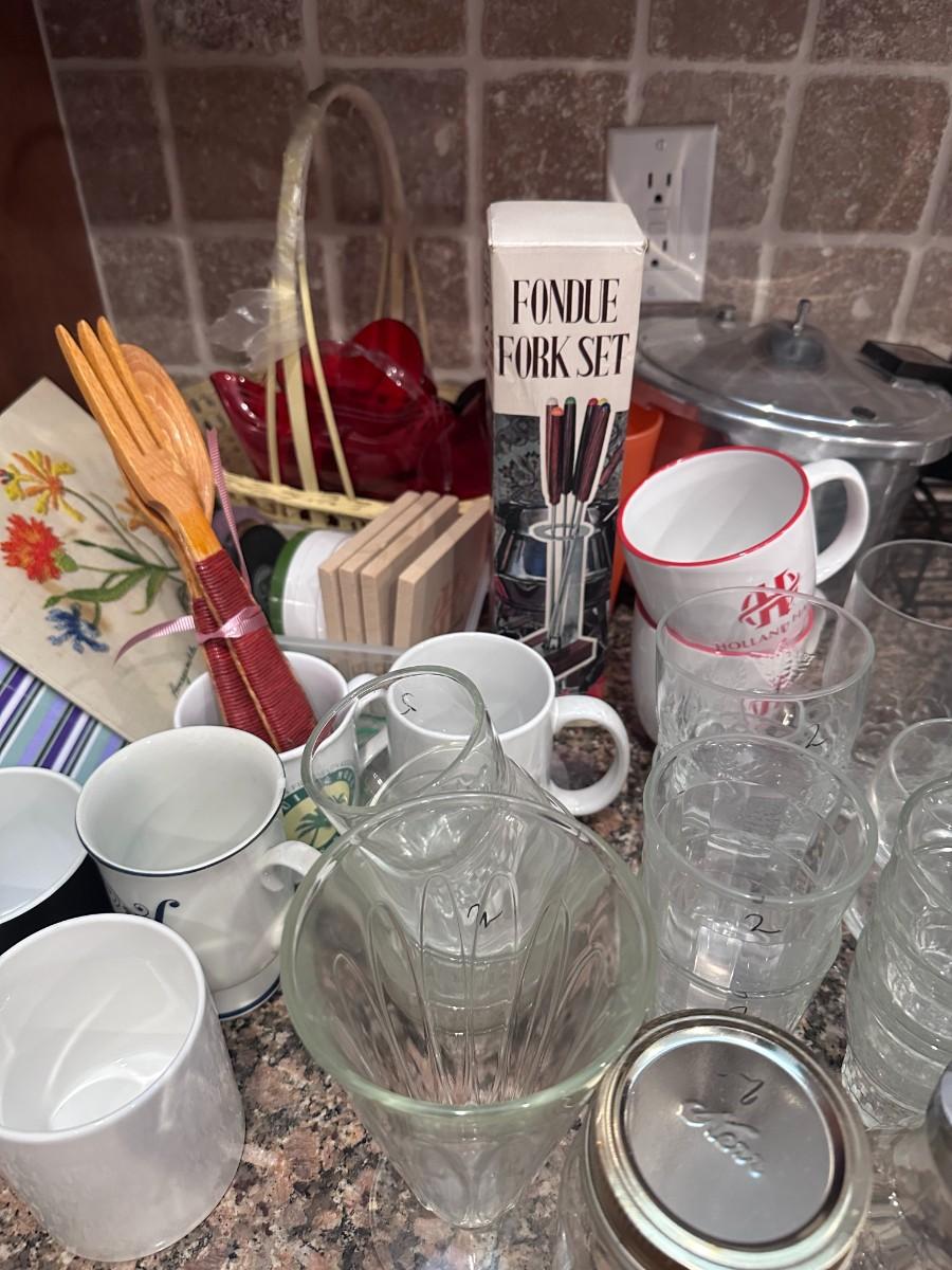Coffee Cups, glasses, cast iron, vintage fondue forks, and more.
