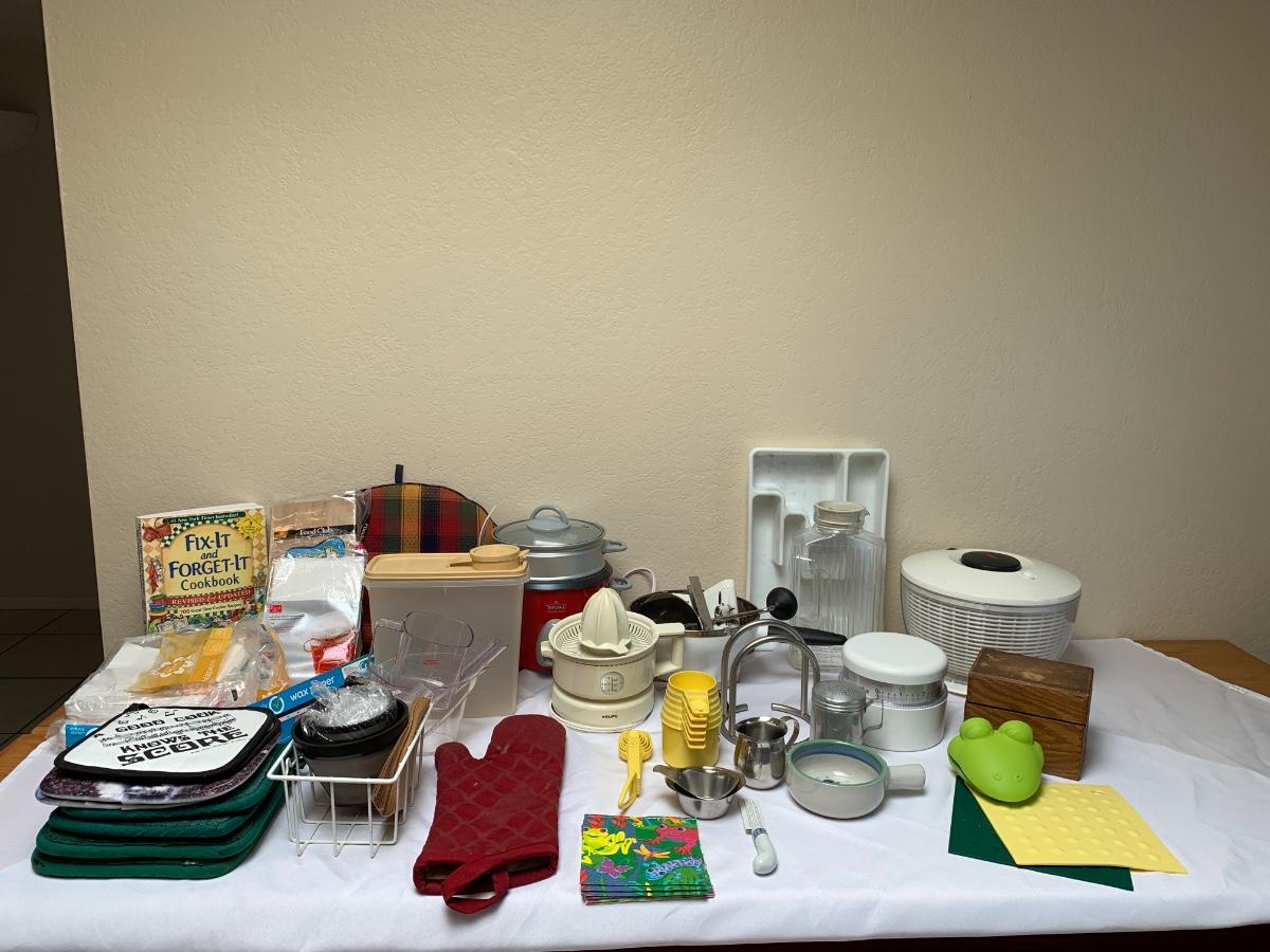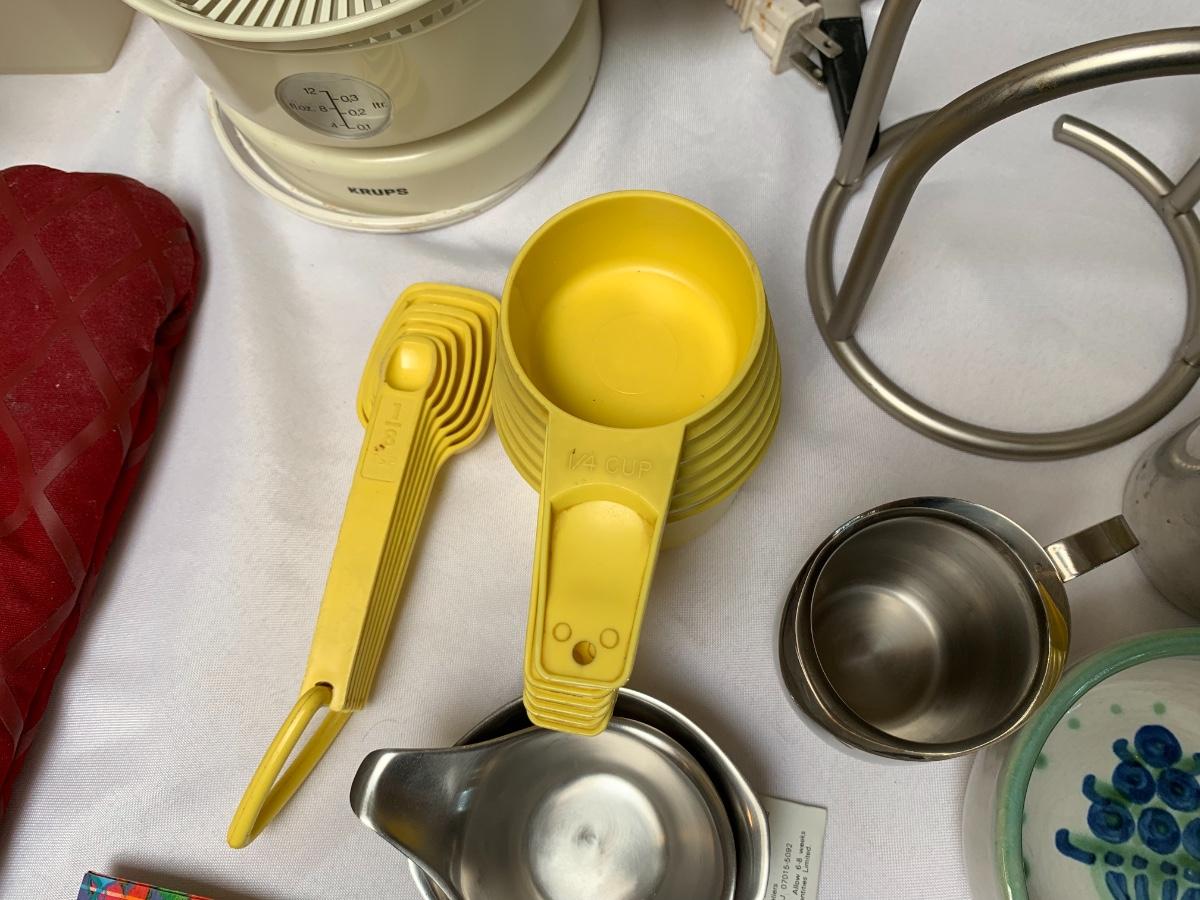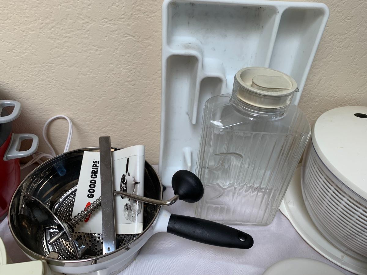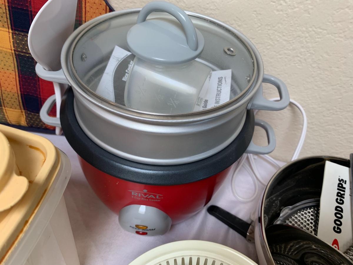 Collection of kitchen items including Rival rice cooker, Oxo Salad Spinner, kitchen scale, Krupps juicer, food mill, measuring cups and spoons, pot holders and more