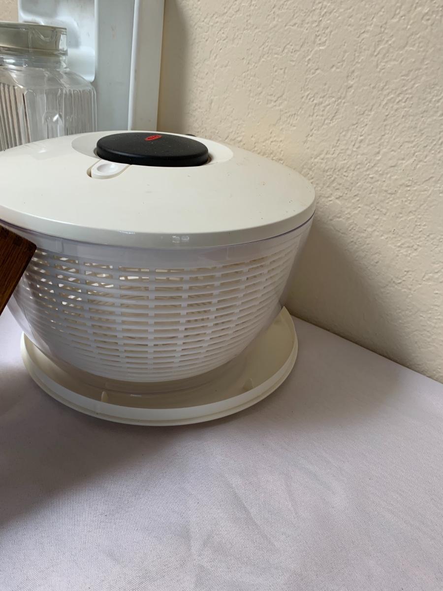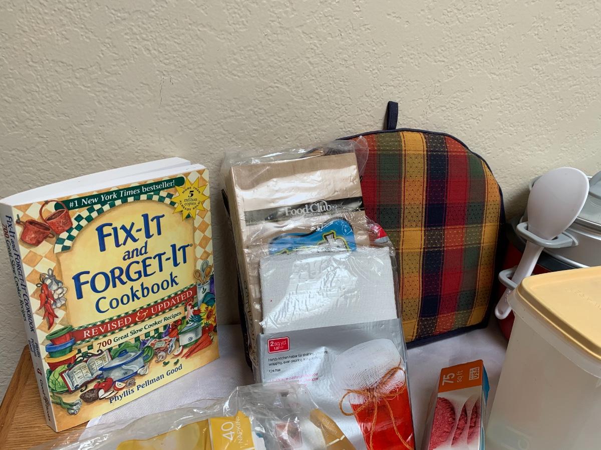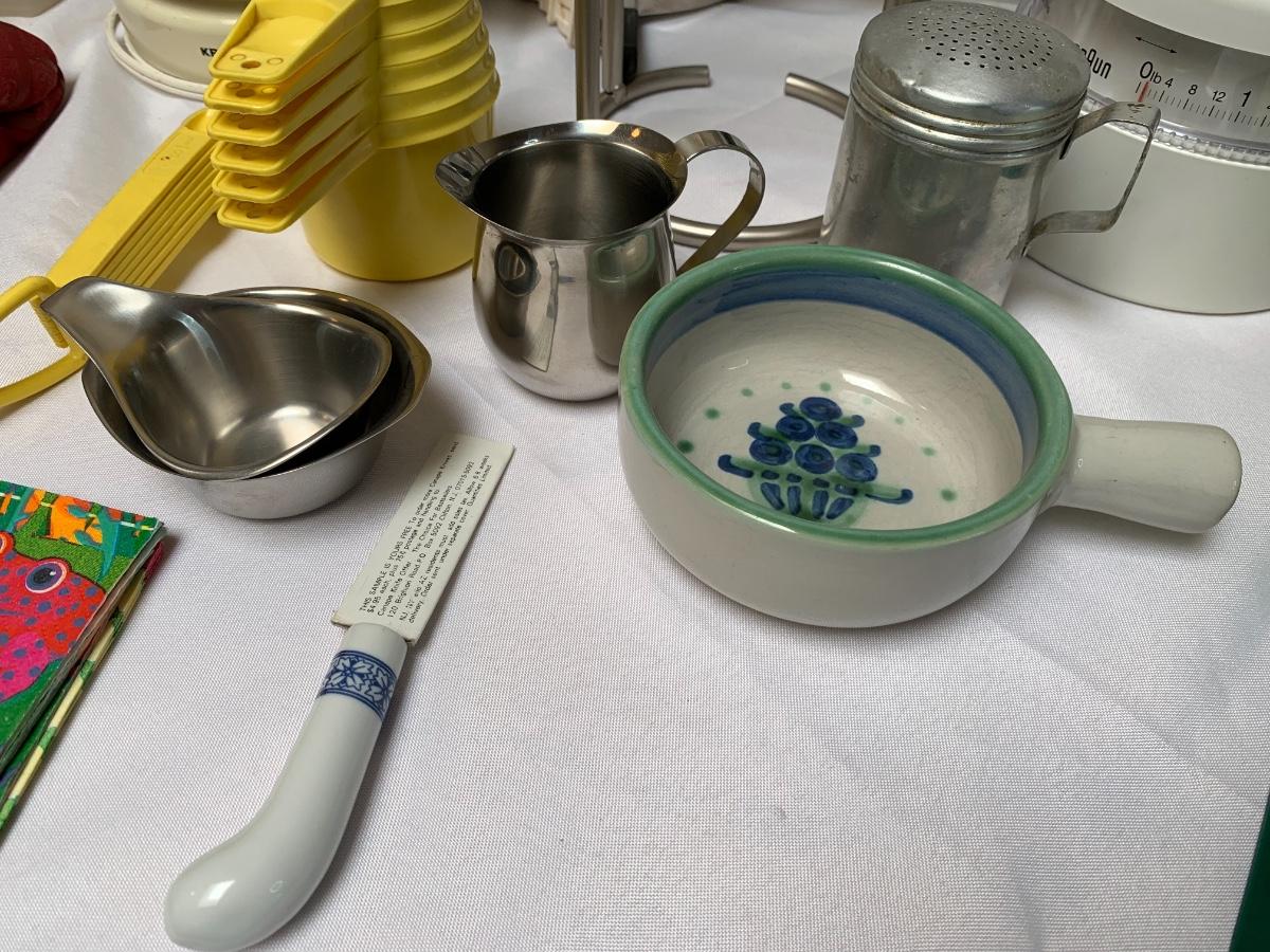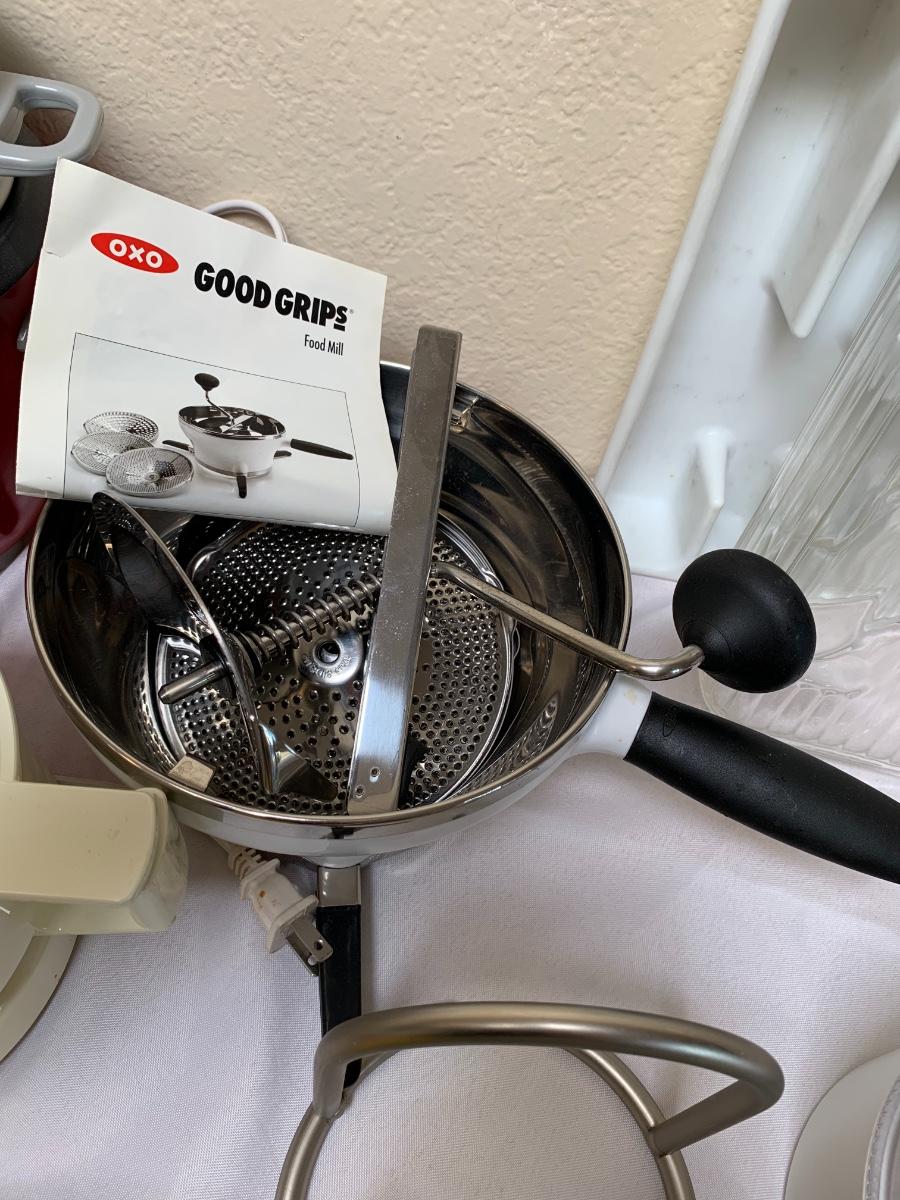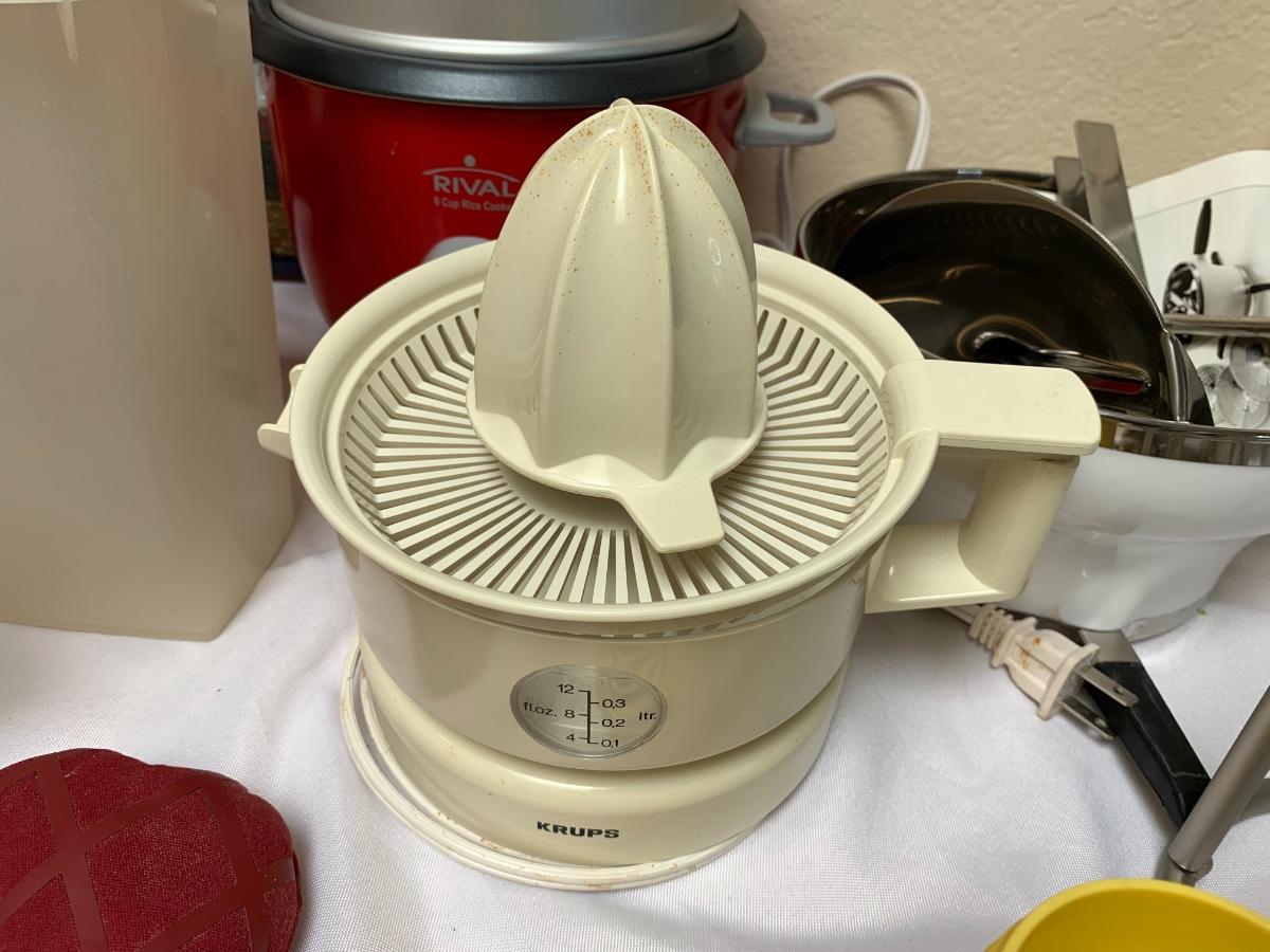 Collection of kitchen items including Rival rice cooker, Oxo Salad Spinner, kitchen scale, Krupps juicer, food mill, measuring cups and spoons, pot holders and more