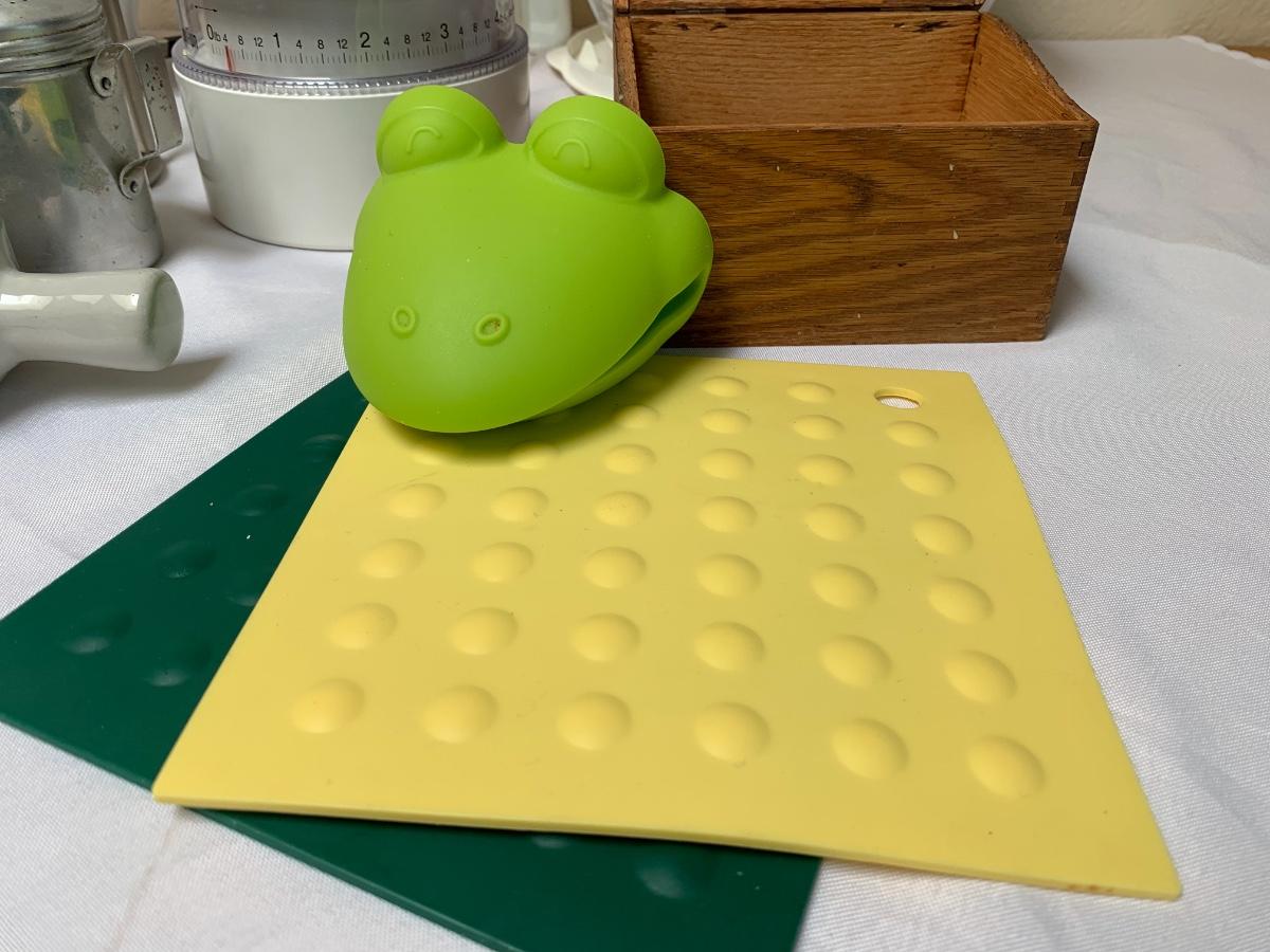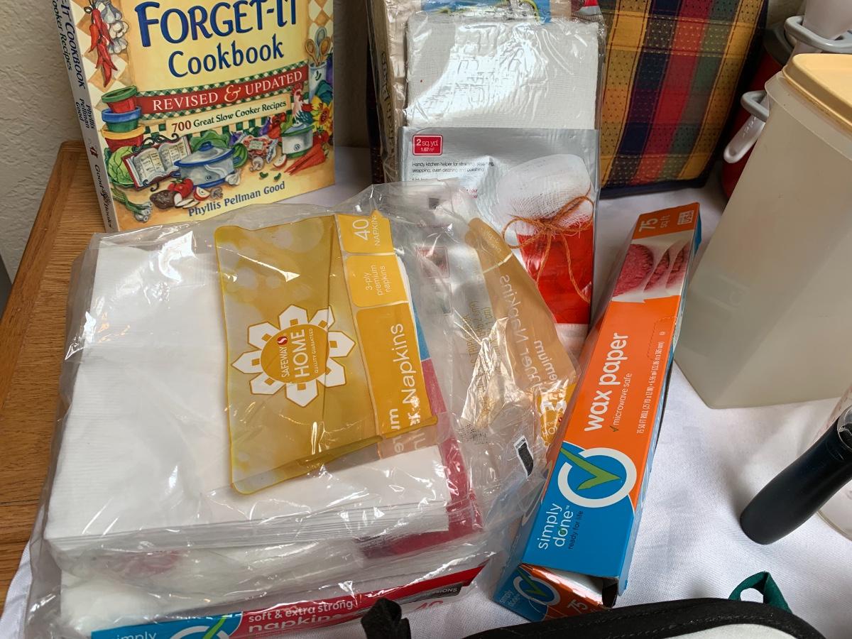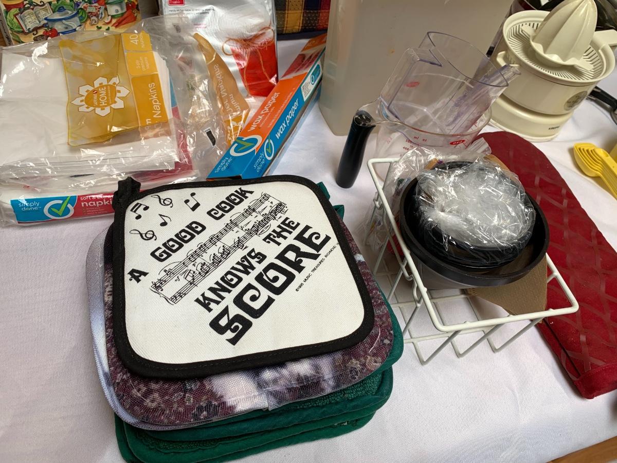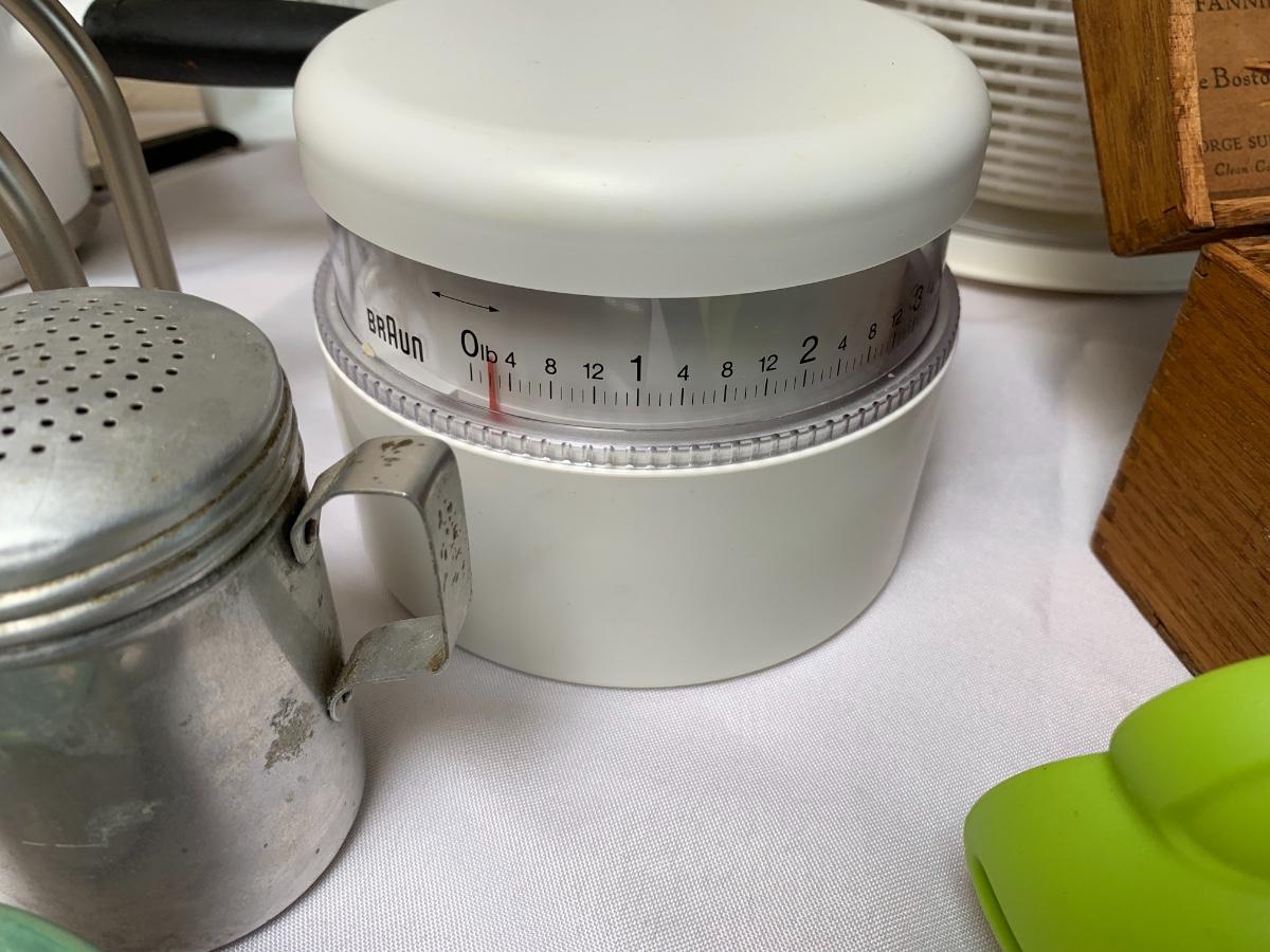 Collection of kitchen items including Rival rice cooker, Oxo Salad Spinner, kitchen scale, Krupps juicer, food mill, measuring cups and spoons, pot holders and more
