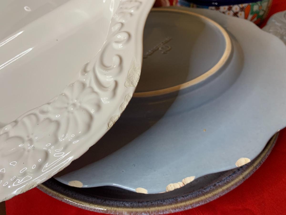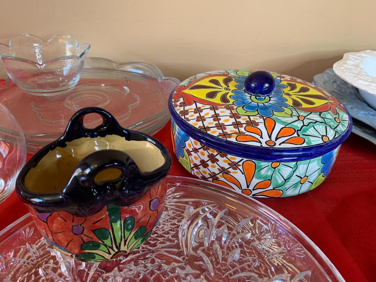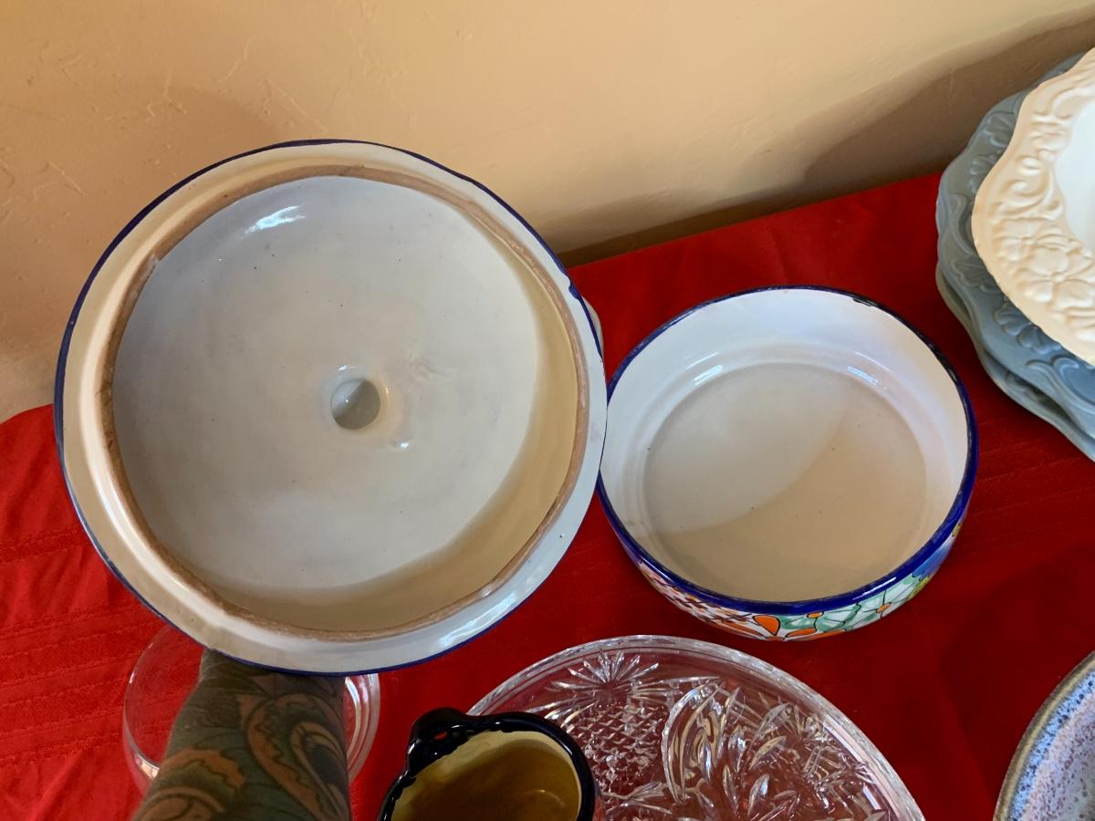An assortment of kitchen items including platters, talavera casserole dishes and more. Includes pfaltzgraff platters