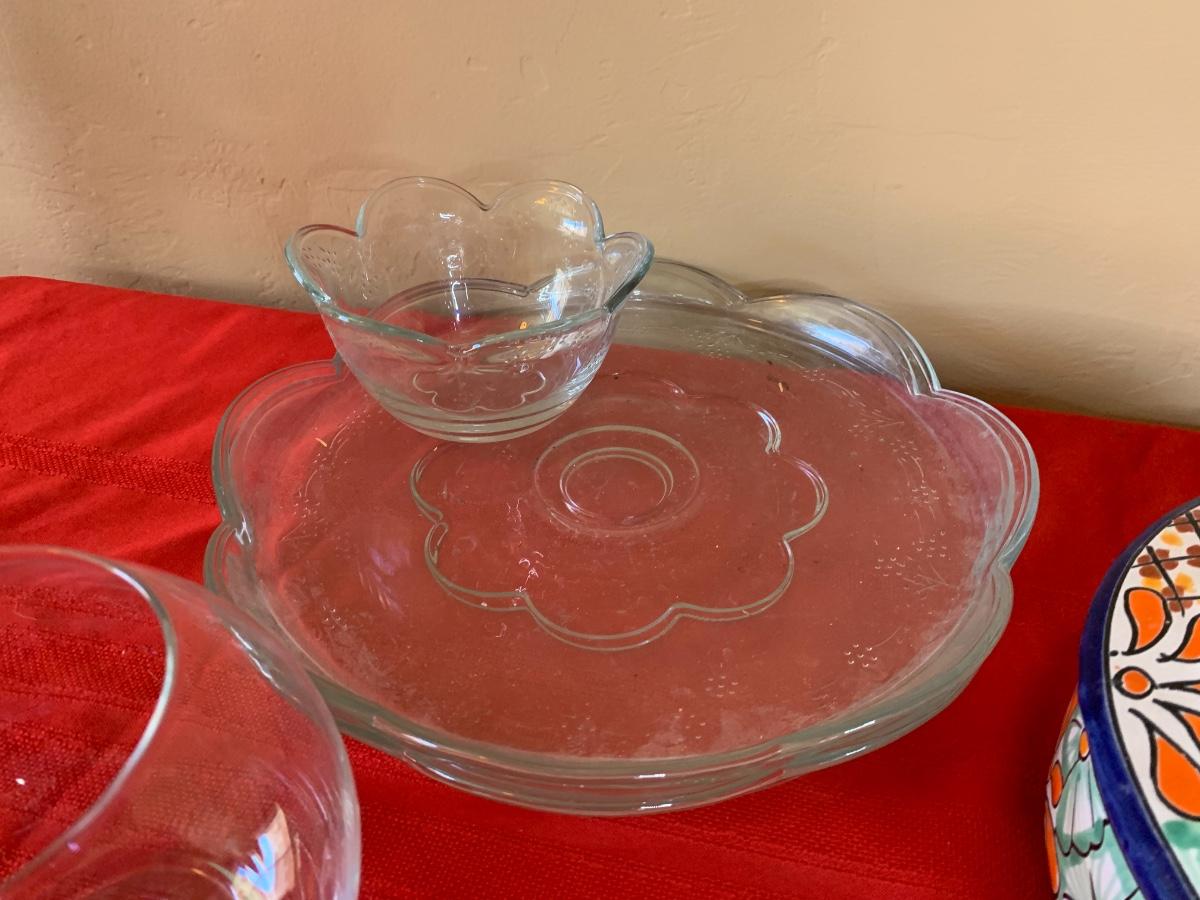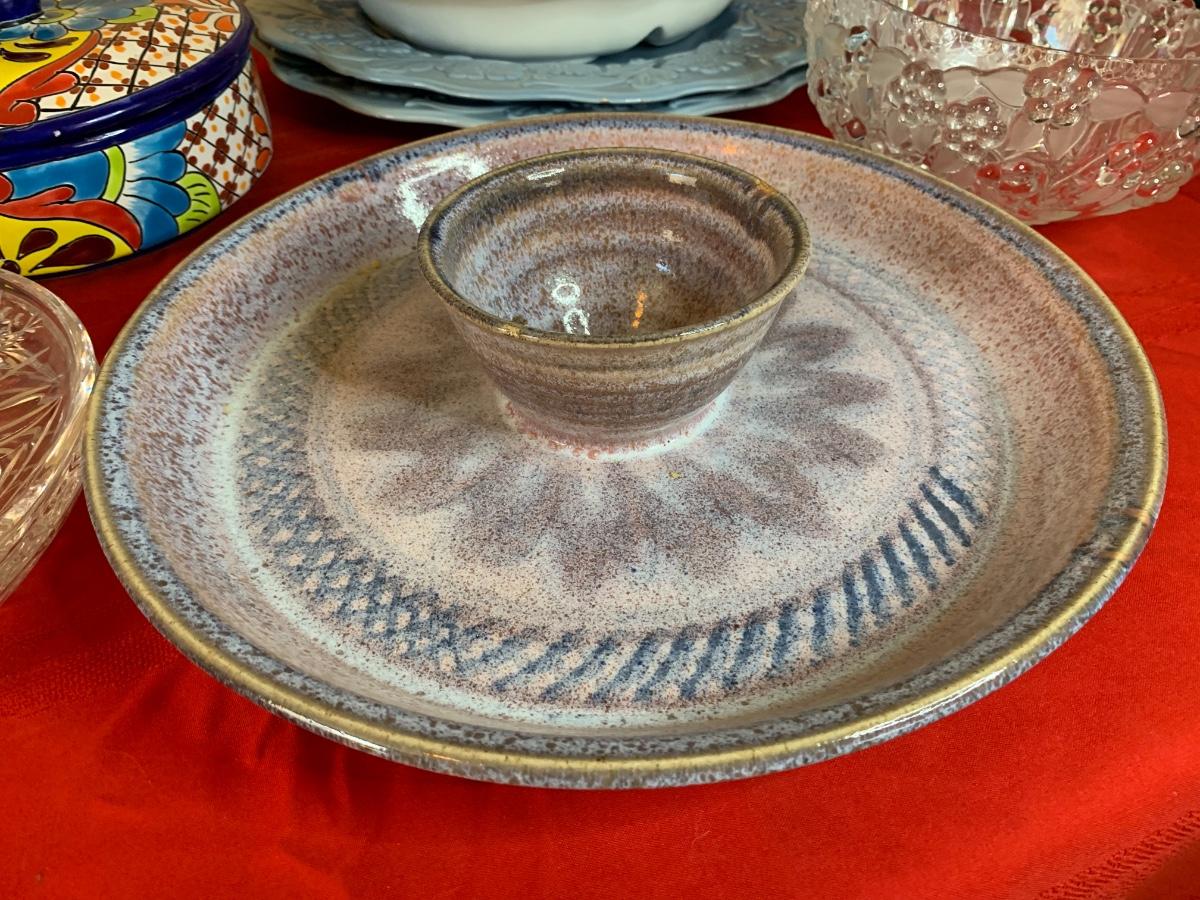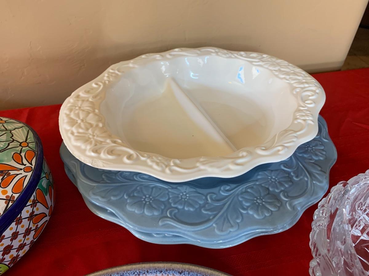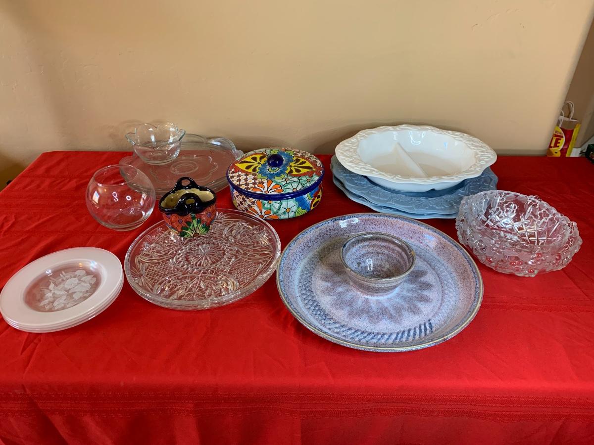 An assortment of kitchen items including platters, talavera casserole dishes and more. Includes pfaltzgraff platters