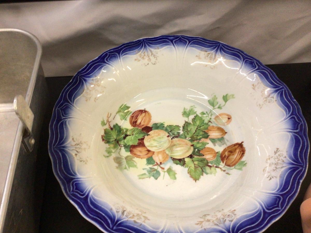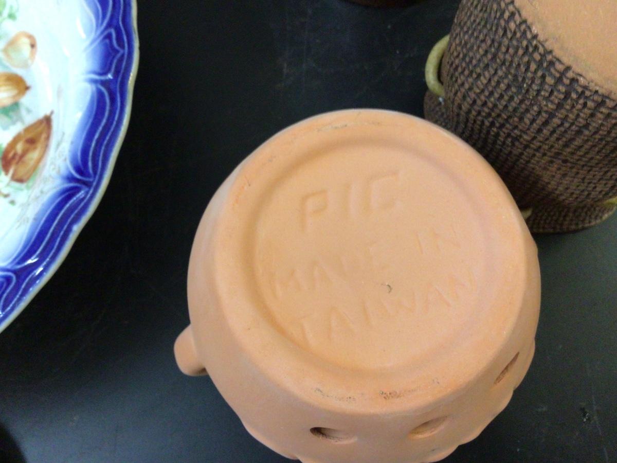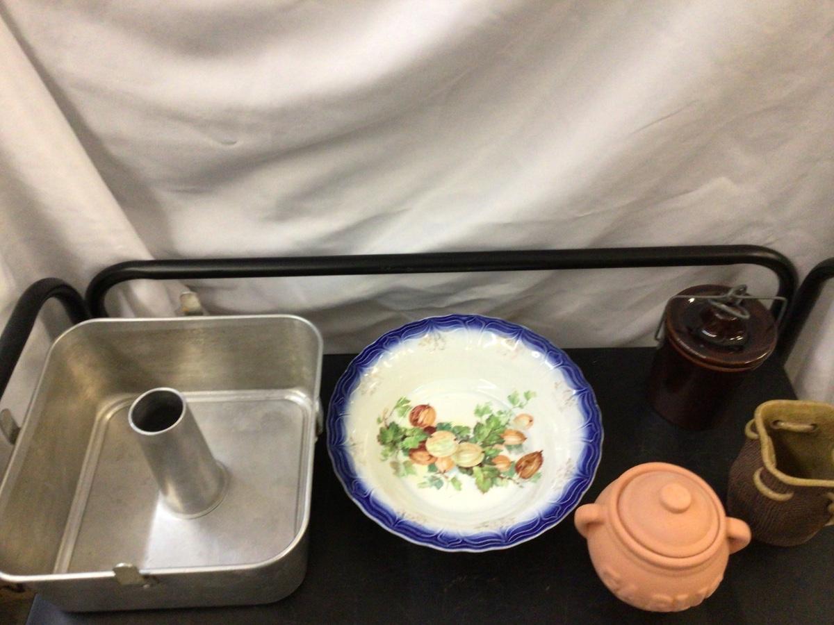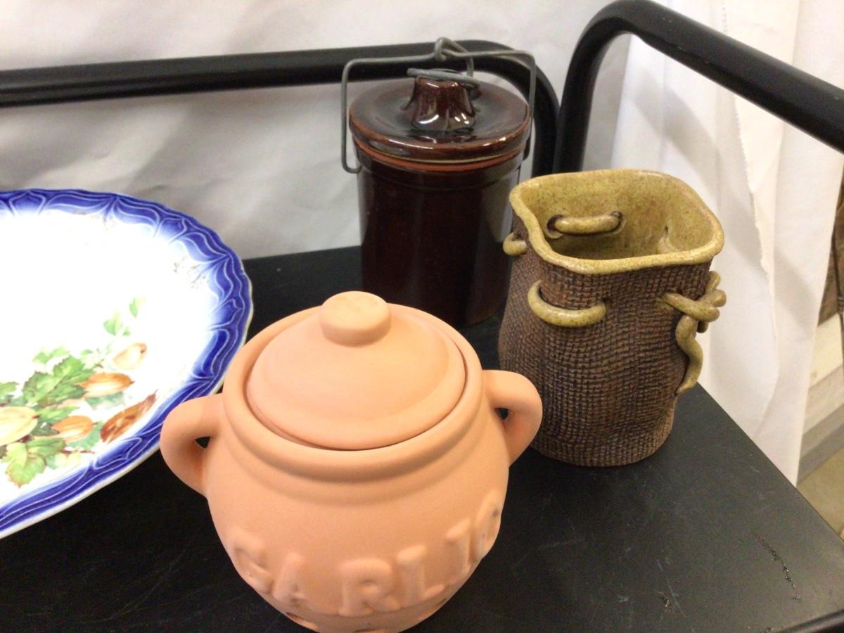 You get a great square angle food pan, nice Limoges serving bowl, terracotta garlic jar, pottery sack, and a canning jar.