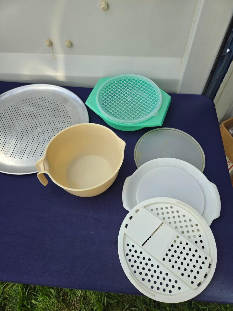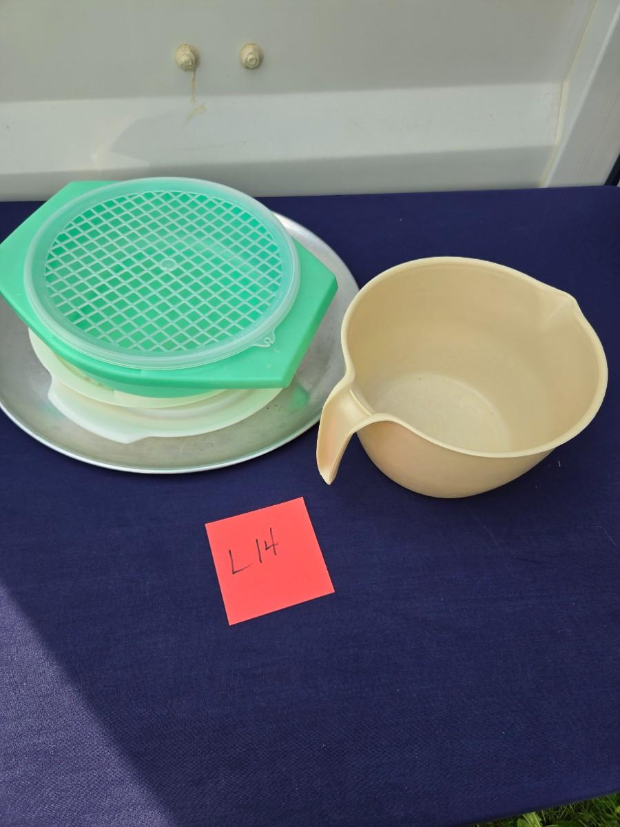 Kitchen lot includes xl pizza pan,muxing bowl & tupperware multi use dish