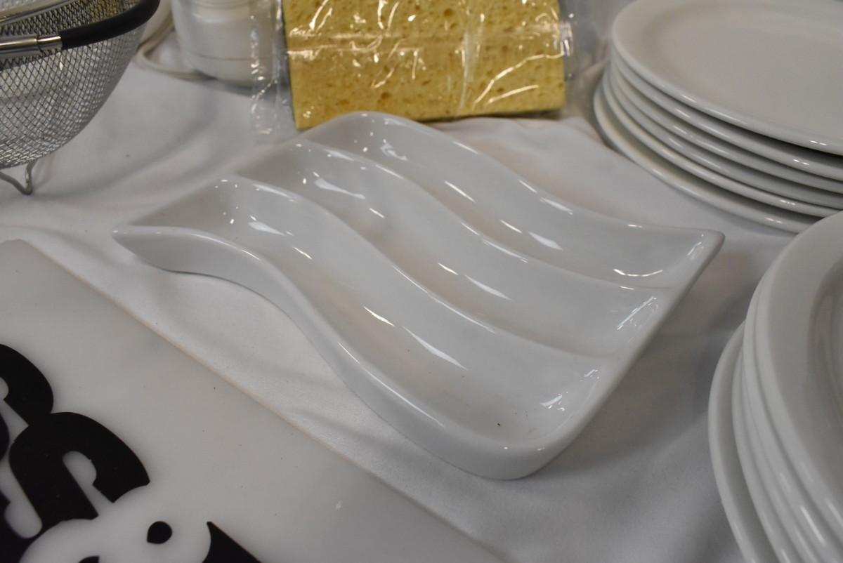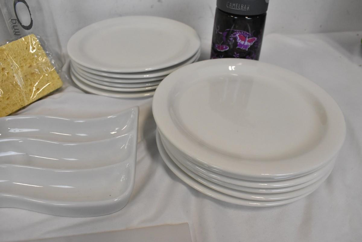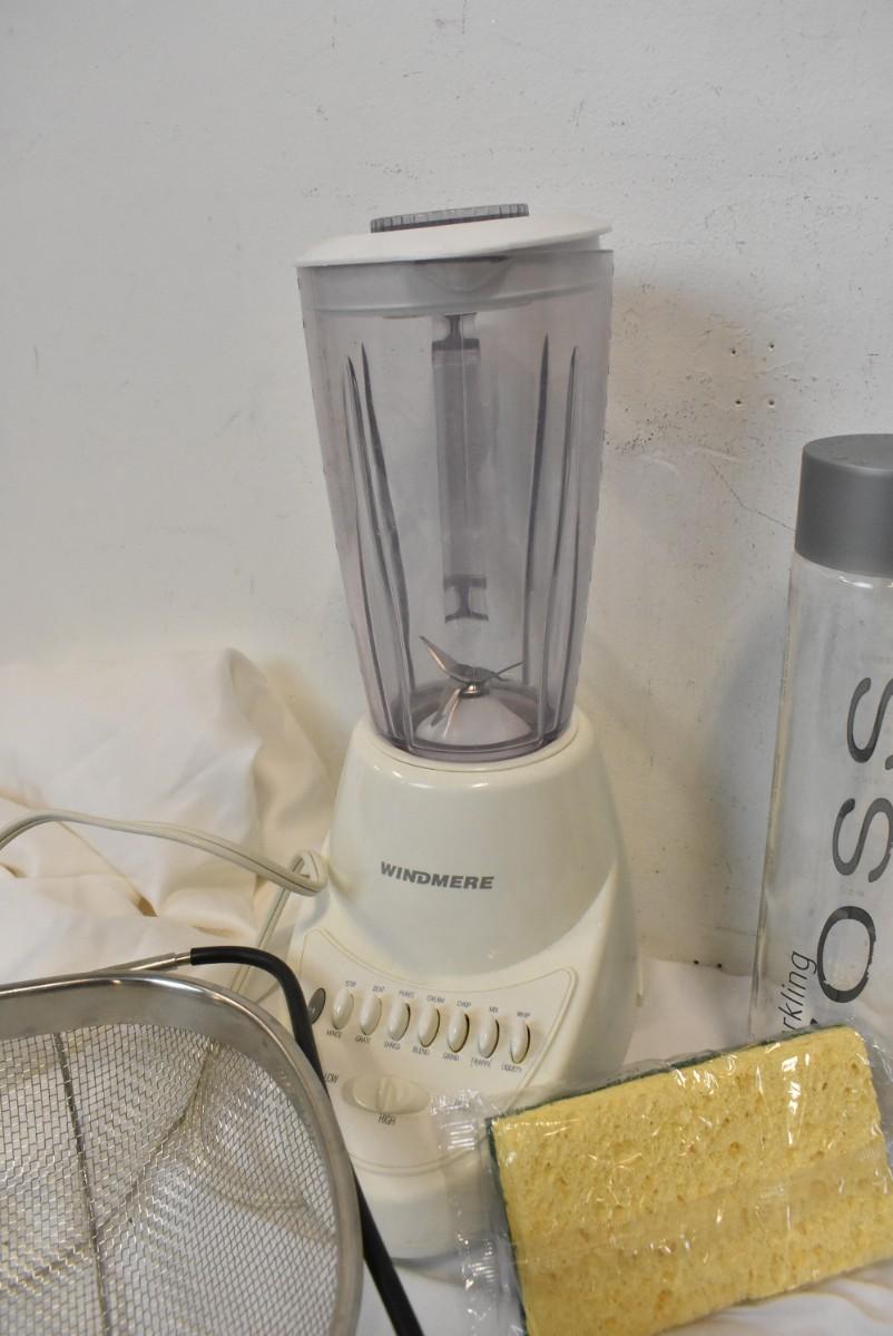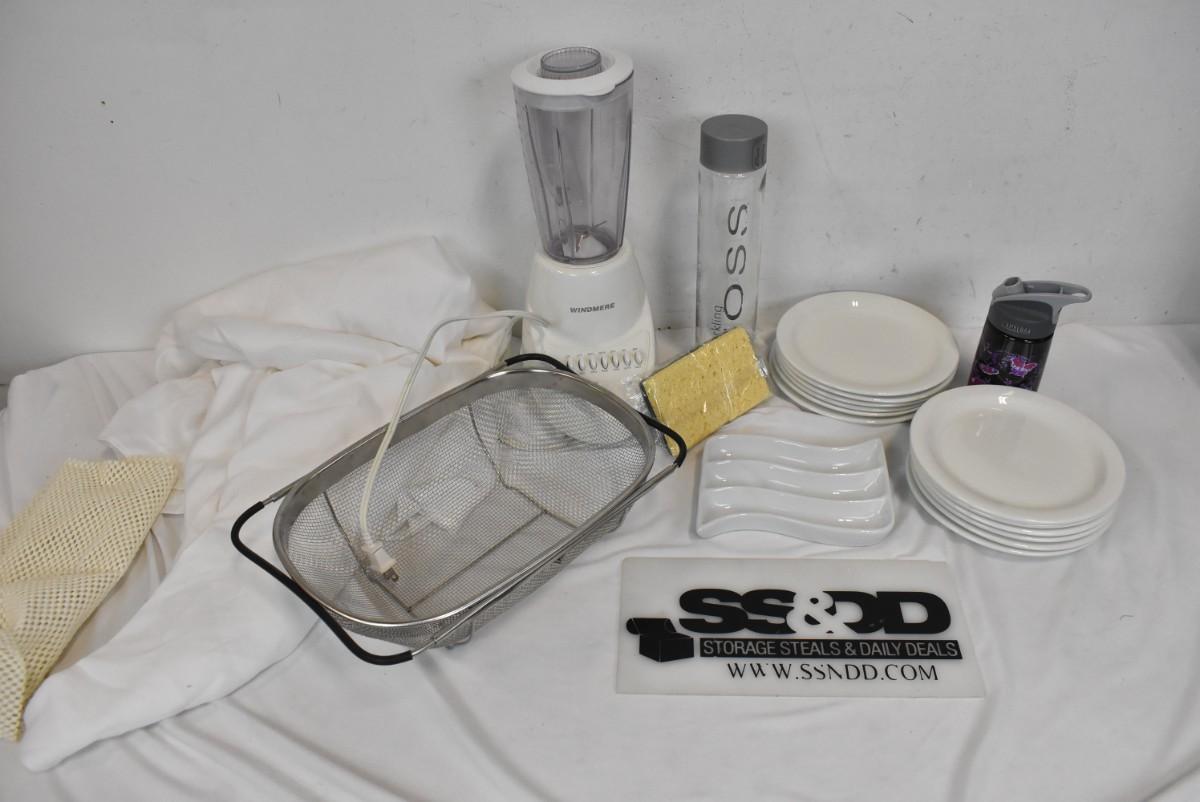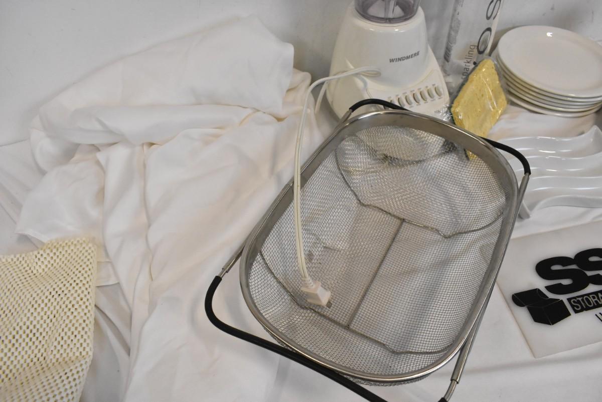 Kitchen Lot: 12 Ceramic Desert Plates, Windmere Blender, Table Cloth