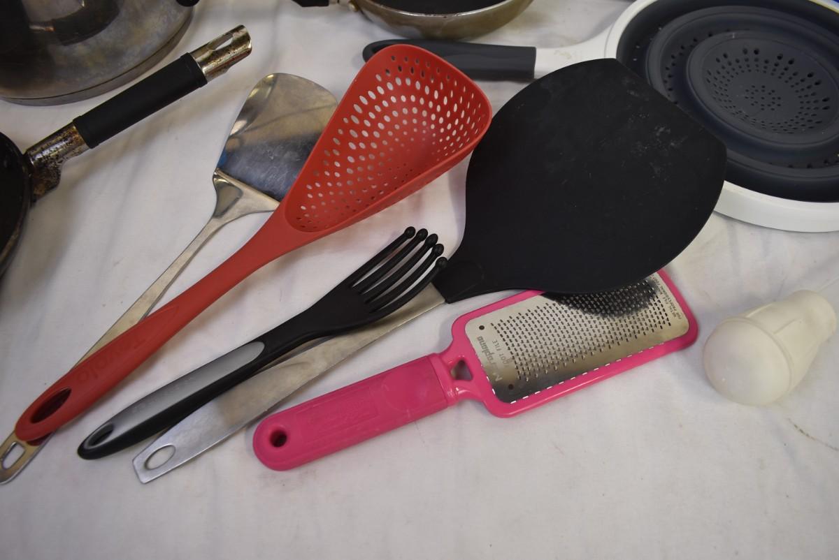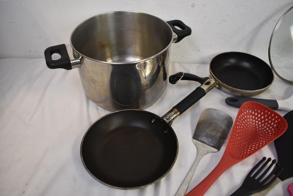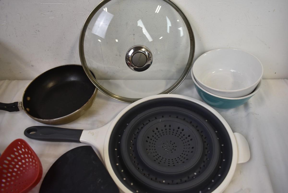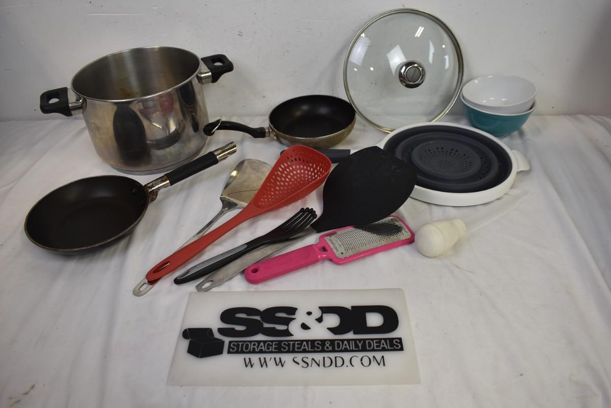 Kitchen Lot 15 Items: Rubberware Pot, Colander, Pans, Utensils, Bowls,