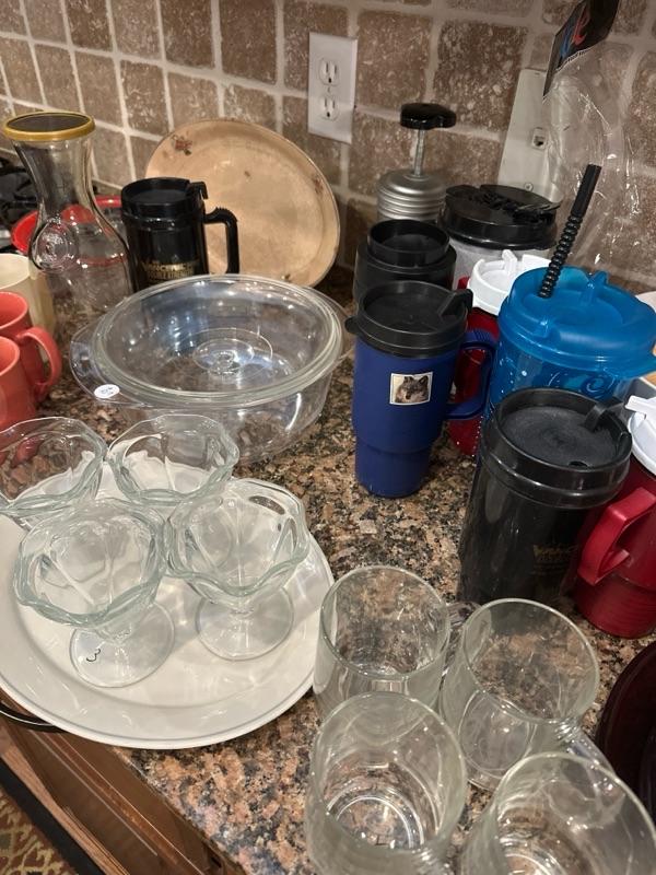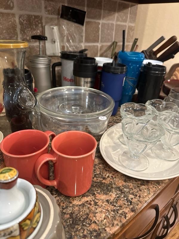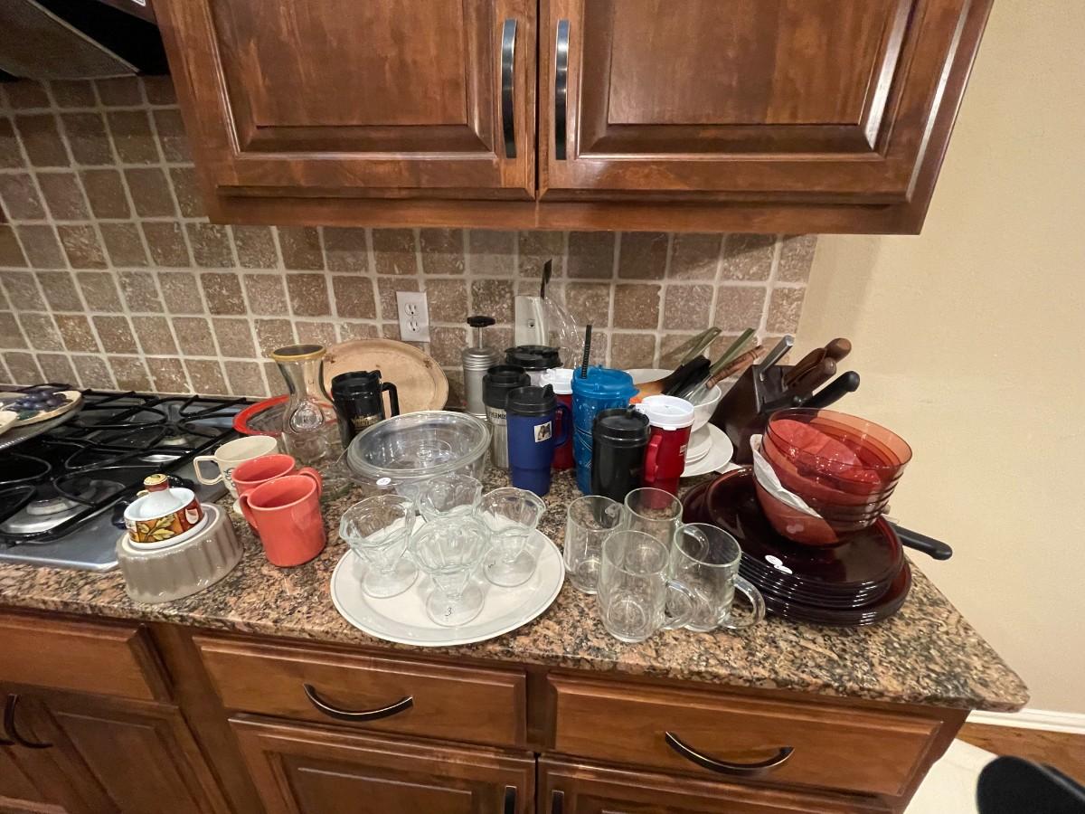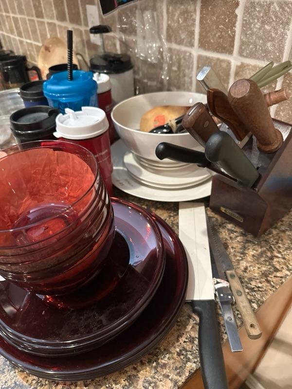 Cranberry colored set of dishes, Knife block, knives, glasses, and more