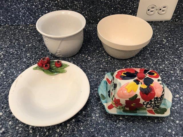 Includes varous white ceramic serving bowls, and a hand painted covered butter.