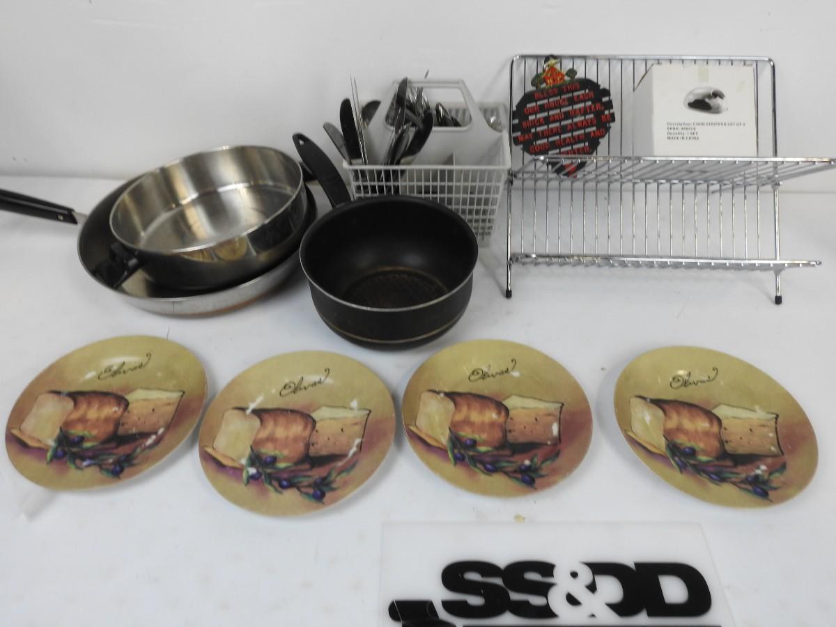 Kitchen Lot, 3 Pots and Pans, 4 ceramic Plates, Assorted SIlverware