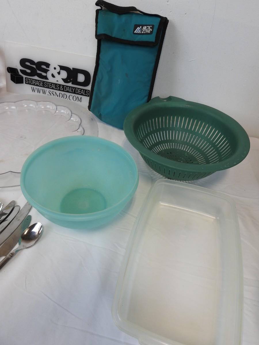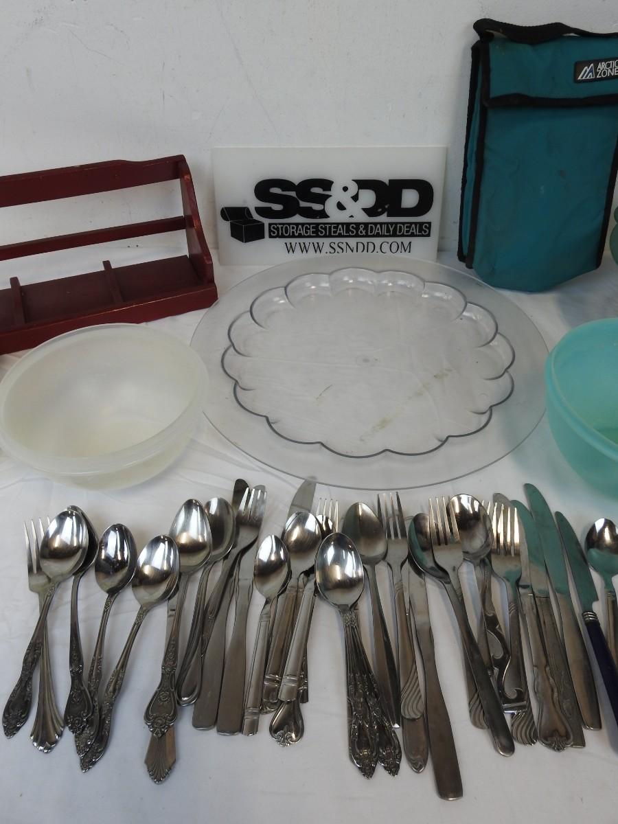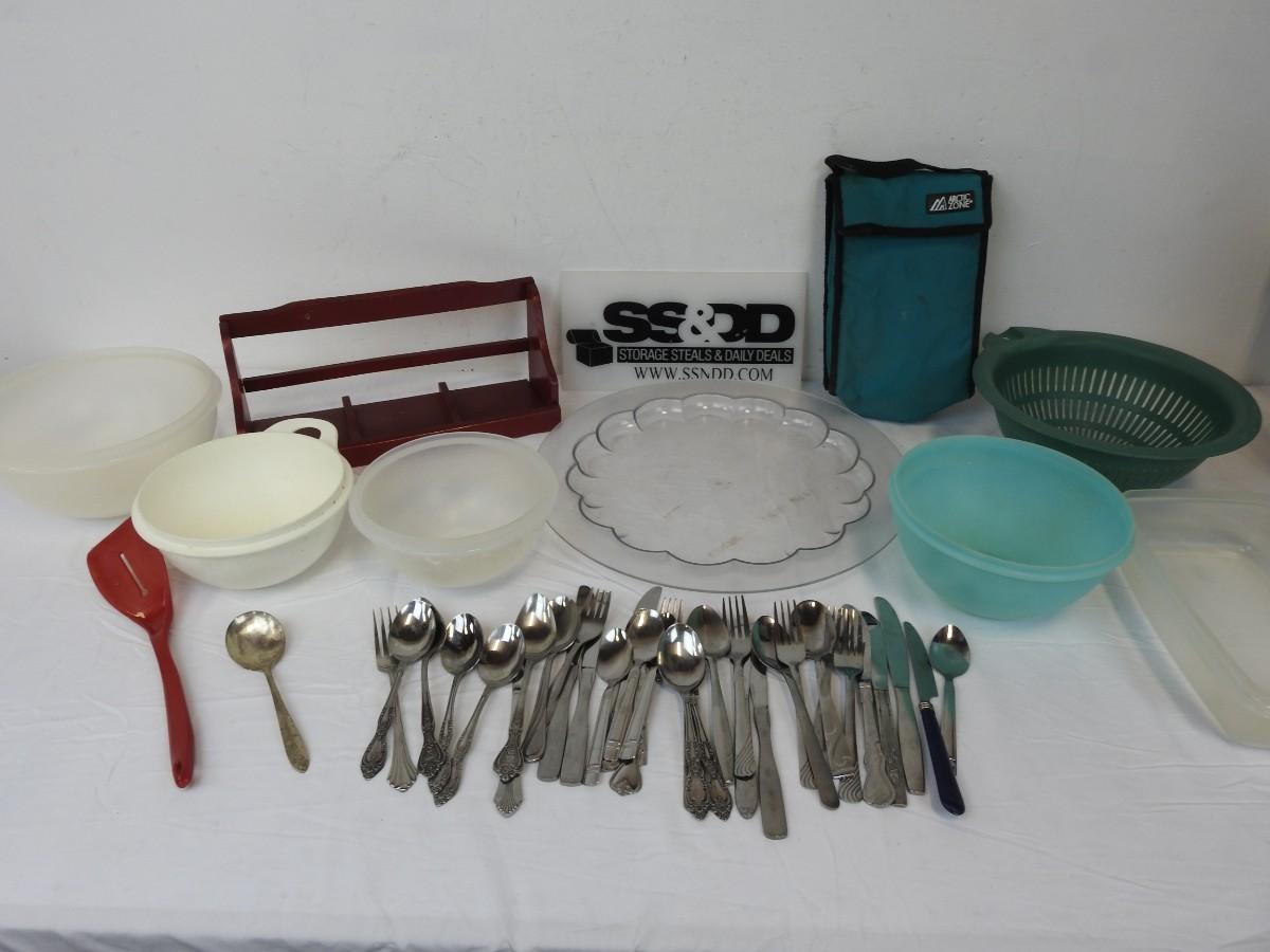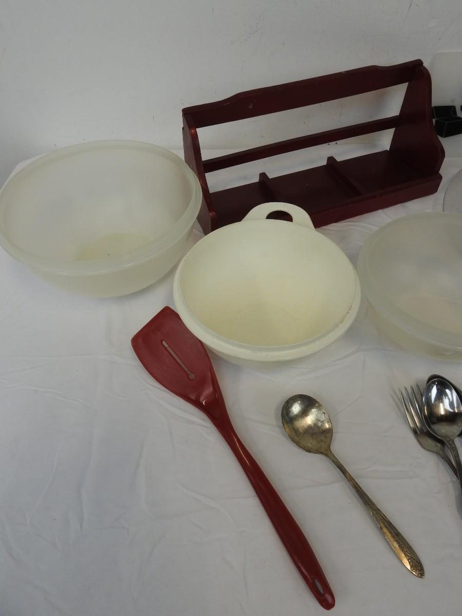 Kitchen Lot: 36 Utensils, 3 Tupperware Bowls, Small Red Wall Shelf