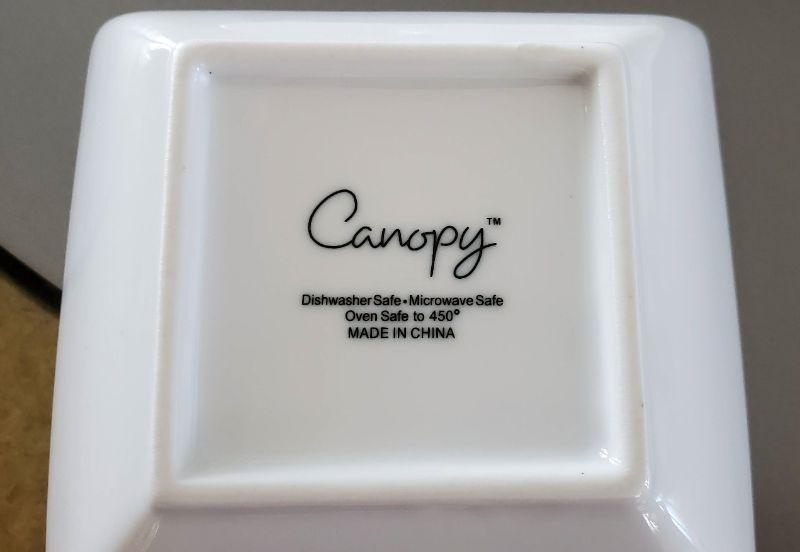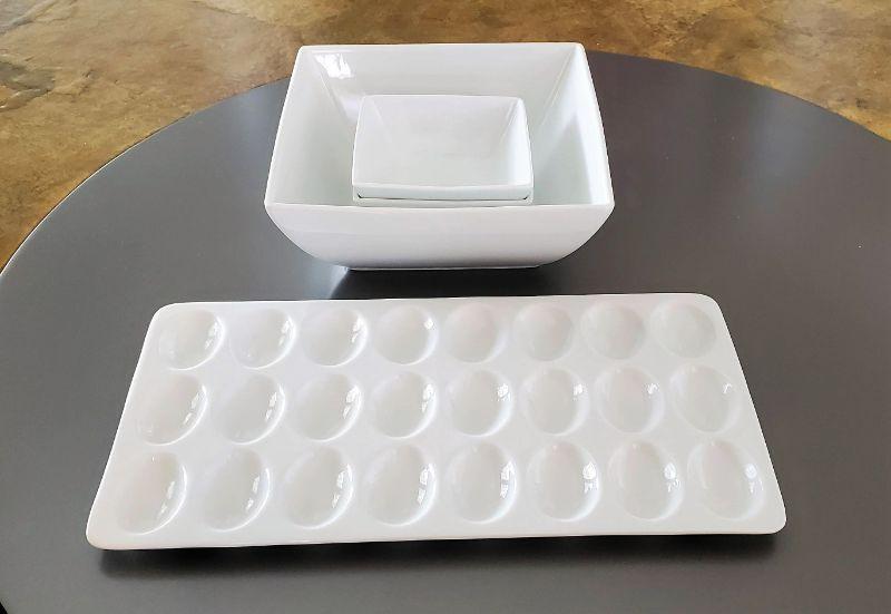 Kitchen Lot 4 (includes: one large and two small white ceramic square bowls canopy brand, one white ceramic egg plate) (egg: 15"x8", small bowls: 5" large: 9.75")