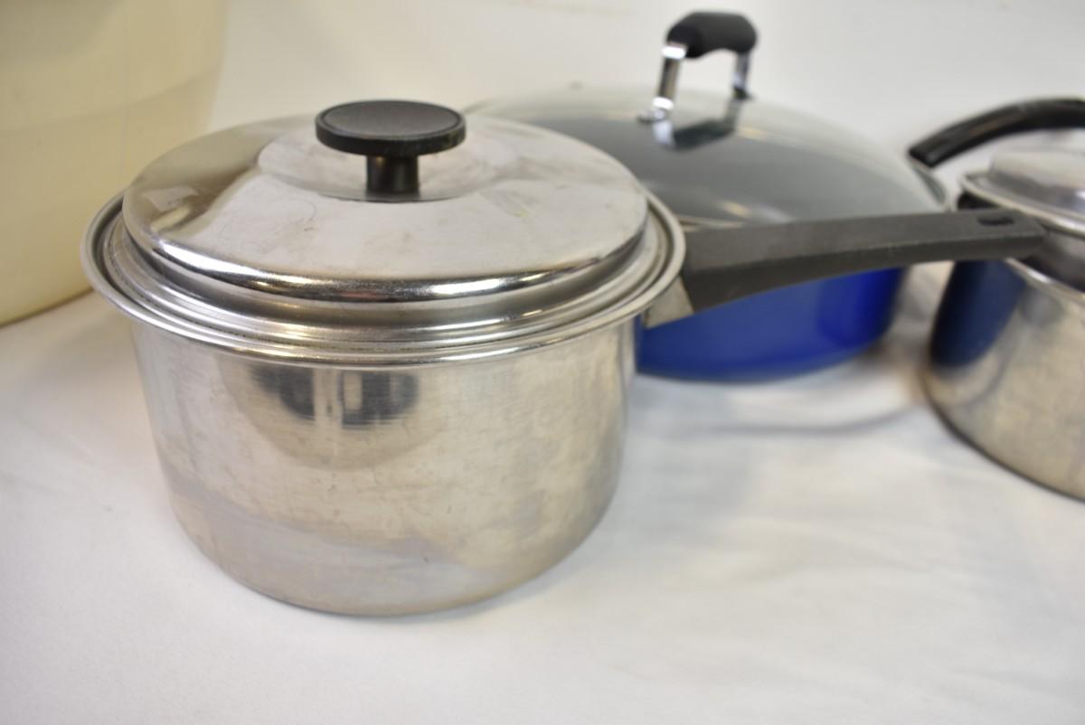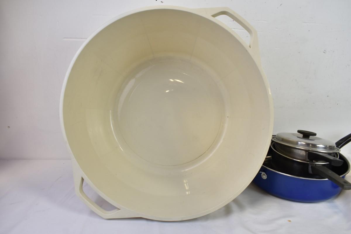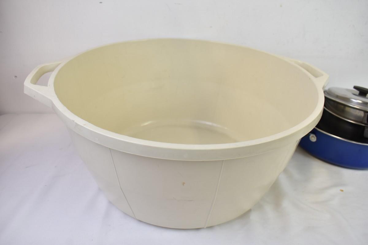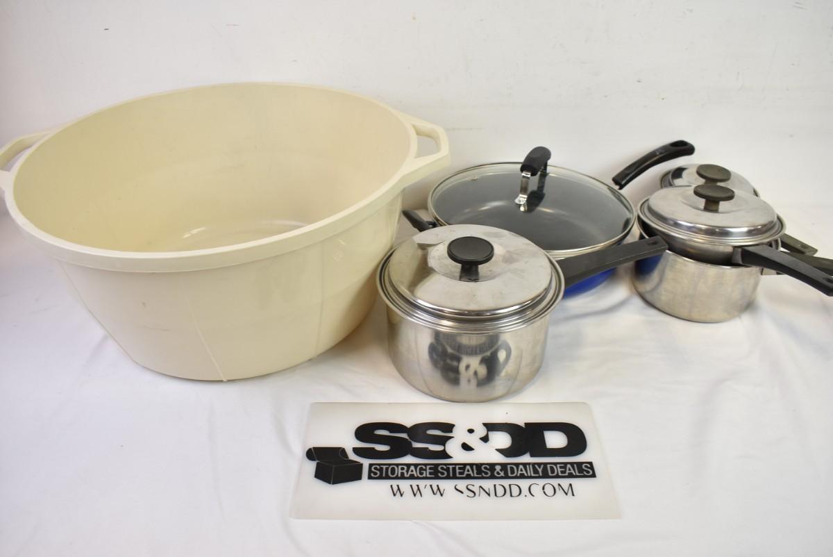 Kitchen Lot: 5 Pots/Pans, 4 Lids, Large Plastic Bowl/Tub