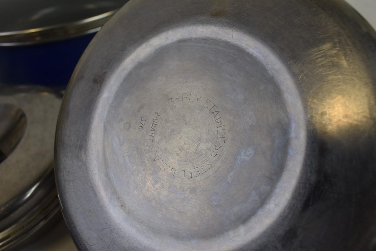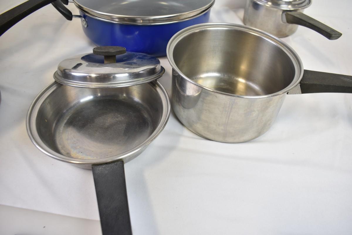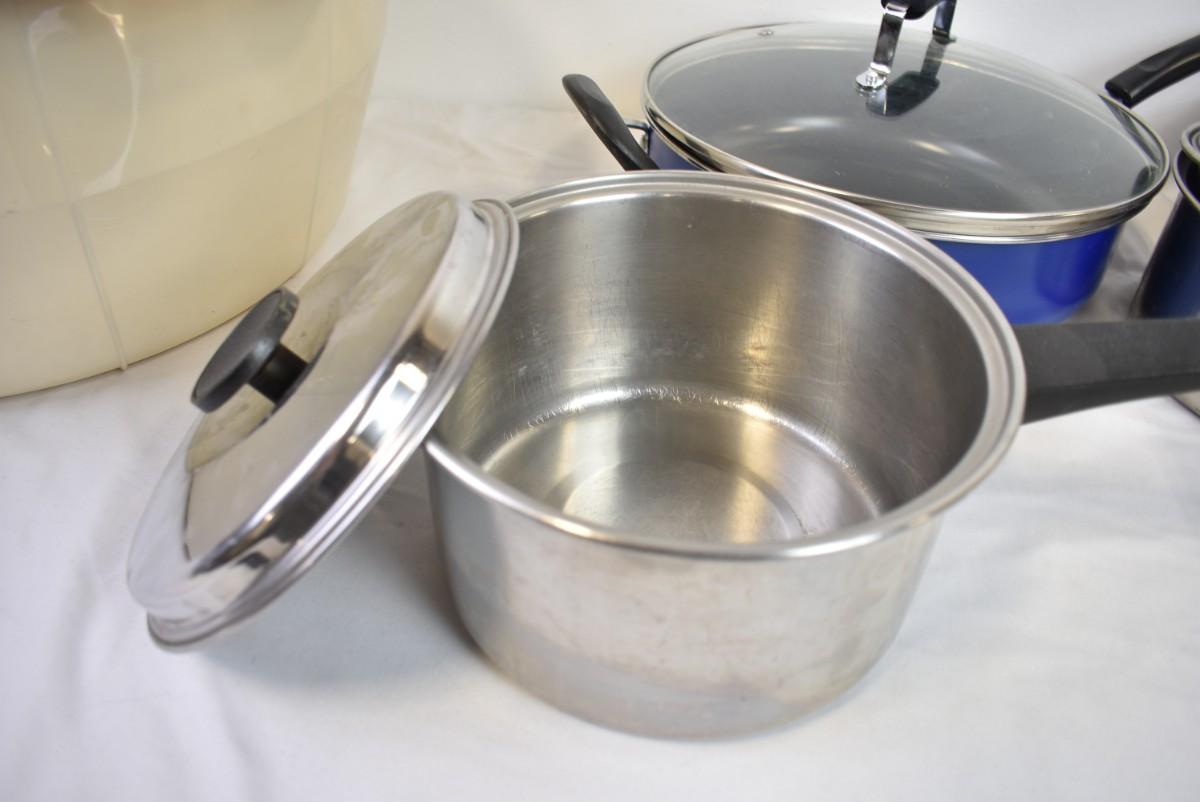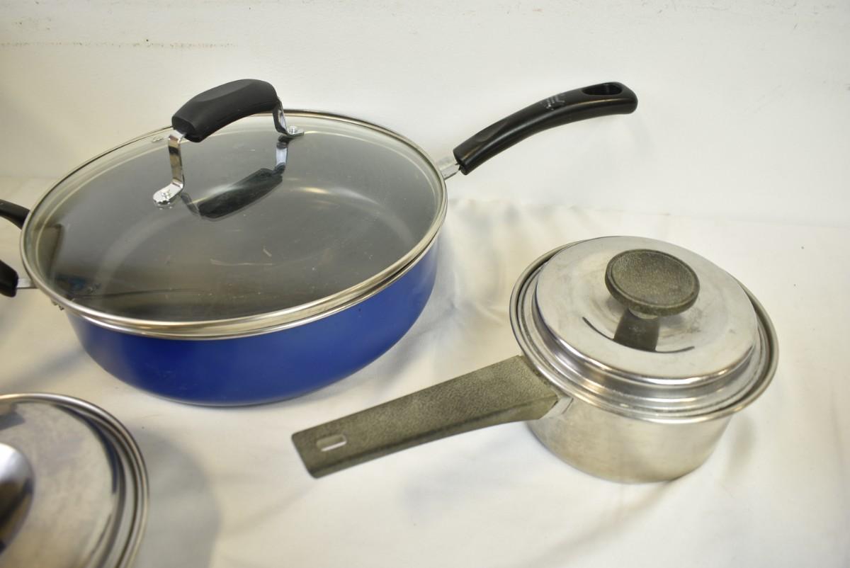 Kitchen Lot: 5 Pots/Pans, 4 Lids, Large Plastic Bowl/Tub