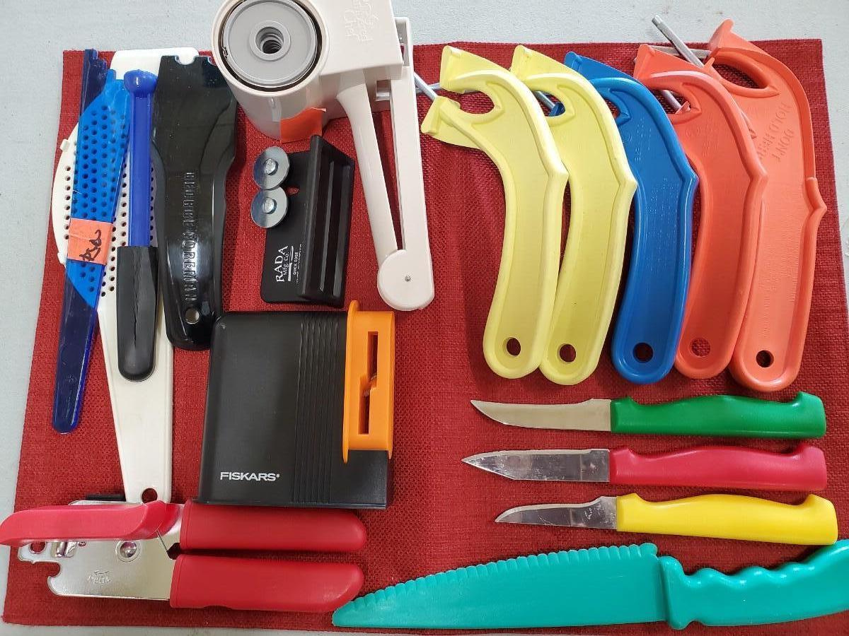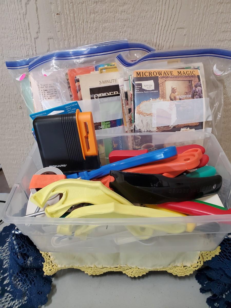 Tote filled with Misc sm kitchen utensils