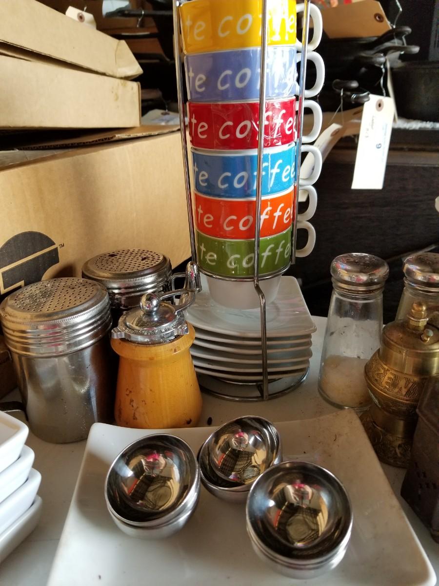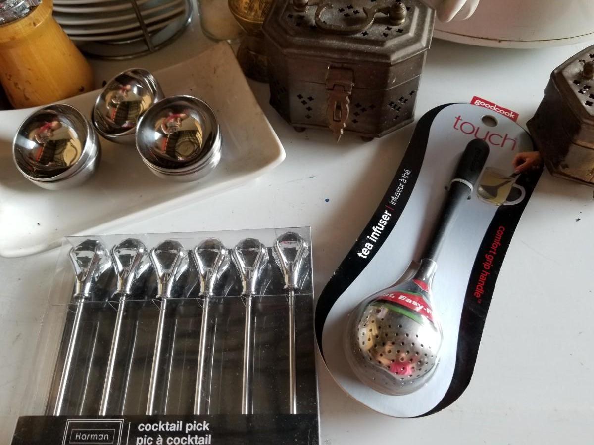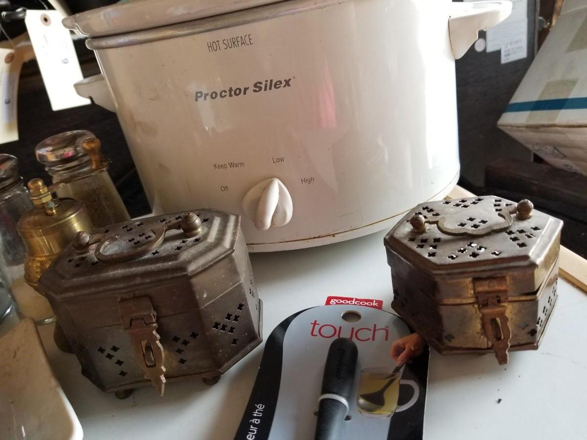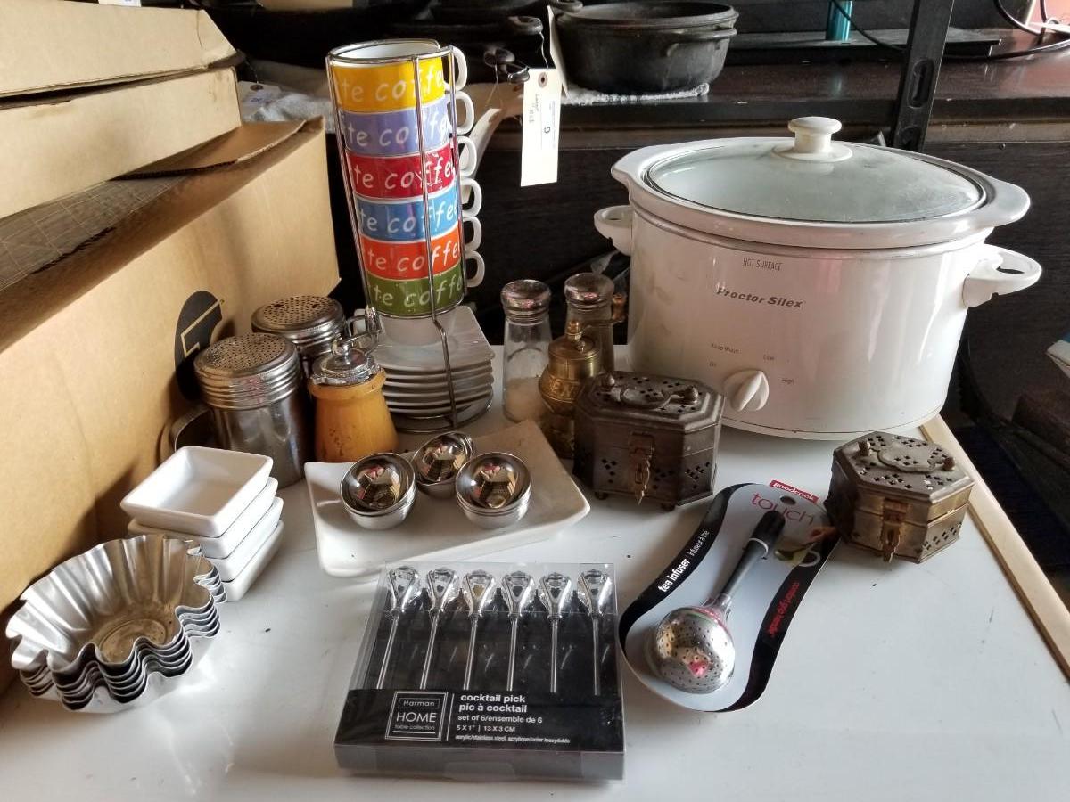 Tea cups, crock pot, and small kitchen items