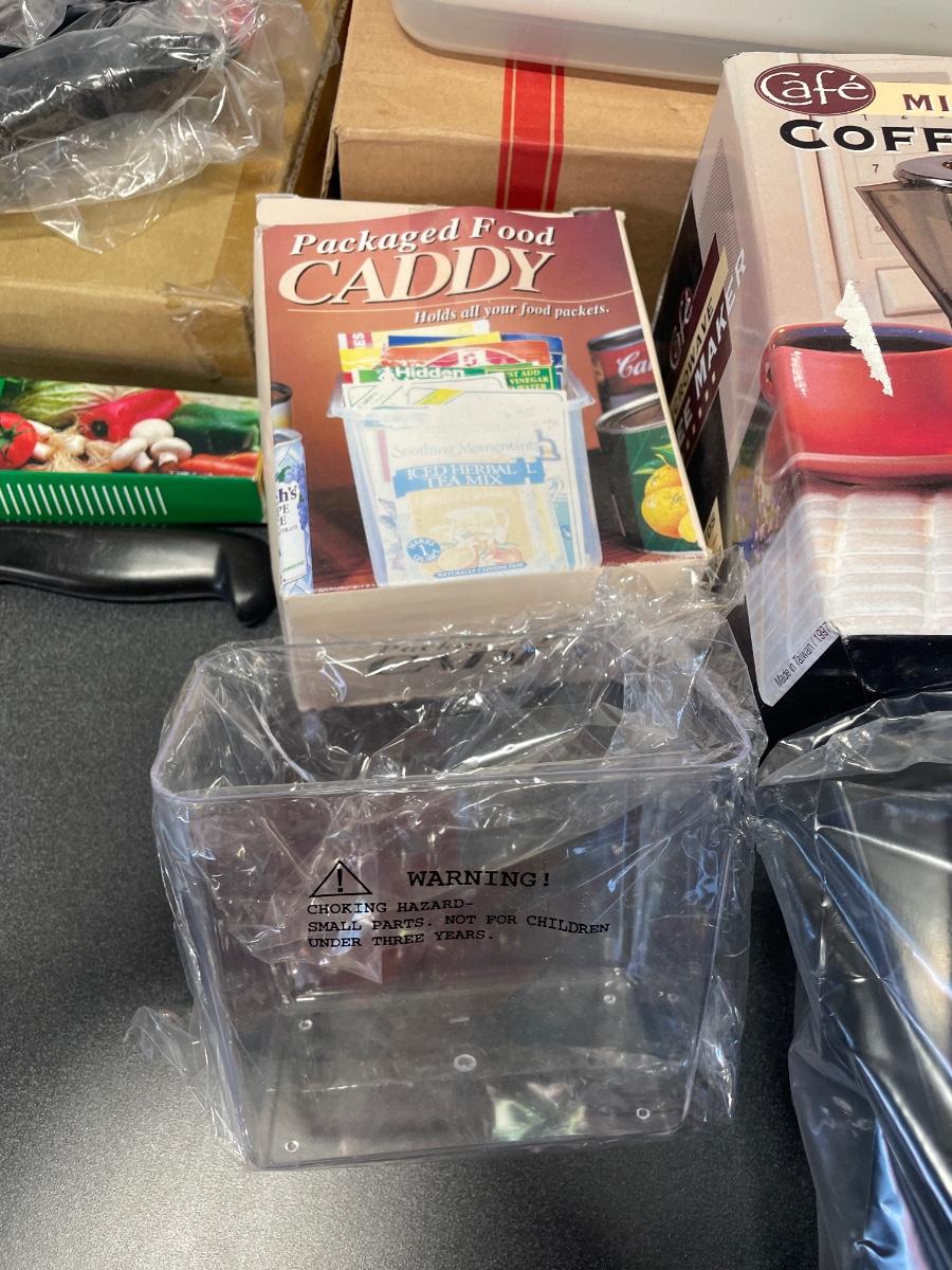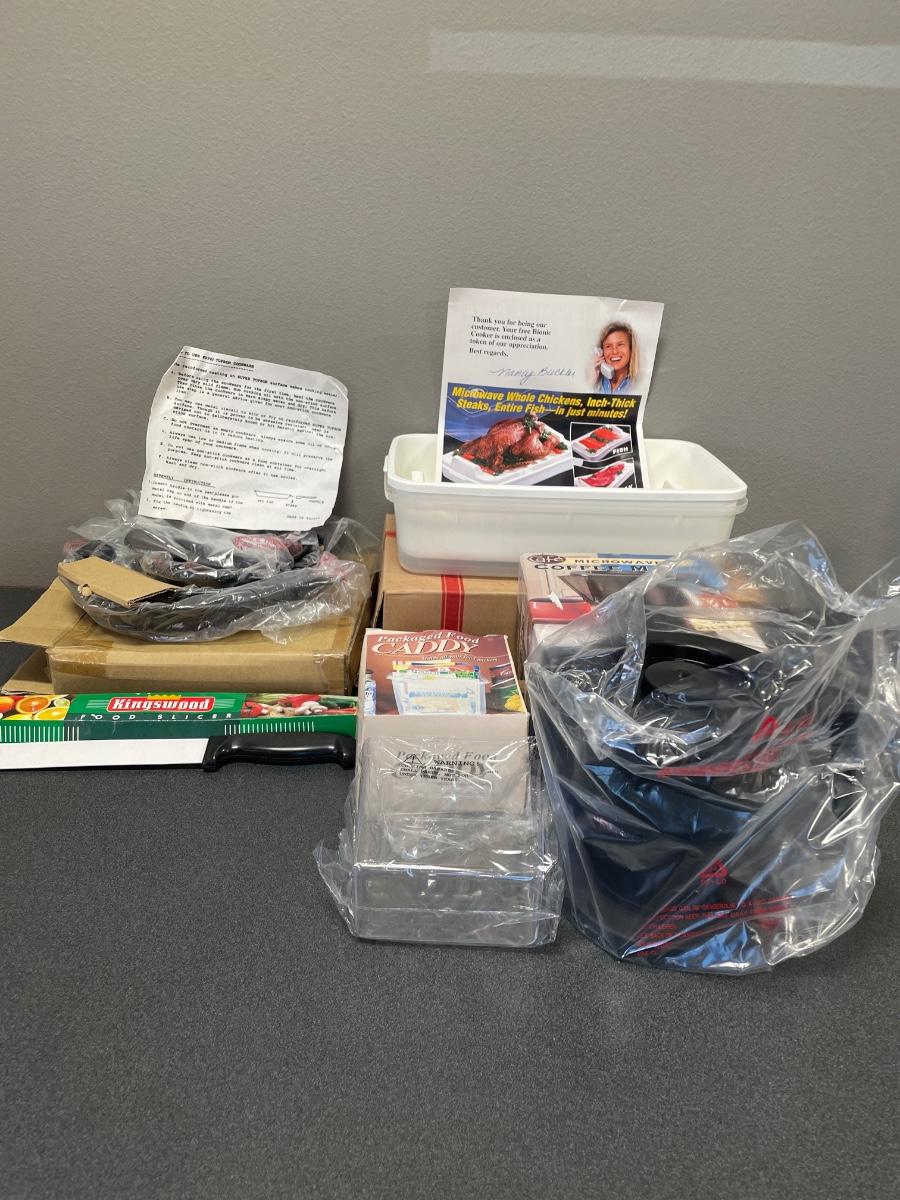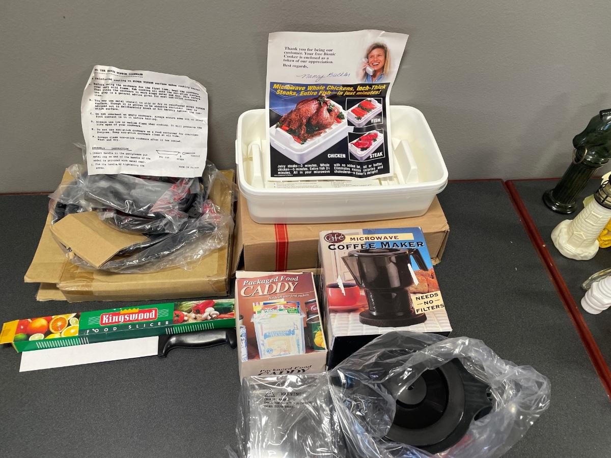 Includes food caddy, food slicer, microwave coffee maker, metal pan, and. Microwave tray to cook whole chickens, steak and fish in the microwave. All items new in box.