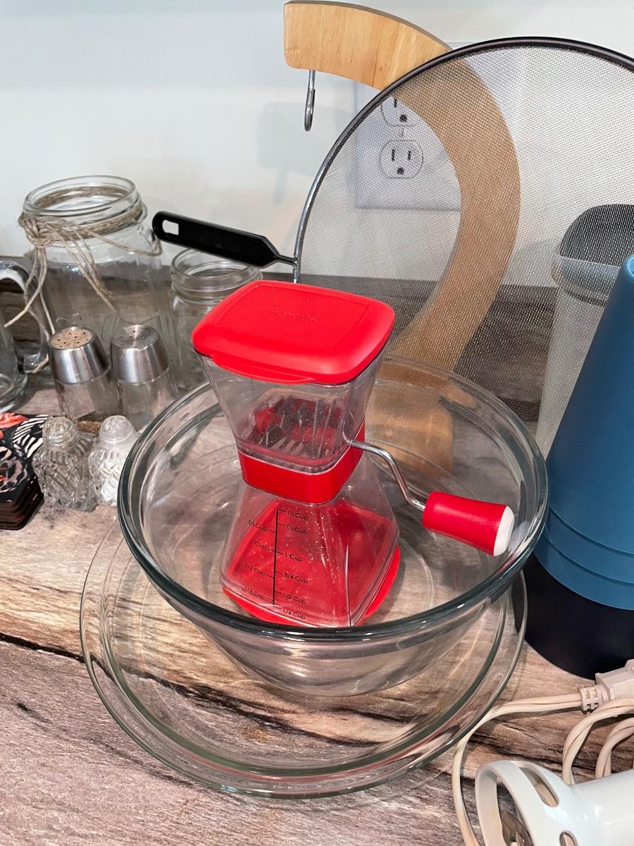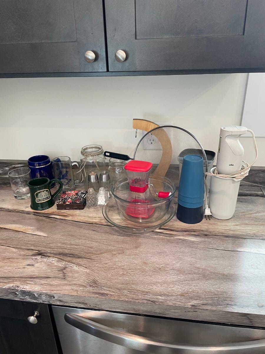 Blender works, splatter screen, banana stand, Pyrex bowl and pie plate, coasters, S&P etc