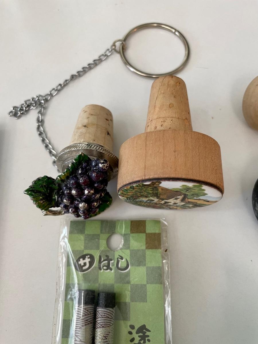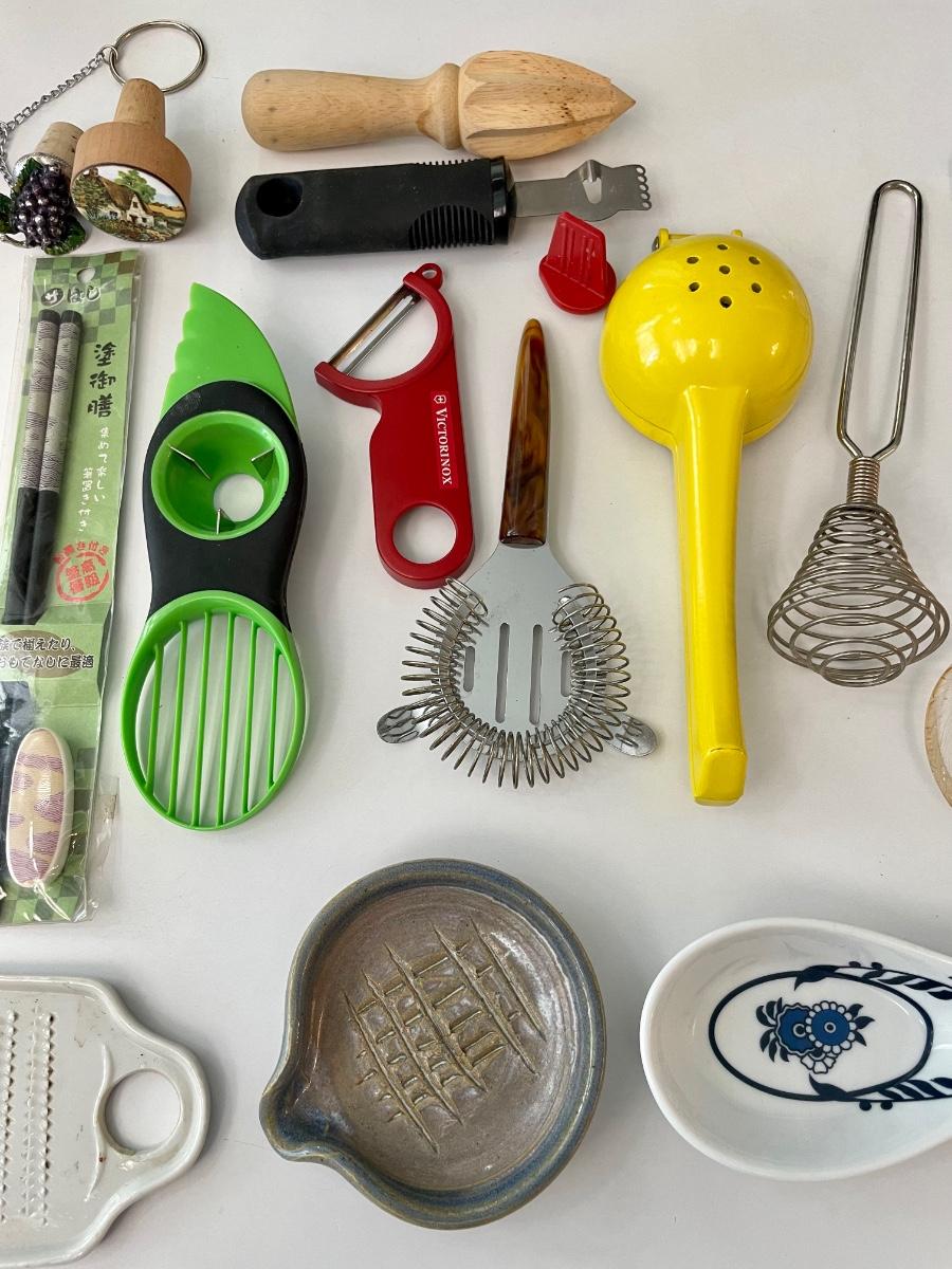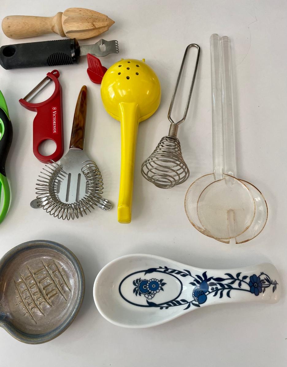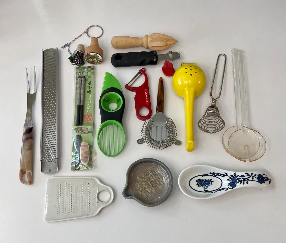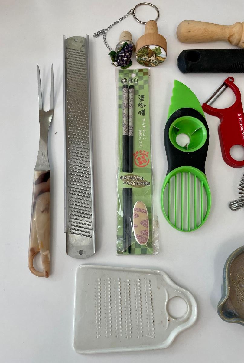 Kitchen gadget lot E: avocado peeler/scoop, wine bottle stoppers, sales serving tools, peeler, spoon rest, etc. 18 items in all.
