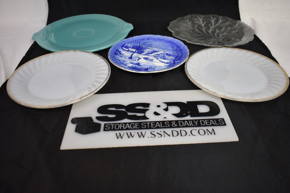 Kitchen Lot: Fiesta Ware Turquoise Platter, 2 Fire King Milk Glass Plates, Blue/White Decorative Plate, Clear Serving Plate