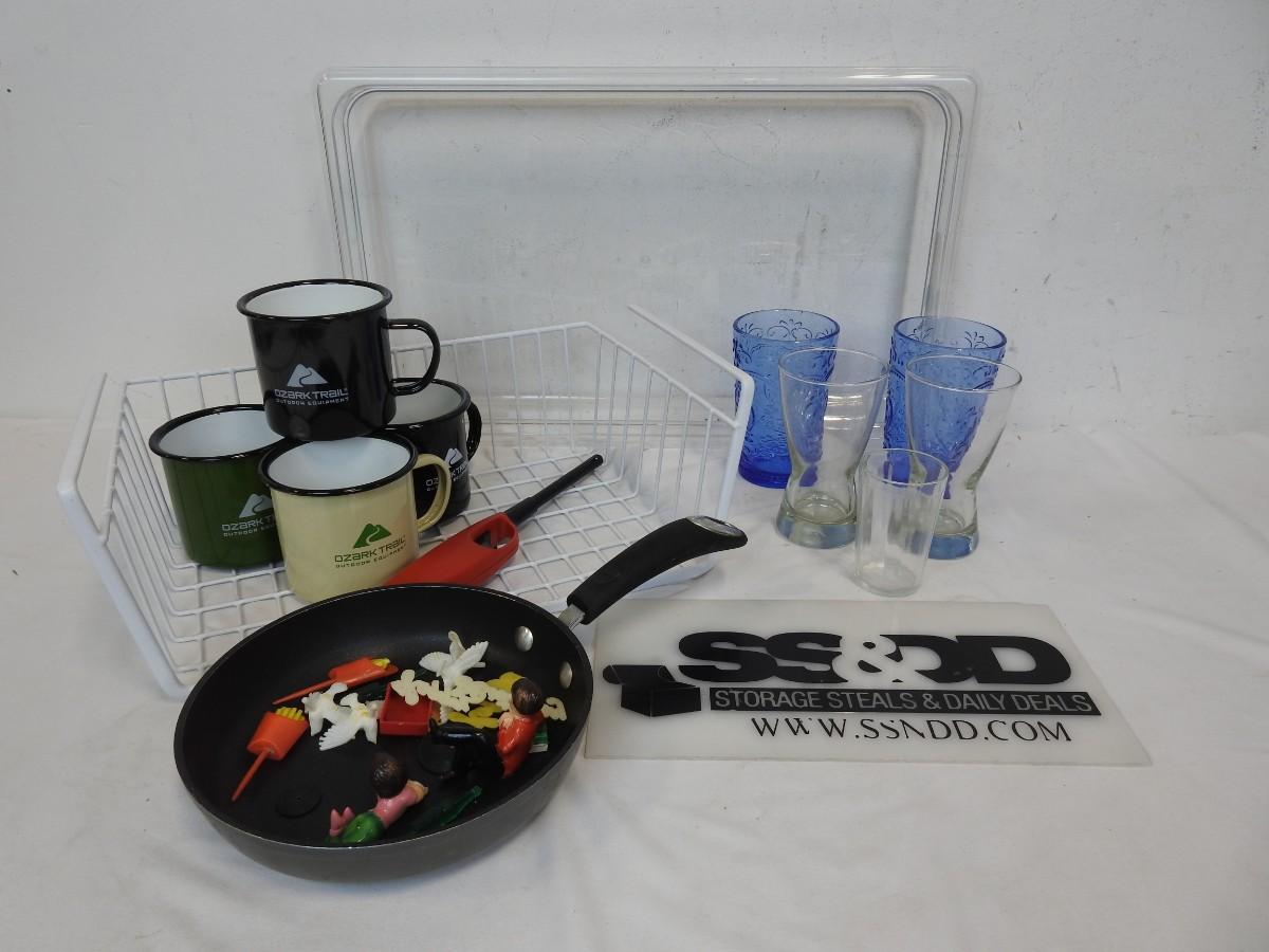Kitchen Lot: Large Tray, Shelf Rack, Glasses, Metal Mugs, Vintage-Cake Toppers