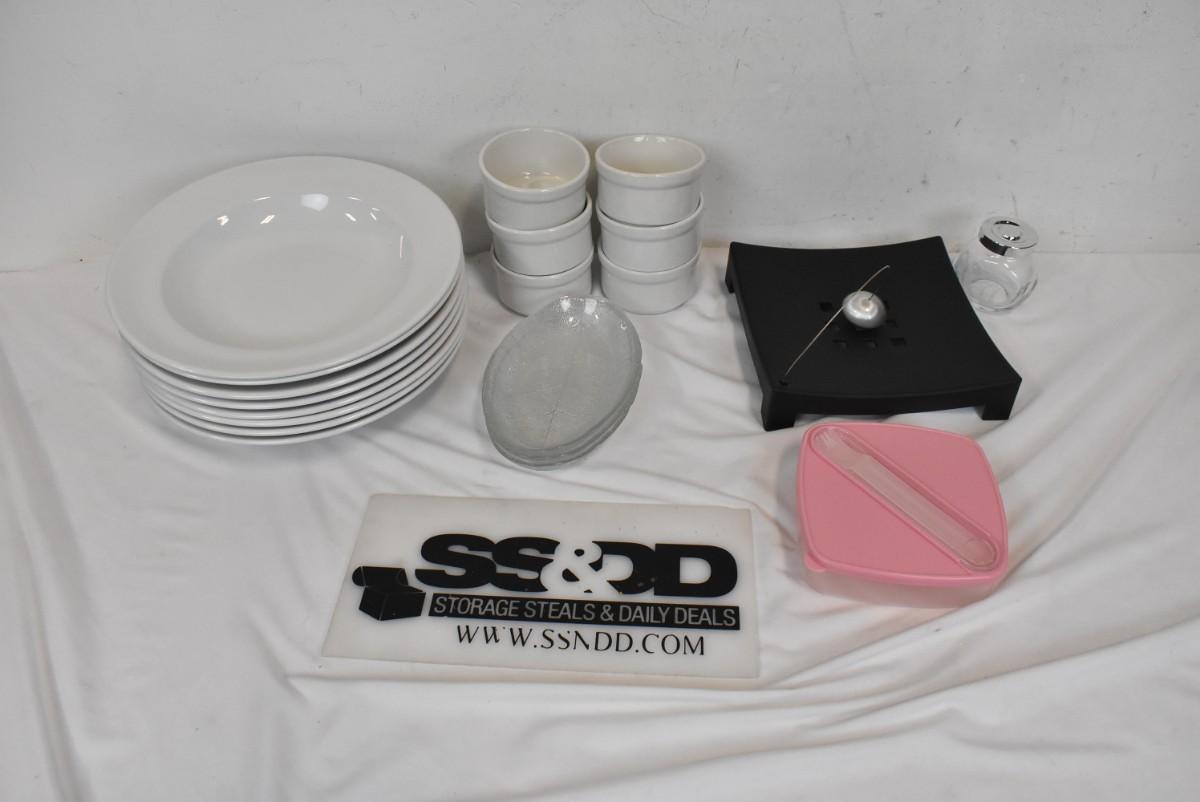 Kitchen Lot, Napkin Holder, Ramekins, Plastic Container, White Dishes