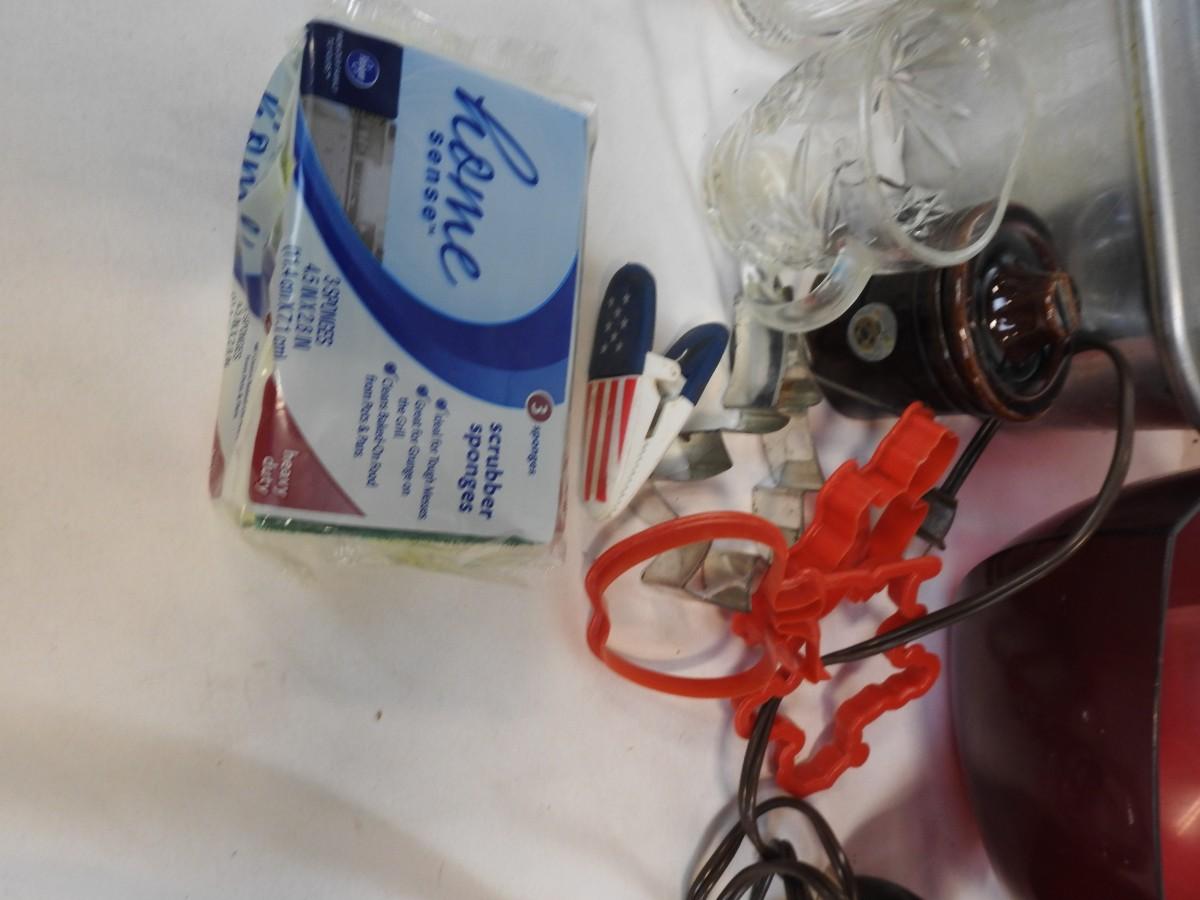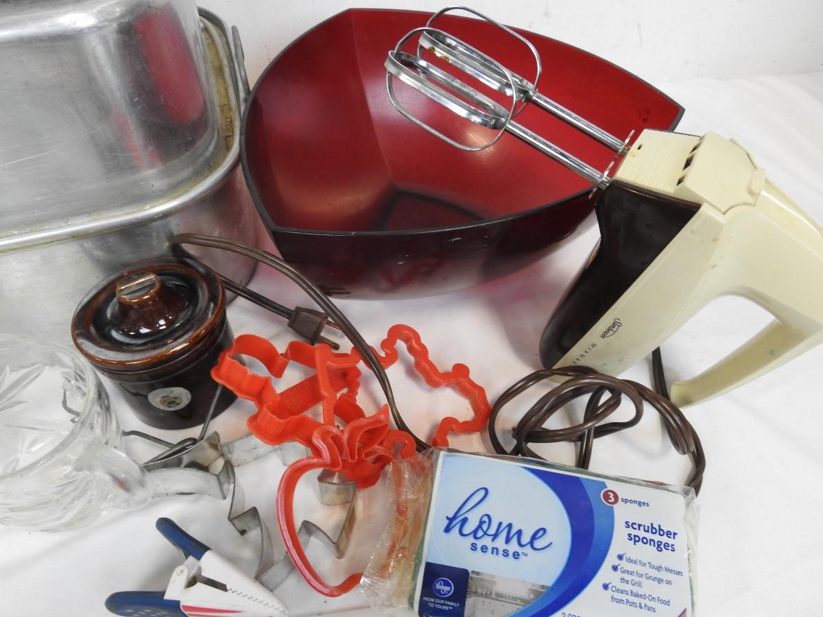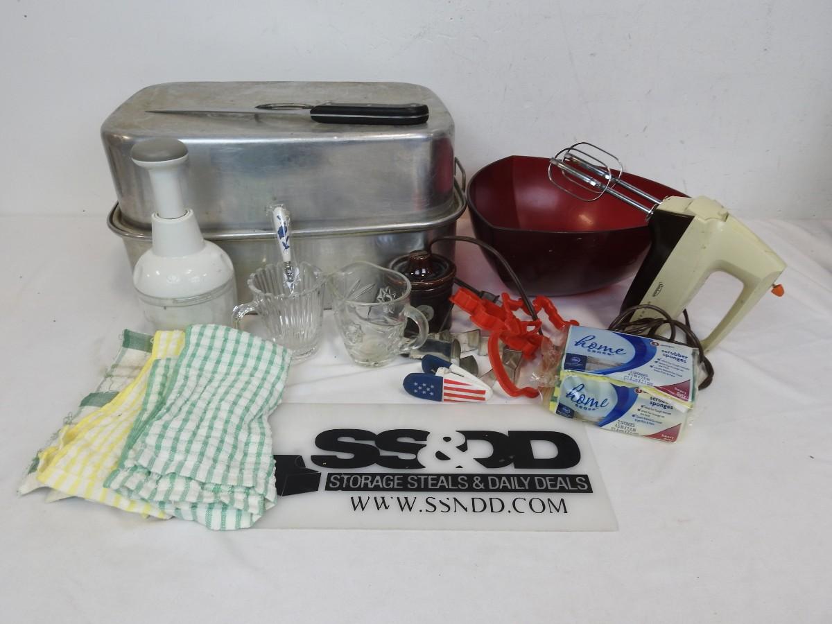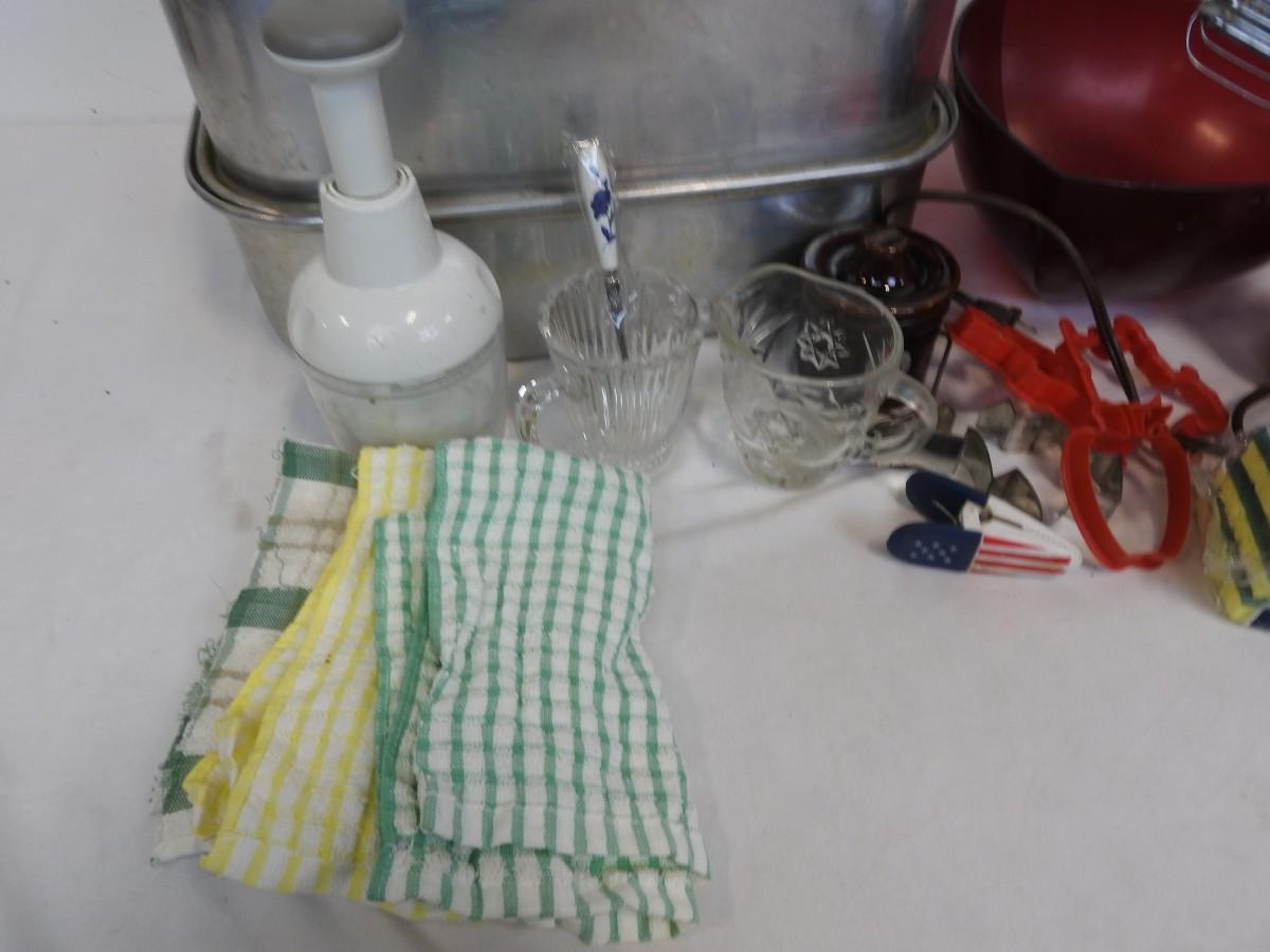 Kitchen Lot: Roasting Pan, Tupperware Bowl, Pampered Chef Chopper, Mixer, Cookie Cutters, Dish Cloths