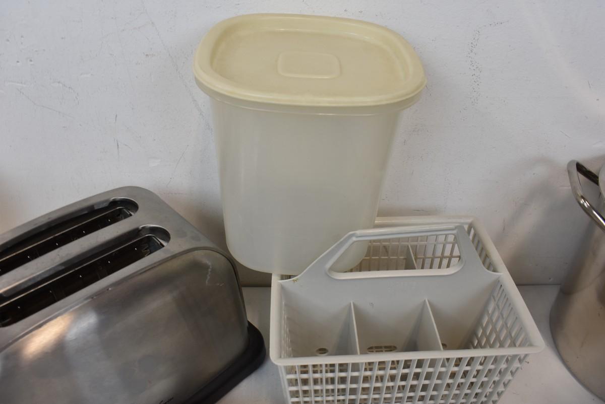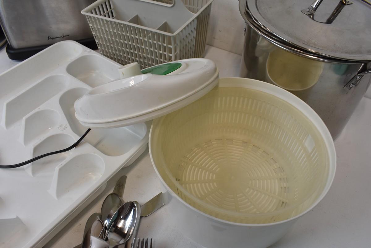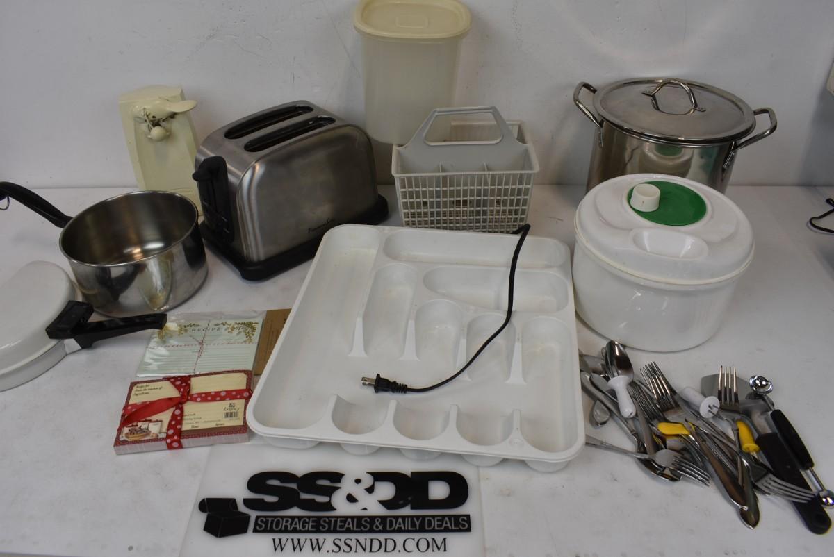 Kitchen Lot, Toaster, Cooking Pot, Flatware, Electric Can Opener, Salad Spinner