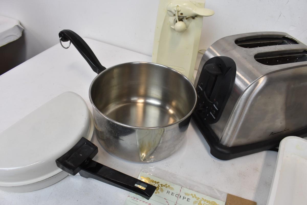 Kitchen Lot, Toaster, Cooking Pot, Flatware, Electric Can Opener, Salad Spinner, Recipe Cards