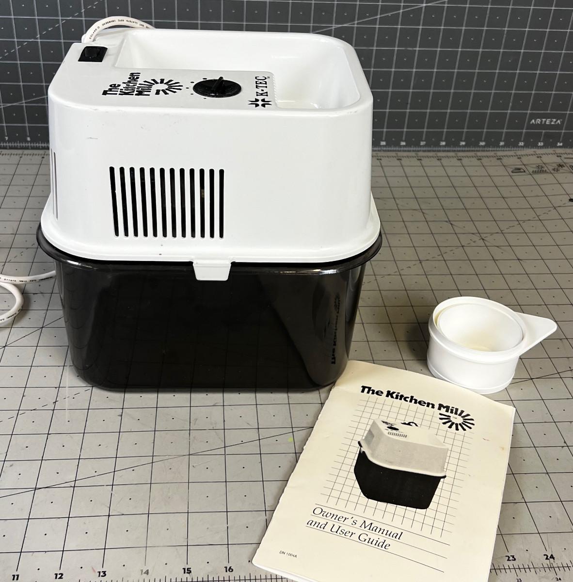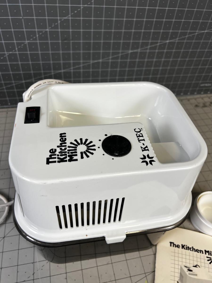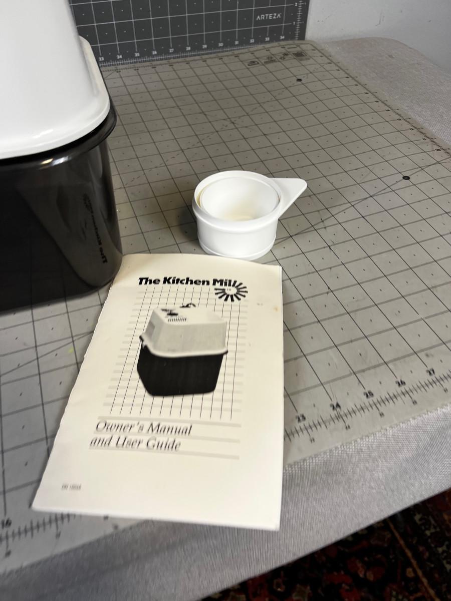 Has a measuring cup and a users manual. Works. Good Condition. Powers up!