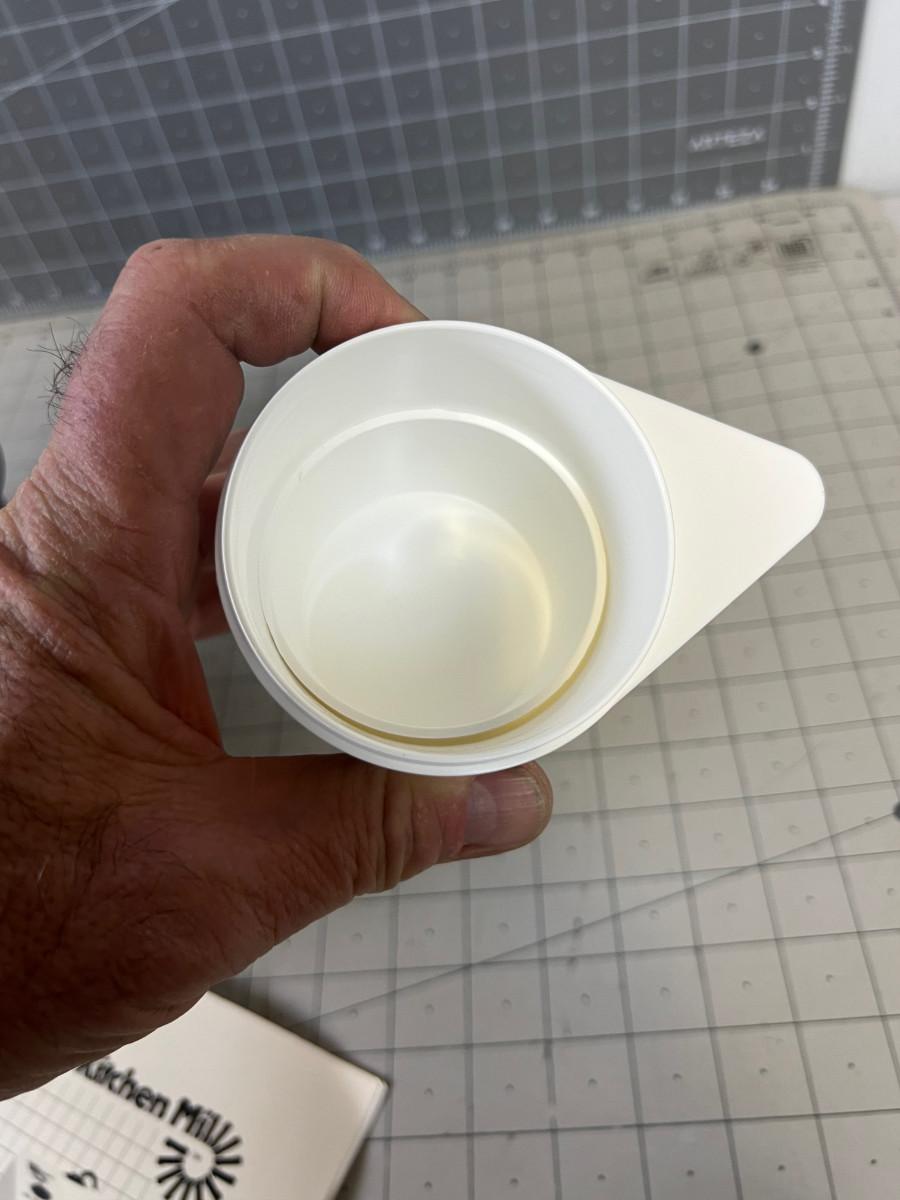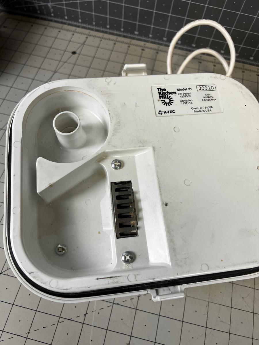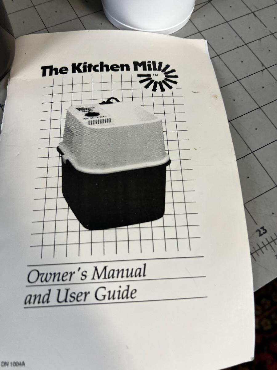 Has a measuring cup and a users manual. Works. Good Condition. Powers up!