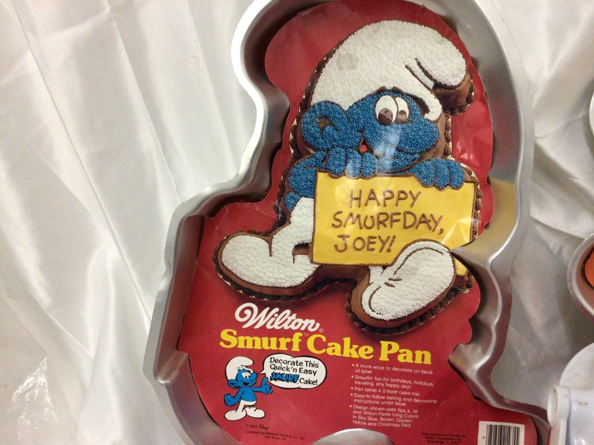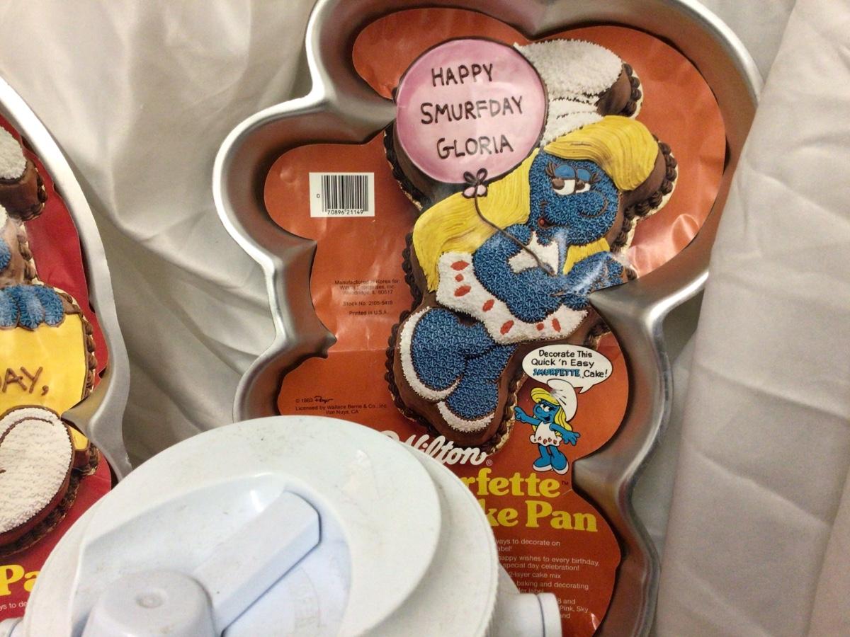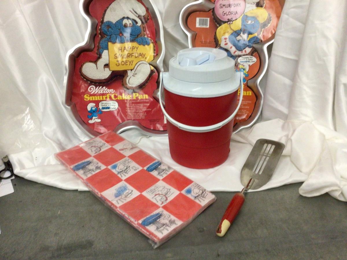 You get two Smurf cake pans, red handle spatula, red white drink cooler, and table cloth.