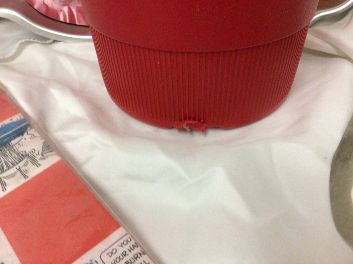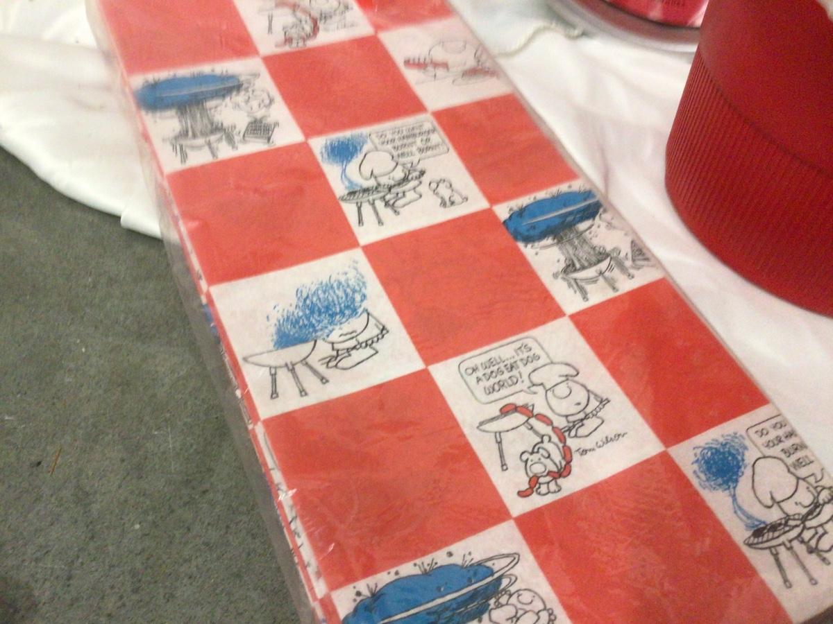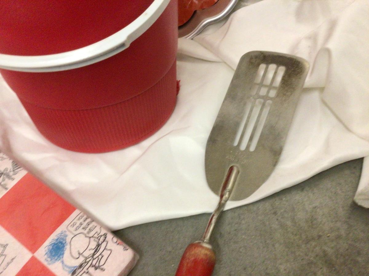 You get two Smurf cake pans, red handle spatula, red white drink cooler, and table cloth.
