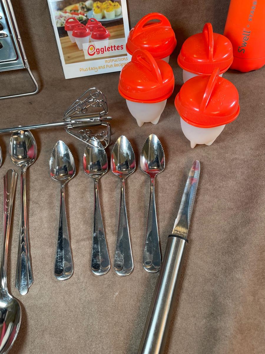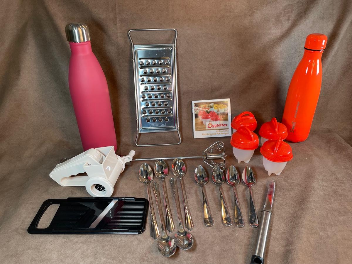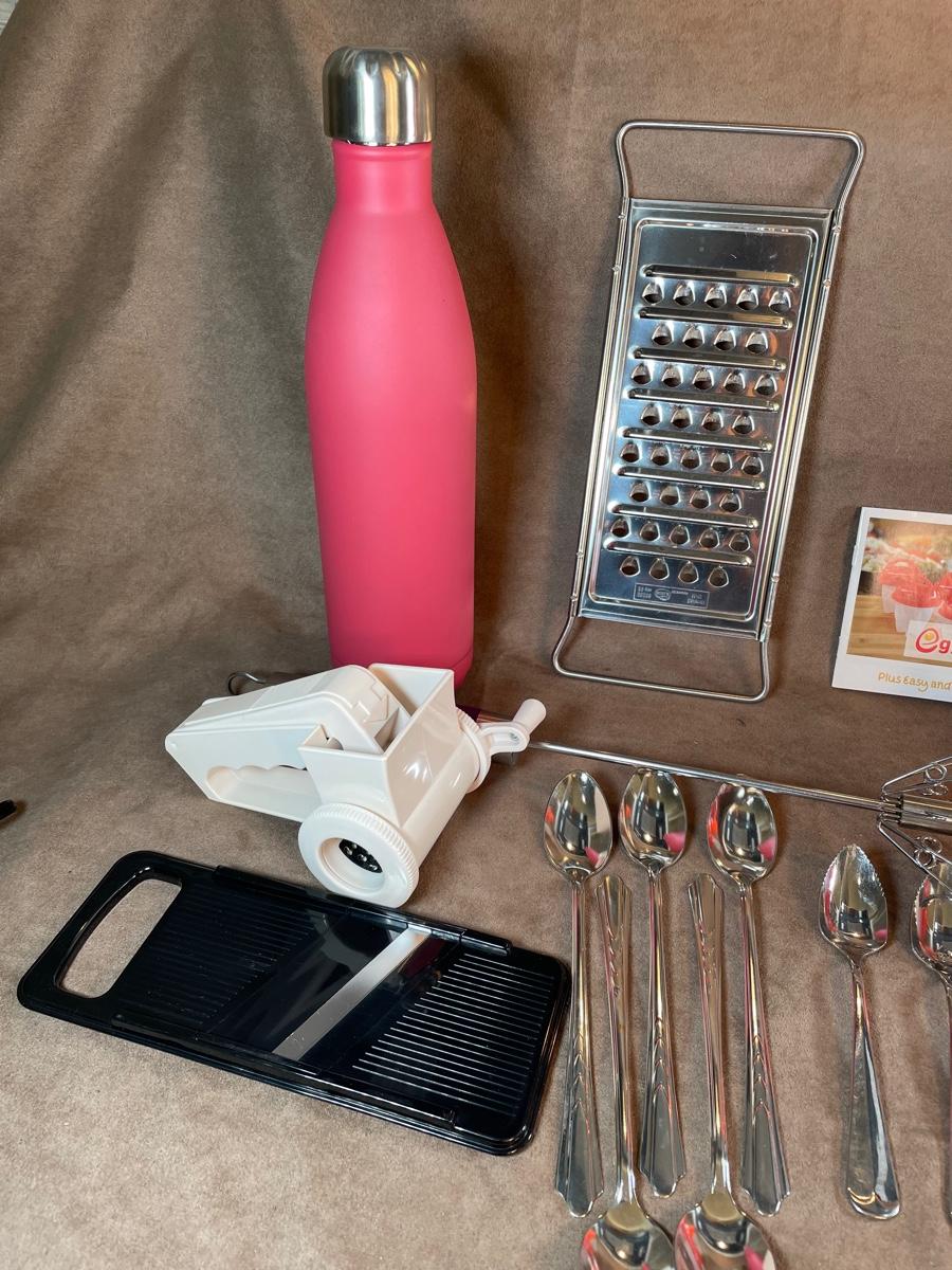 Two Swell thermal bottles, metal grater, set of 5 iced tea spoons, rotary cheese grater, slicer, grapefruit spoons and knife, wish and a set of 4 "Egglettes" (microwave egg cookers)