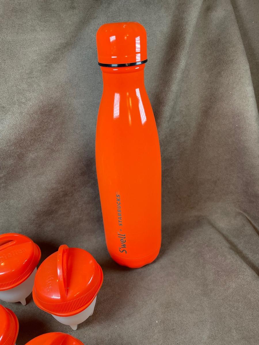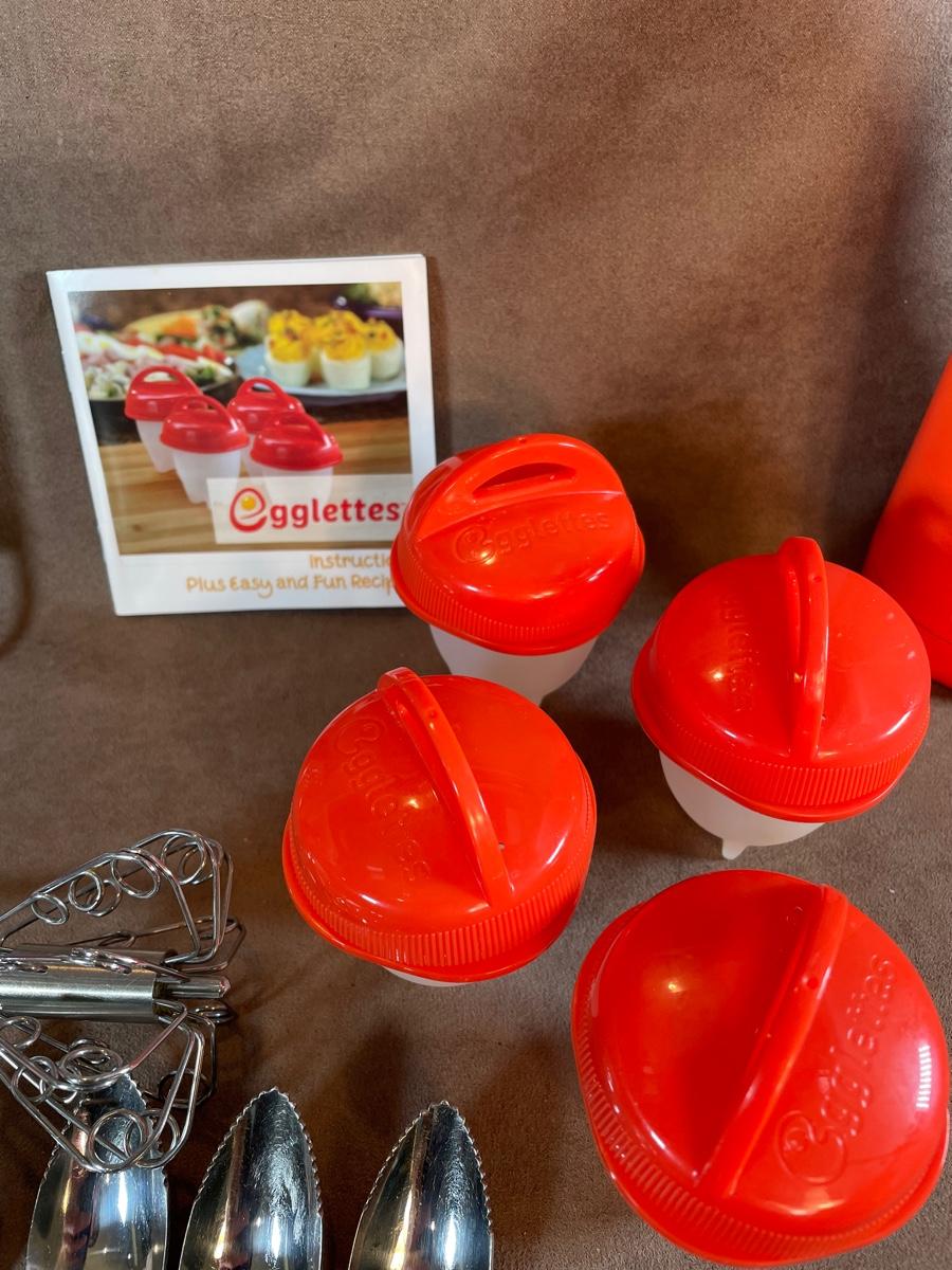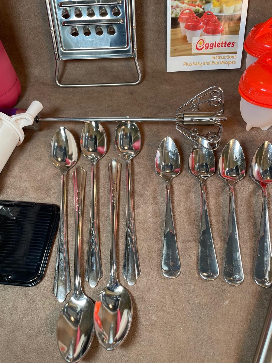 Two Swell thermal bottles, metal grater, set of 5 iced tea spoons, rotary cheese grater, slicer, grapefruit spoons and knife, wish and a set of 4 "Egglettes" (microwave egg cookers)